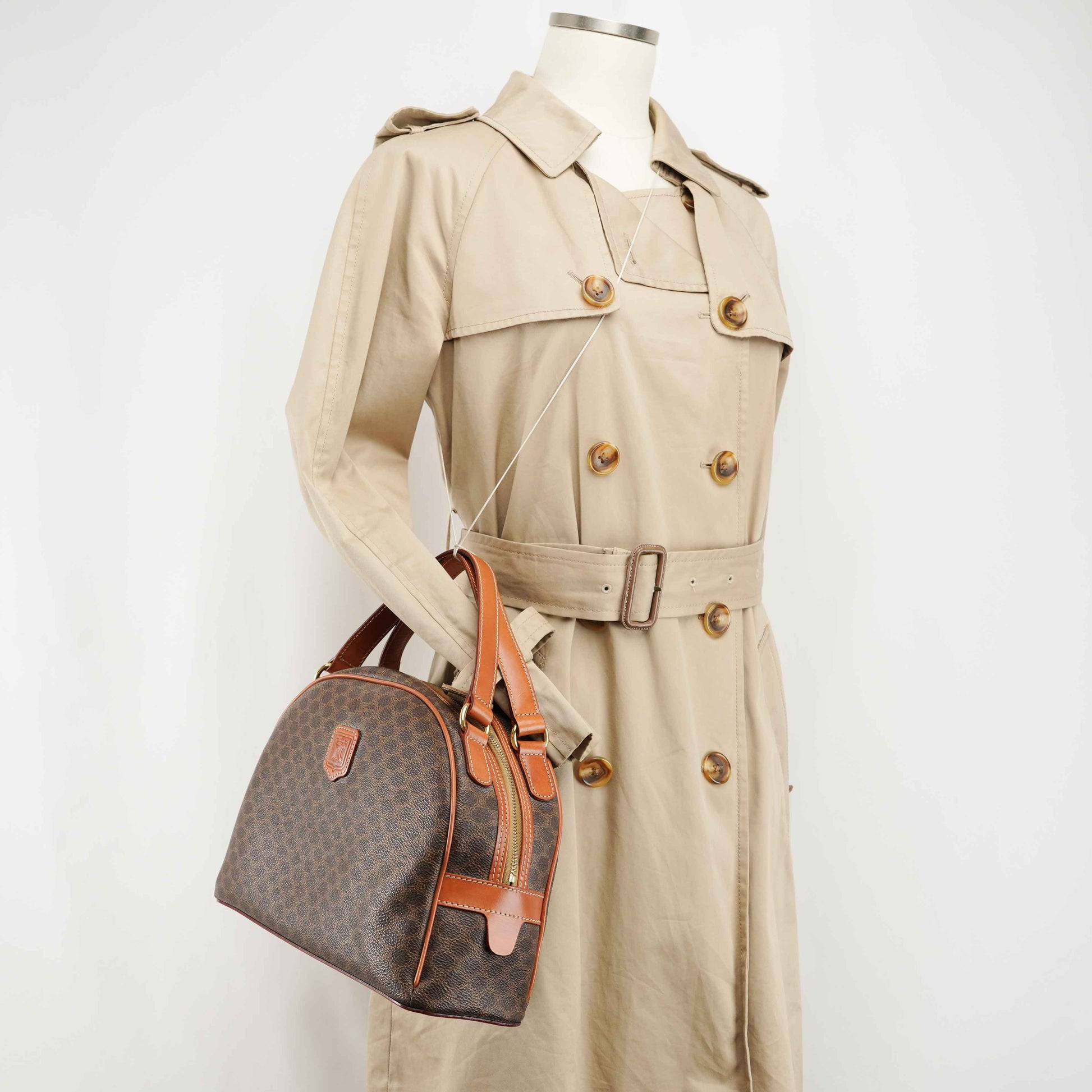 This classic Céline Boston bag exudes timeless elegance with its structured silhouette and refined details. Crafted from the brand’s iconic Macadam-coated canvas in a rich brown hue, it features tan leather trim and gold-tone hardware, adding a sophisticated touch to the piece. The front showcases the Céline emblem, accentuating the luxury appeal.
