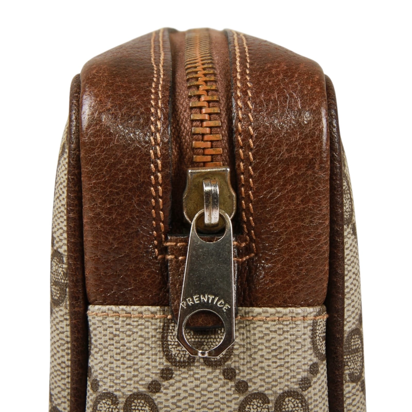 This is a vintage Gucci accessories collection navy leather trim and GG monogram canvas cosmetic bag. The zip closure opens to a single main interior compartment.
