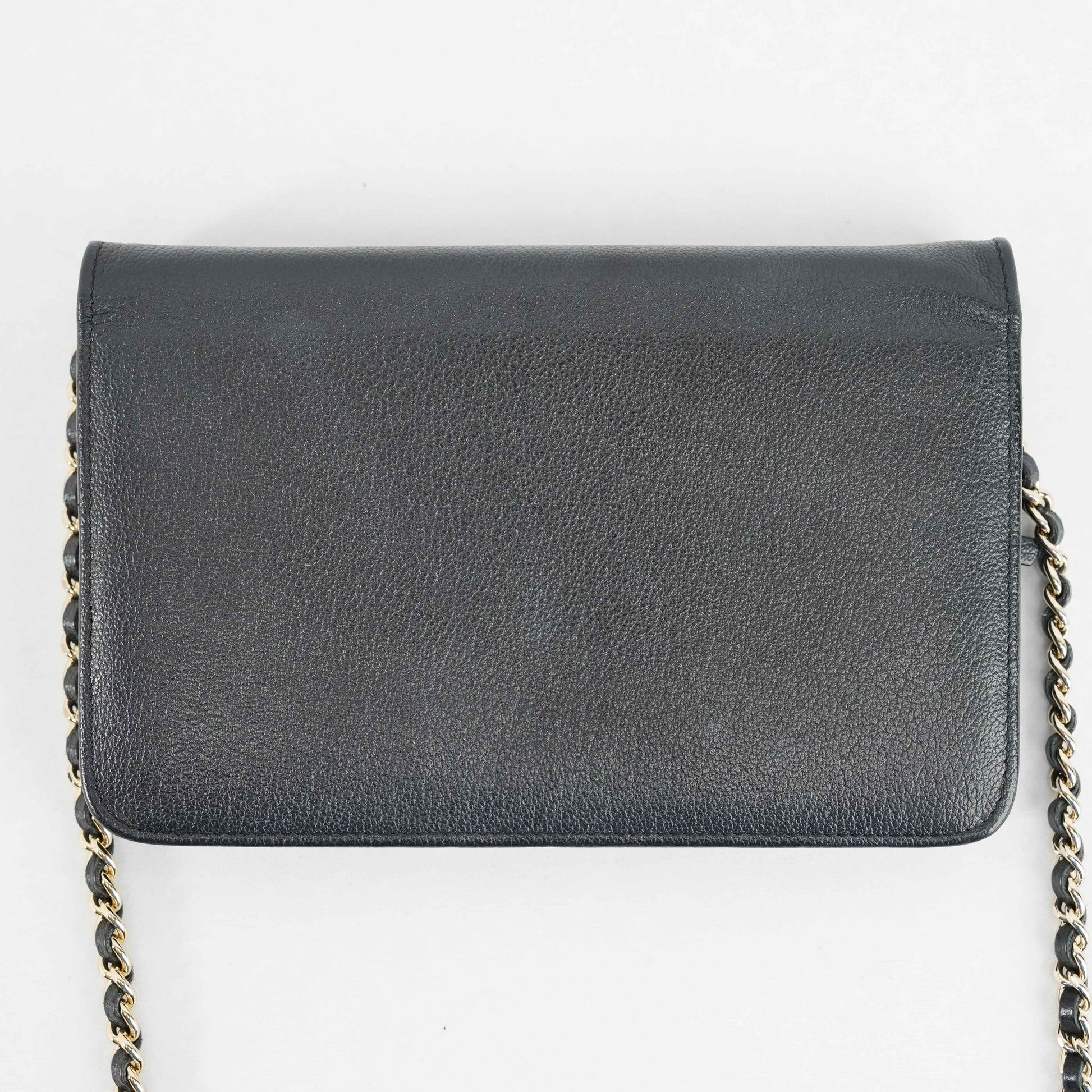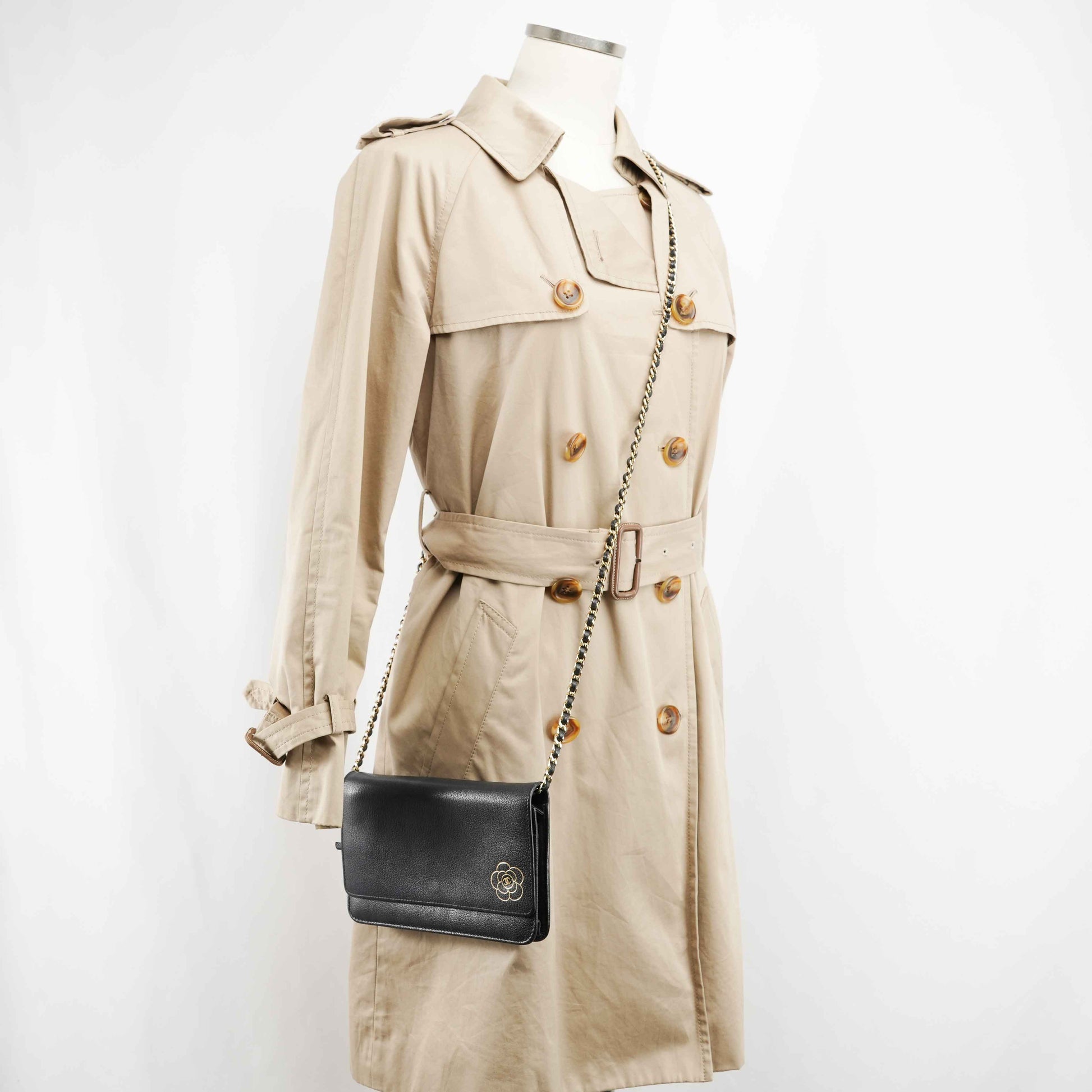 Elevate your essentials with this exquisite Chanel Wallet on Chain, a perfect fusion of elegance and functionality. Crafted from supple black lambskin leather, this piece features a refined, structured silhouette accented by the iconic gold-tone camellia flower with interlocking CC logo detail—a symbol of Chanel's enduring femininity.