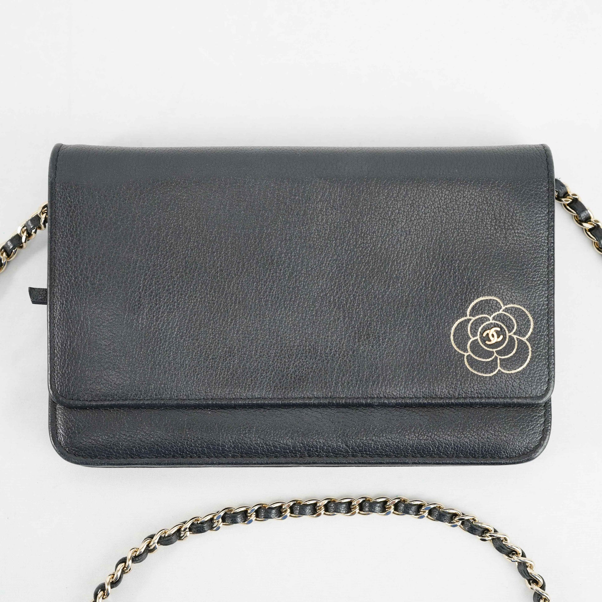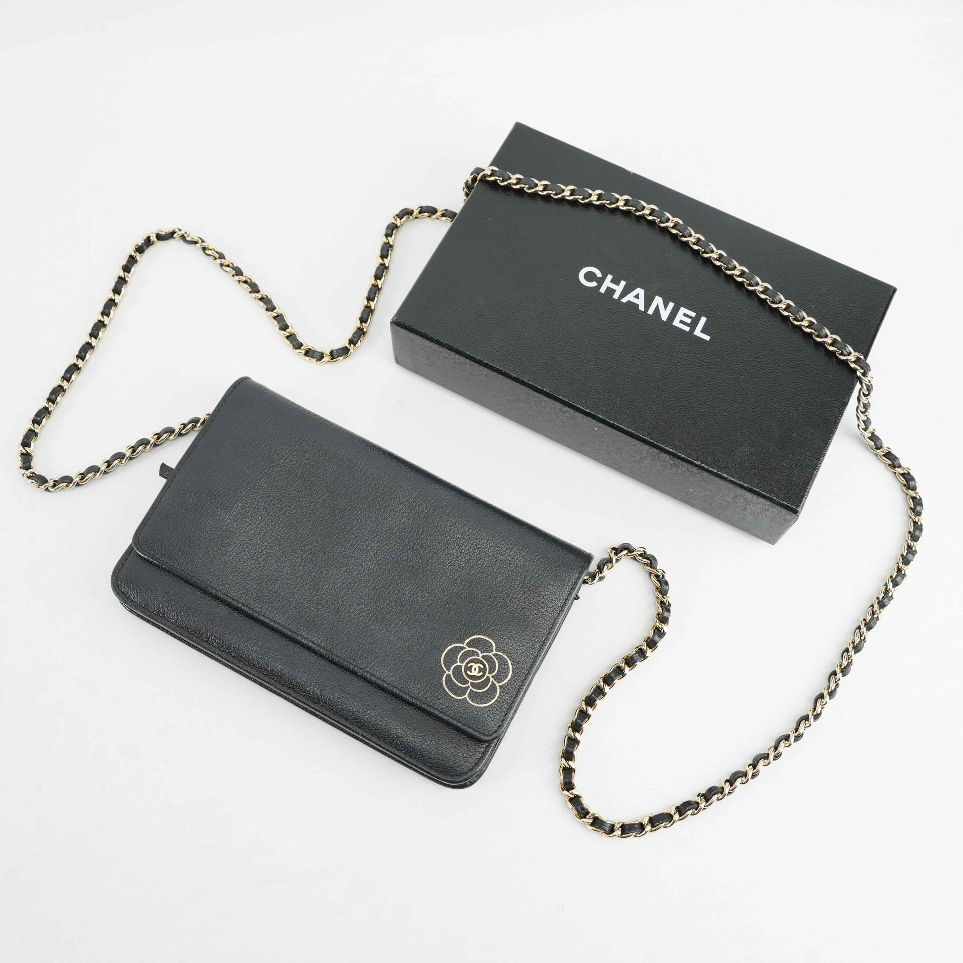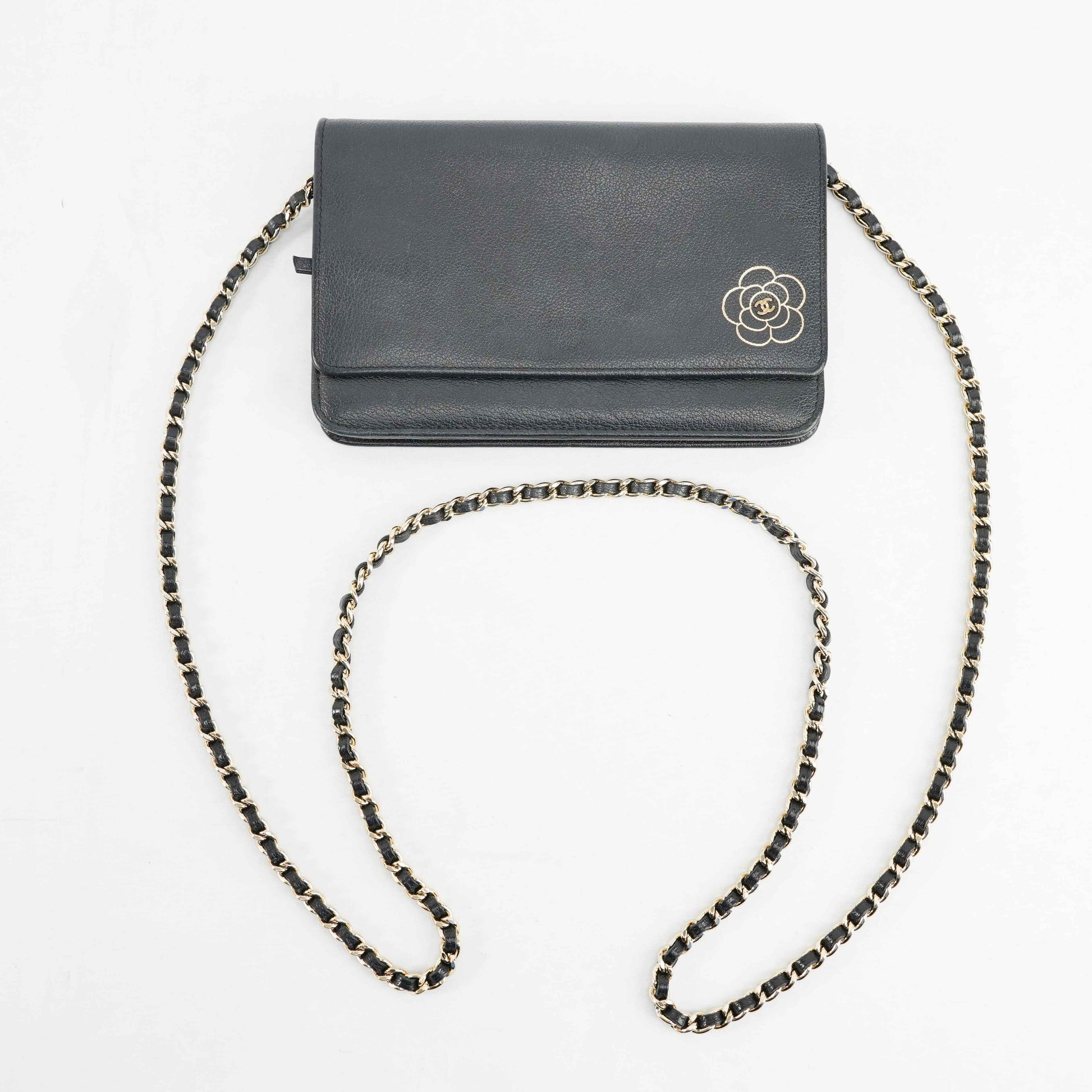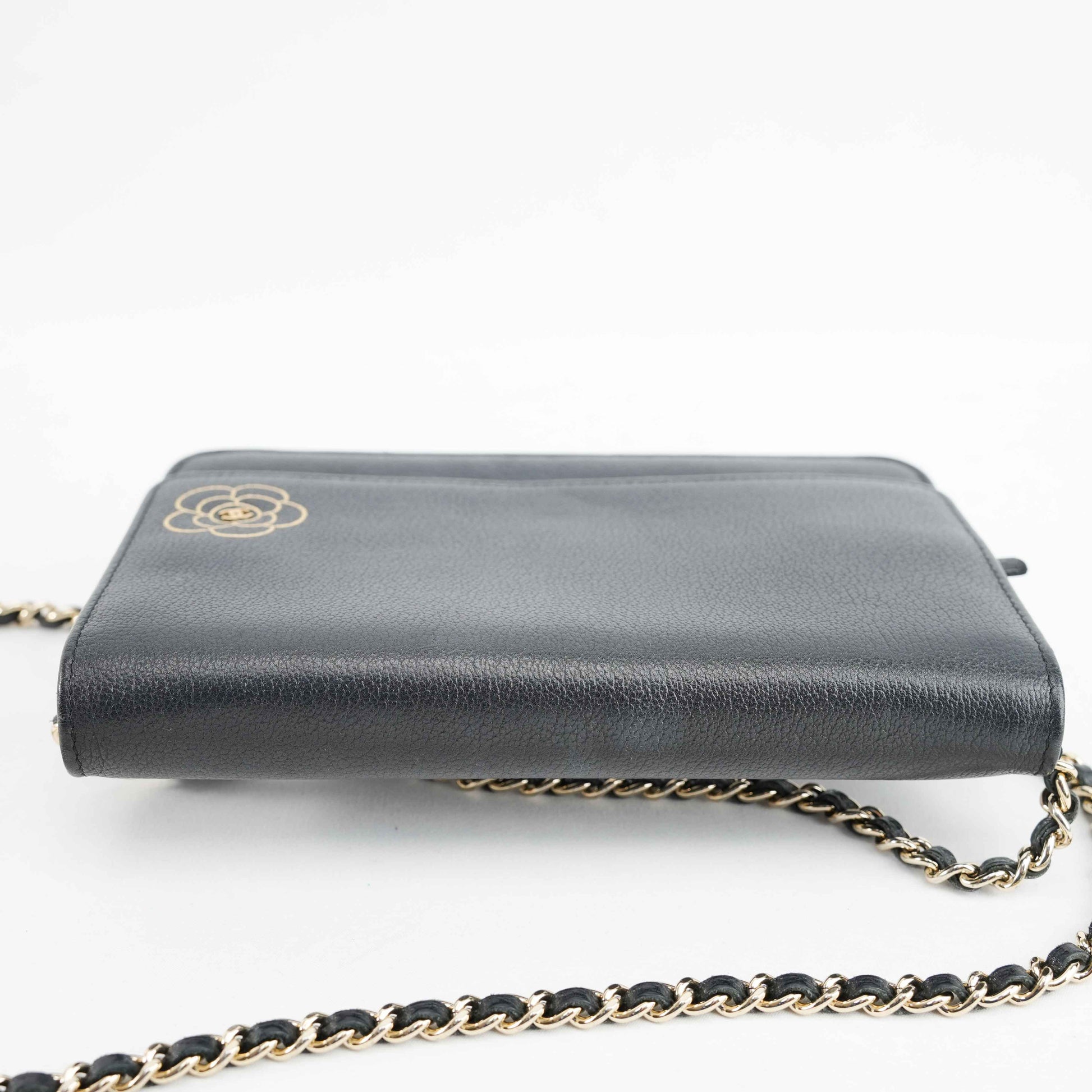 Chanel Camellia Motif Wallet on Chain Black Lambskin Leather Crossbody Bag