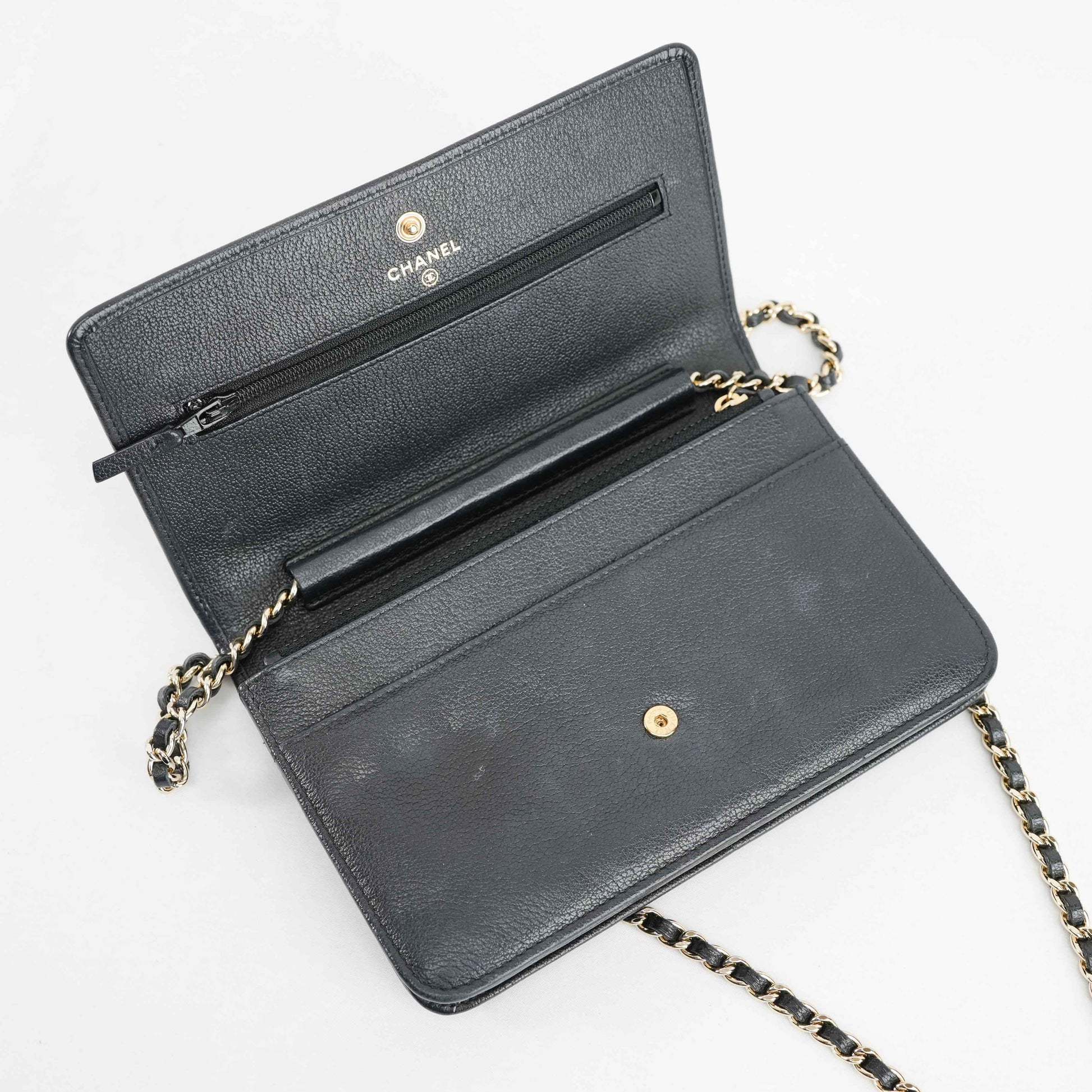 This Camellia Motif Wallet on Chain by Chanel is in great condition. The exterior leather is in great condition with no hard damage. The base corners look good with minimal rubbing. The hardware is bright and shiny. The strap is in good condition. The interior lining is clean with no damage and only slight signs of gentle use. The zipper and snap closures function perfectly.