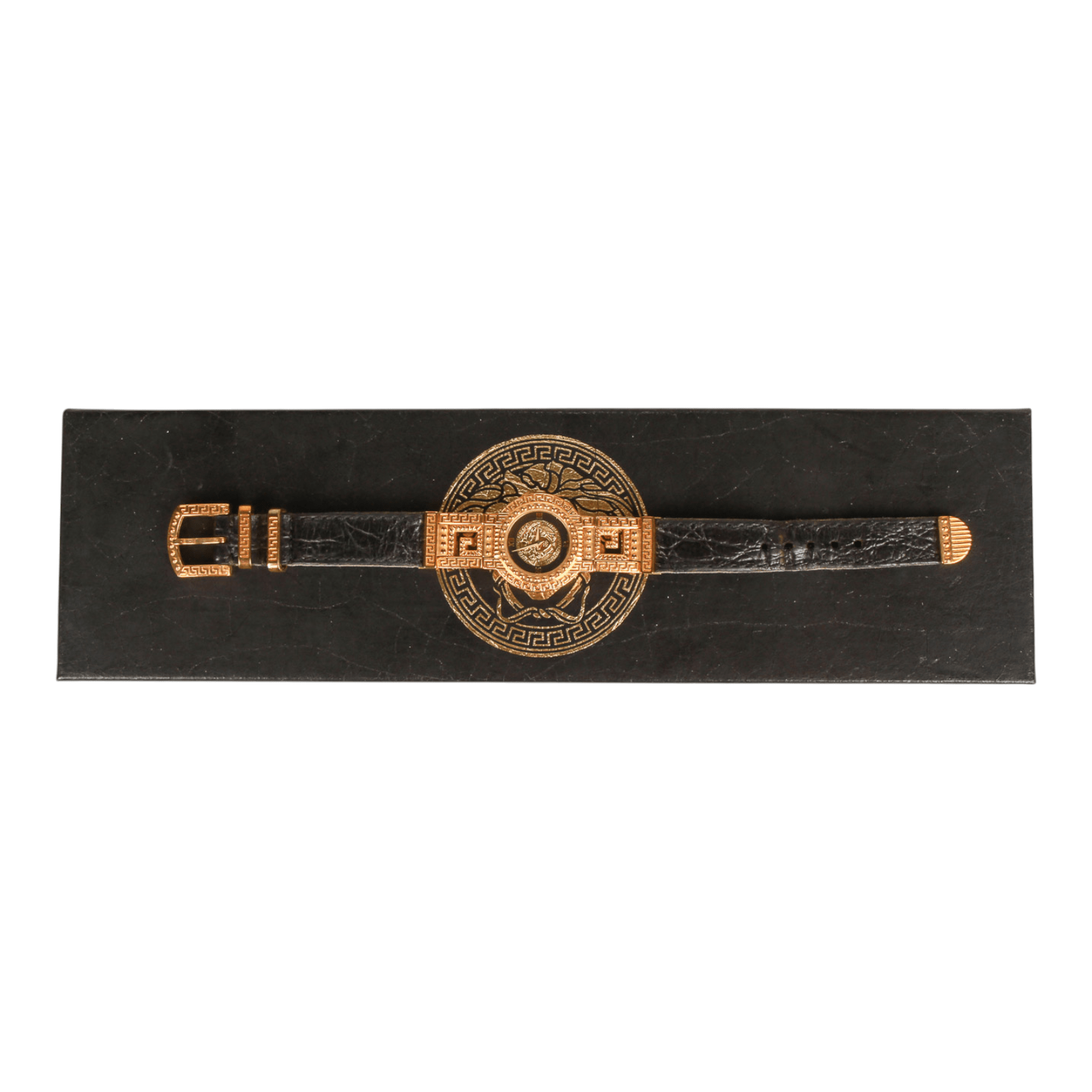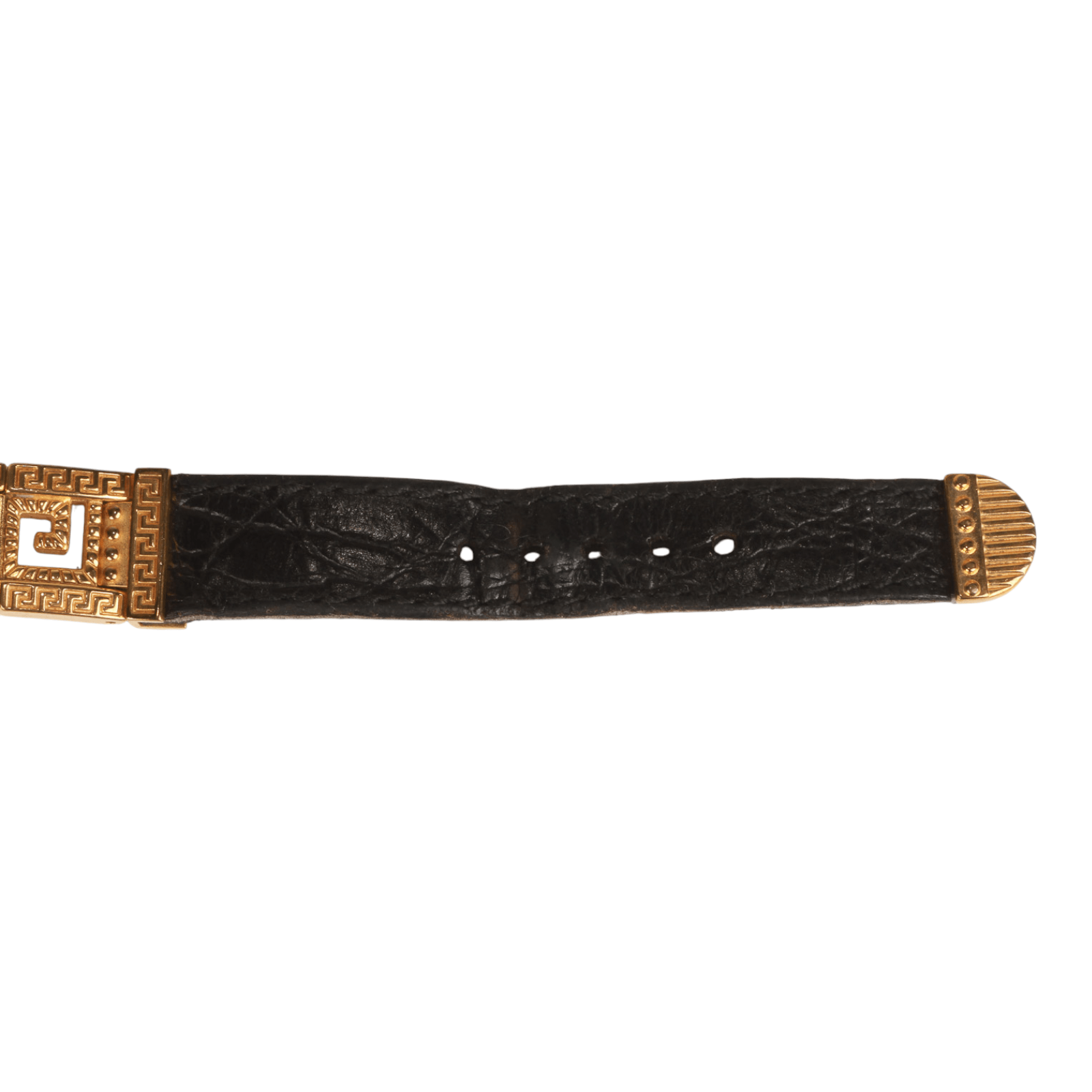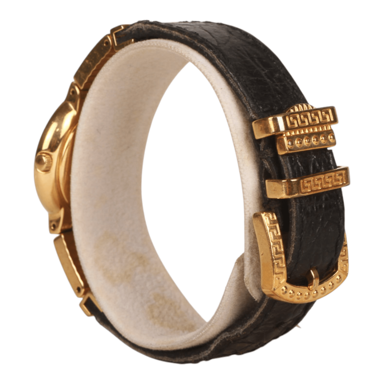 - Clasp: Signed gold-plated Versace deployant buckle with Greek key detail