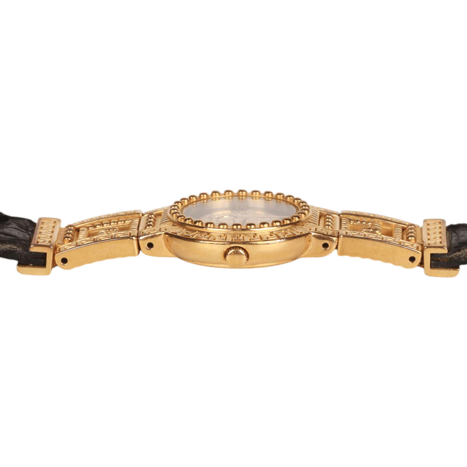 A true icon of 1990s Italian luxury fashion, this rare ladies’ Gianni Versace Medusa watch is documented in the official Versace catalogs of 1993-1994. Instantly recognizable for its bold raised Medusa head coin centerpiece set against a striking gold dial with Roman numerals, the watch is framed by the signature Greek key (meander) motif meticulously engraved on the bezel and lugs — a hallmark of Gianni Versace’s opulent aesthetic during his most celebrated era.
