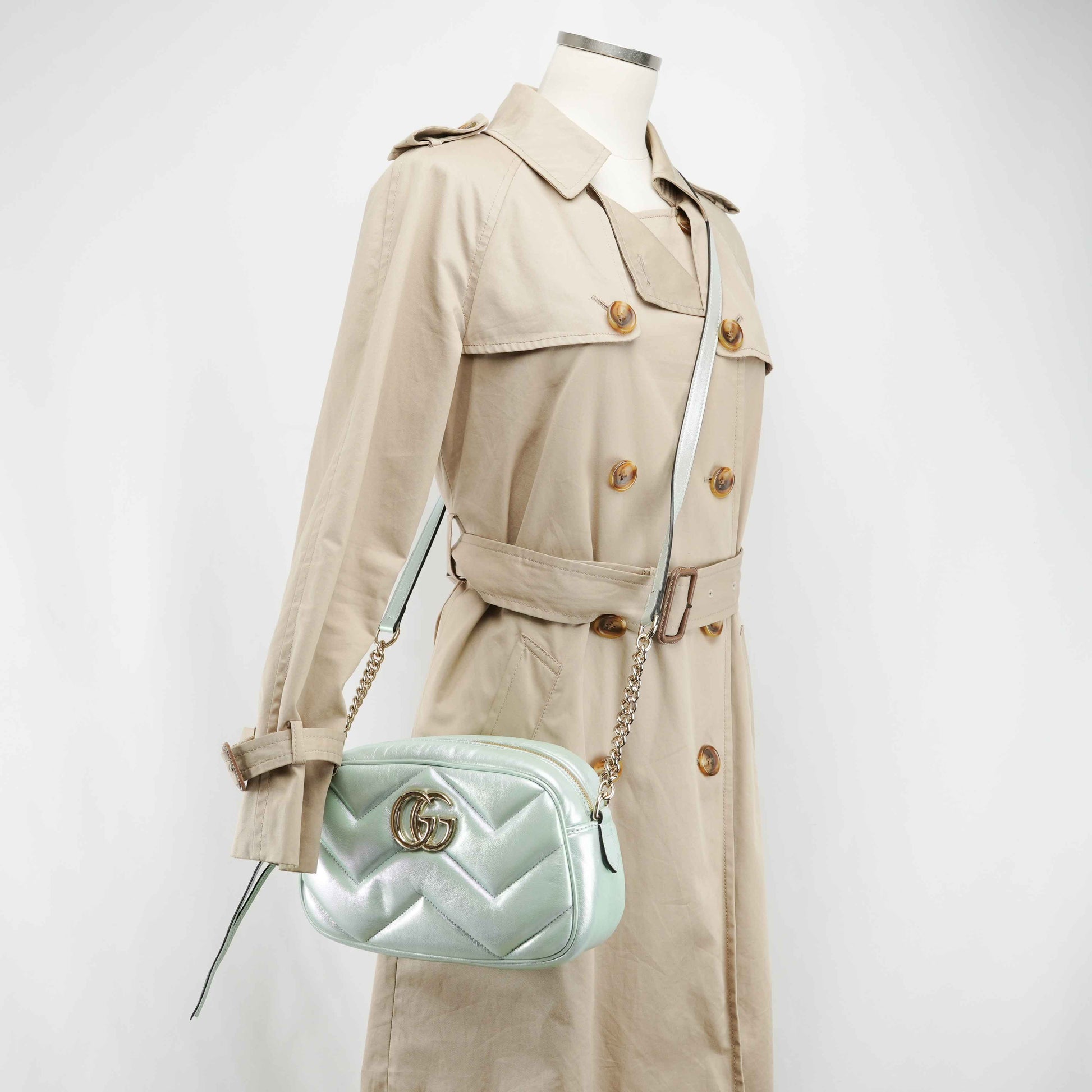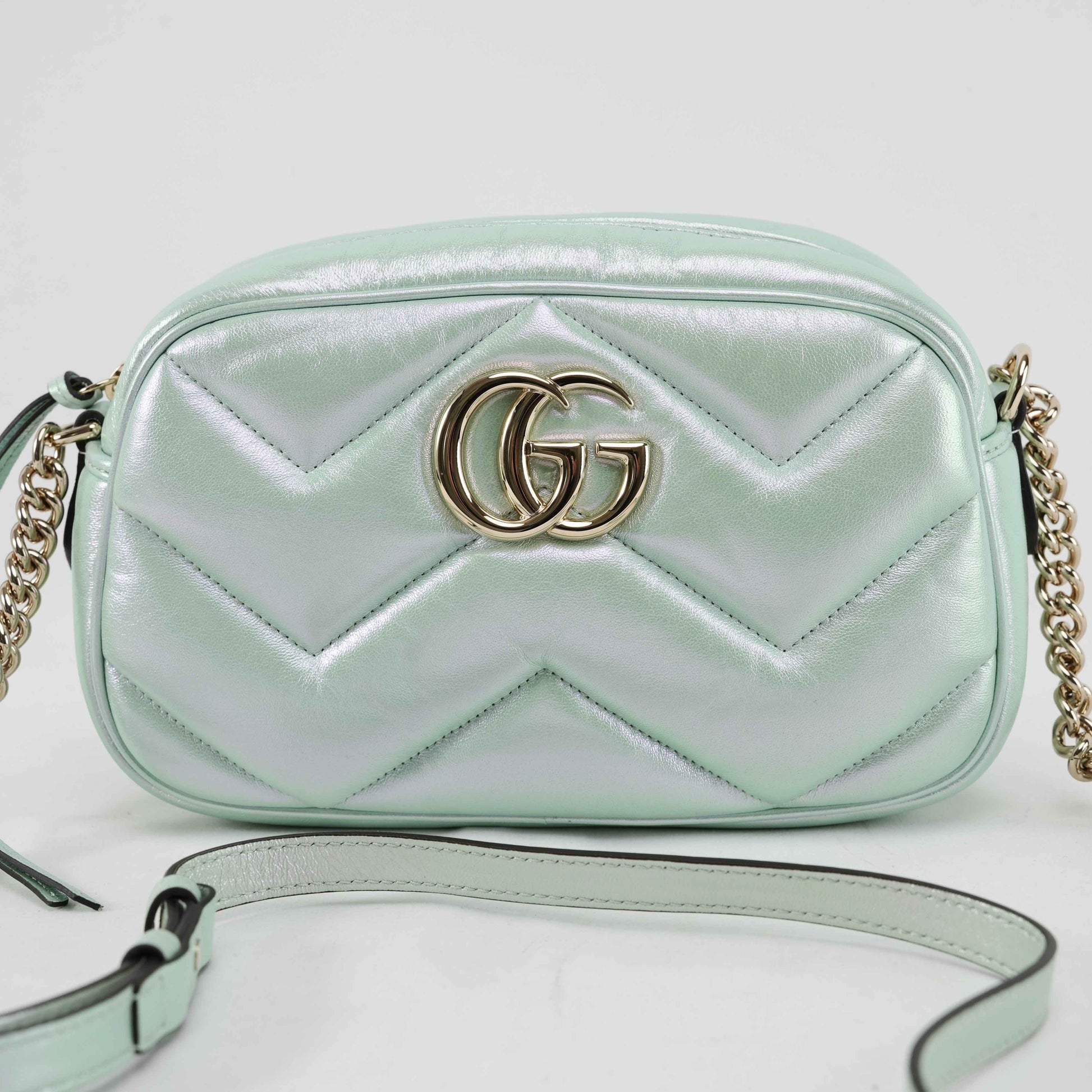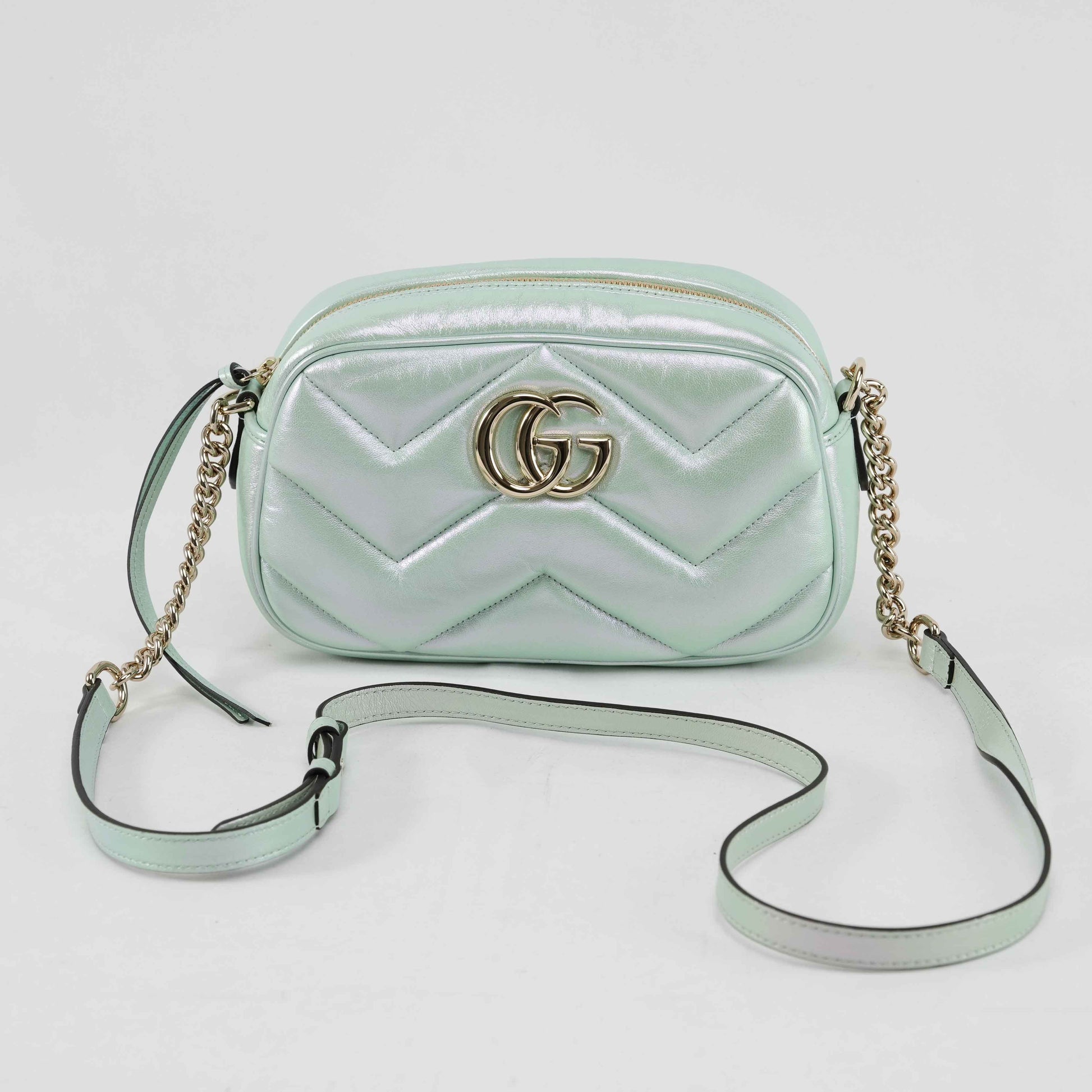 Add a pop of contemporary luxury to your accessories collection with this stunning Gucci GG Nappa Chevron Matelasse bag. Crafted in iridescent mint green matelassé leather, the bag showcases Gucci’s signature chevron quilting and antique gold-tone GG logo hardware on the front. The sleek and compact silhouette is complemented by a long adjustable leather and chain strap, allowing for versatile shoulder or crossbody wear.