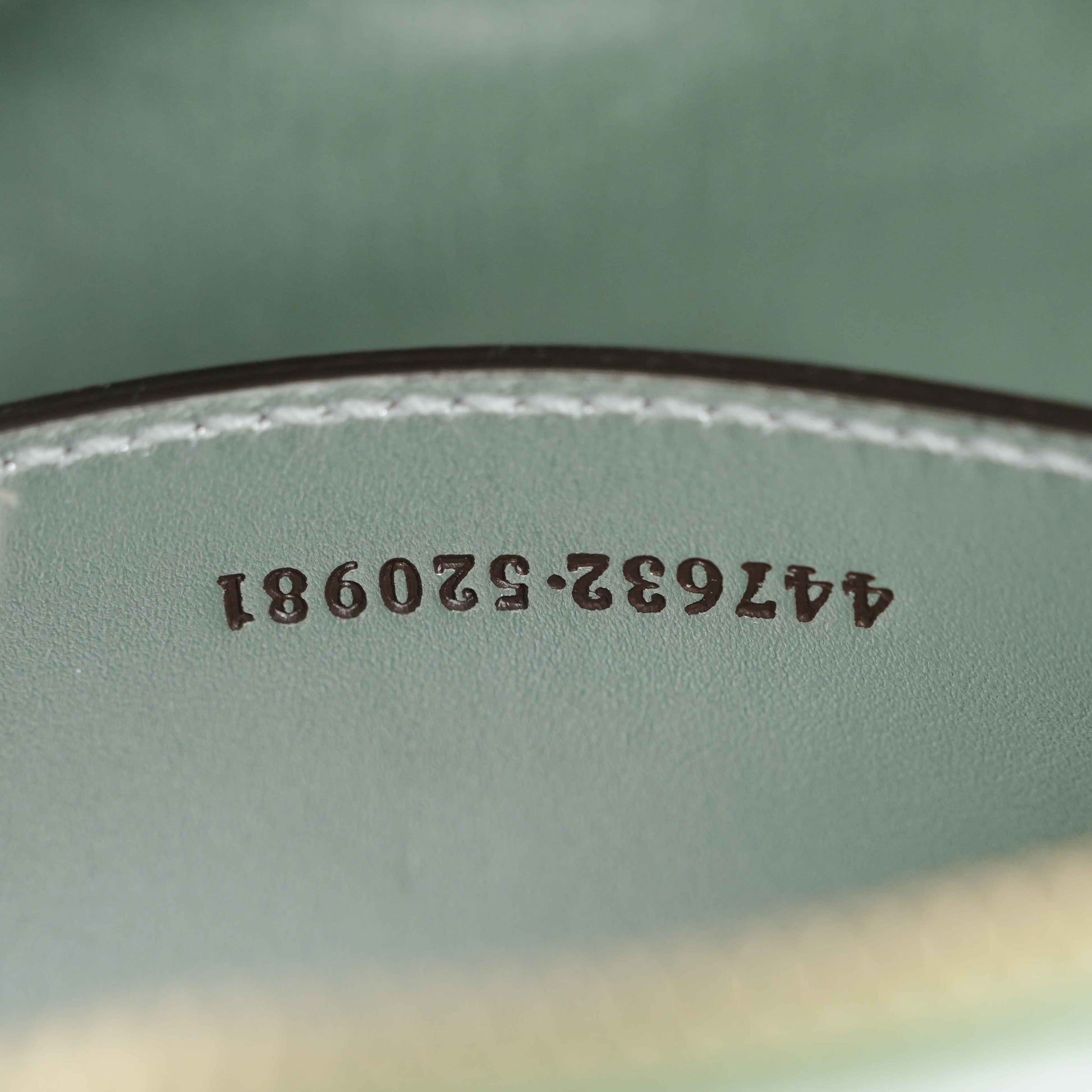 The zip-top opens to a smooth mint green satin-lined interior with one flat pocket, perfect for carrying daily essentials in style. This model is identified by code 447632 520981, and features subtle yet iconic branding throughout, with impeccable craftsmanship made in Italy.