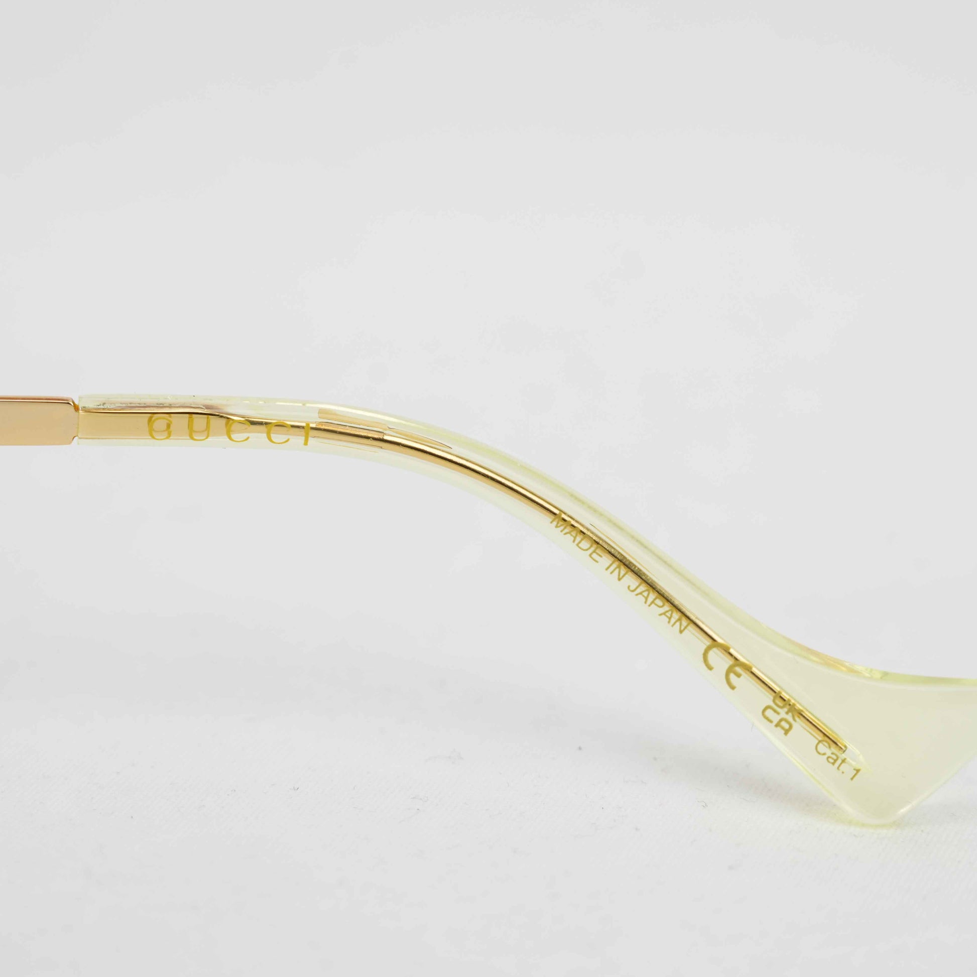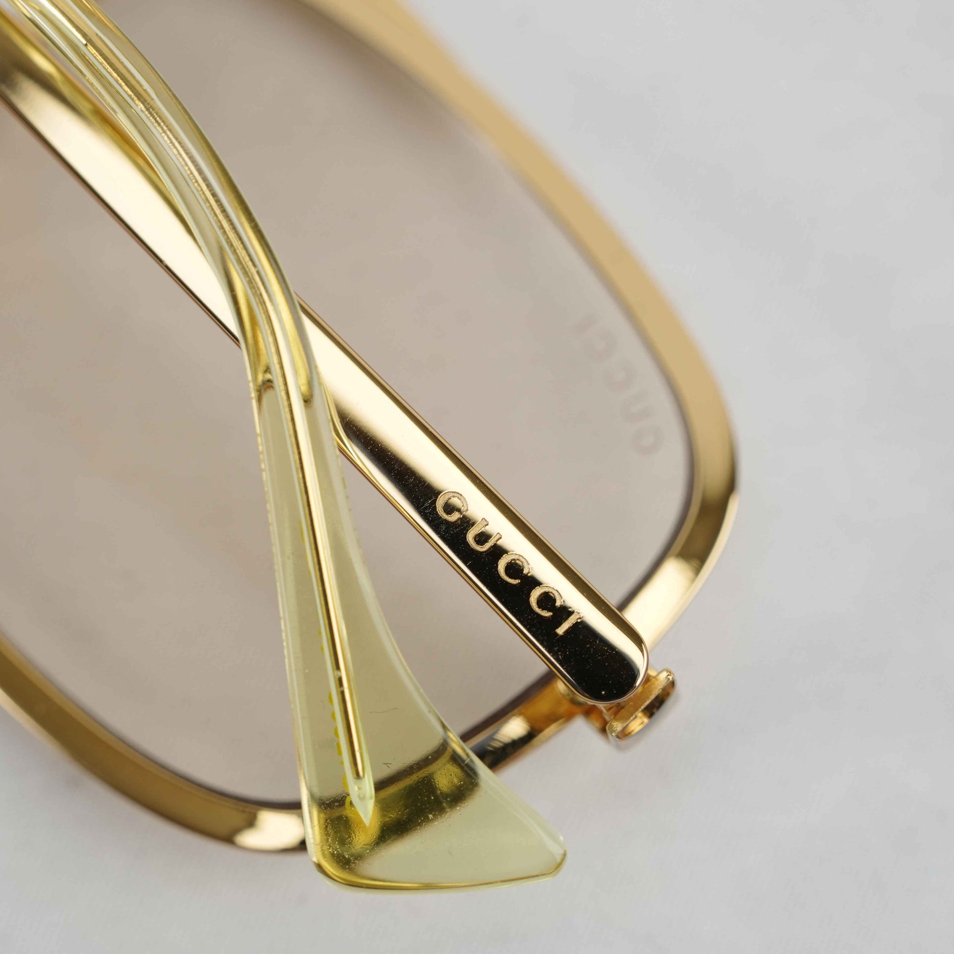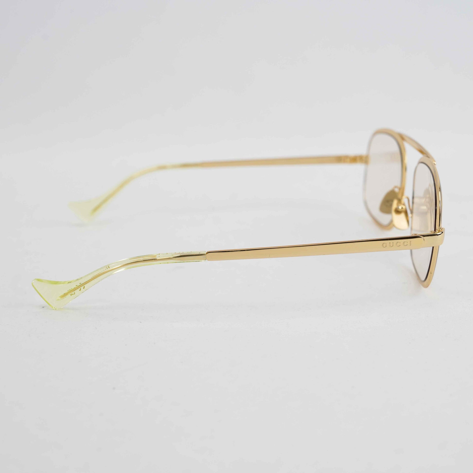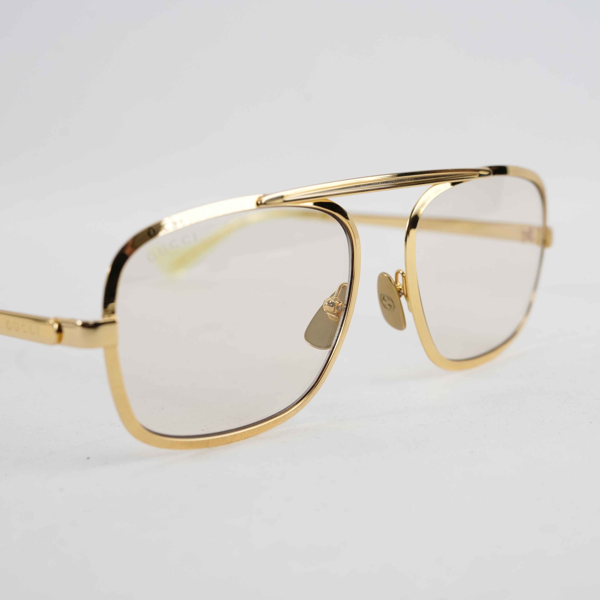 Step into timeless sophistication with these Gucci eyeglasses. Crafted in Japan, this luxurious pair features a classic aviator silhouette with a modern twist. The gold-tone full-rim frame is constructed from high-quality metal, exuding a sleek, refined look. Transparent lenses and integrated nose pads offer both clarity and comfort, while the subtle GUCCI logos etched on the temples and nose pads reinforce the iconic status of the design.