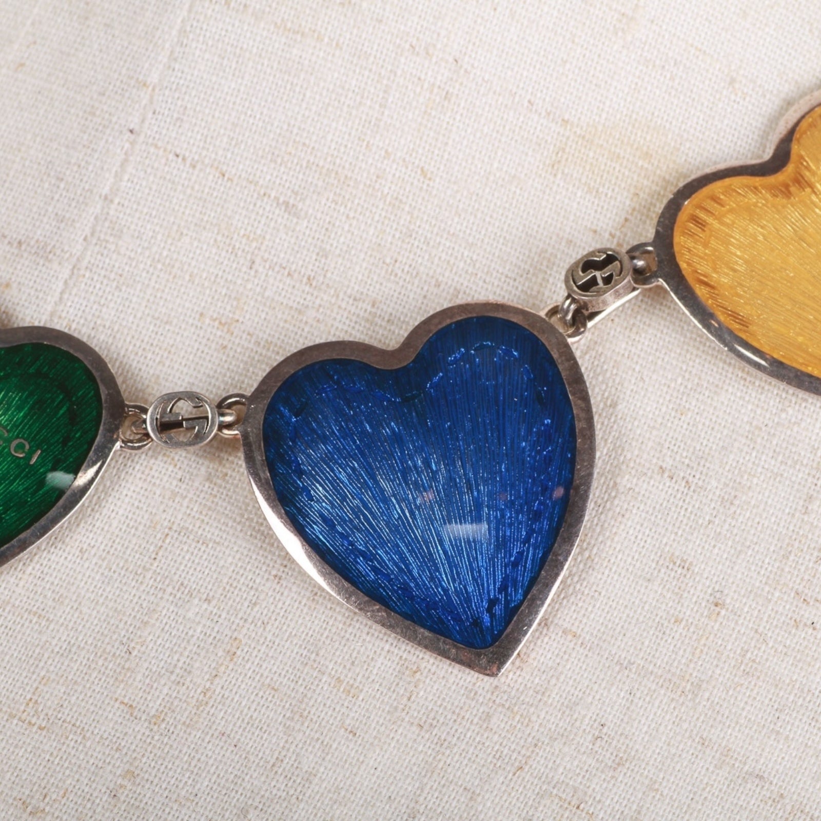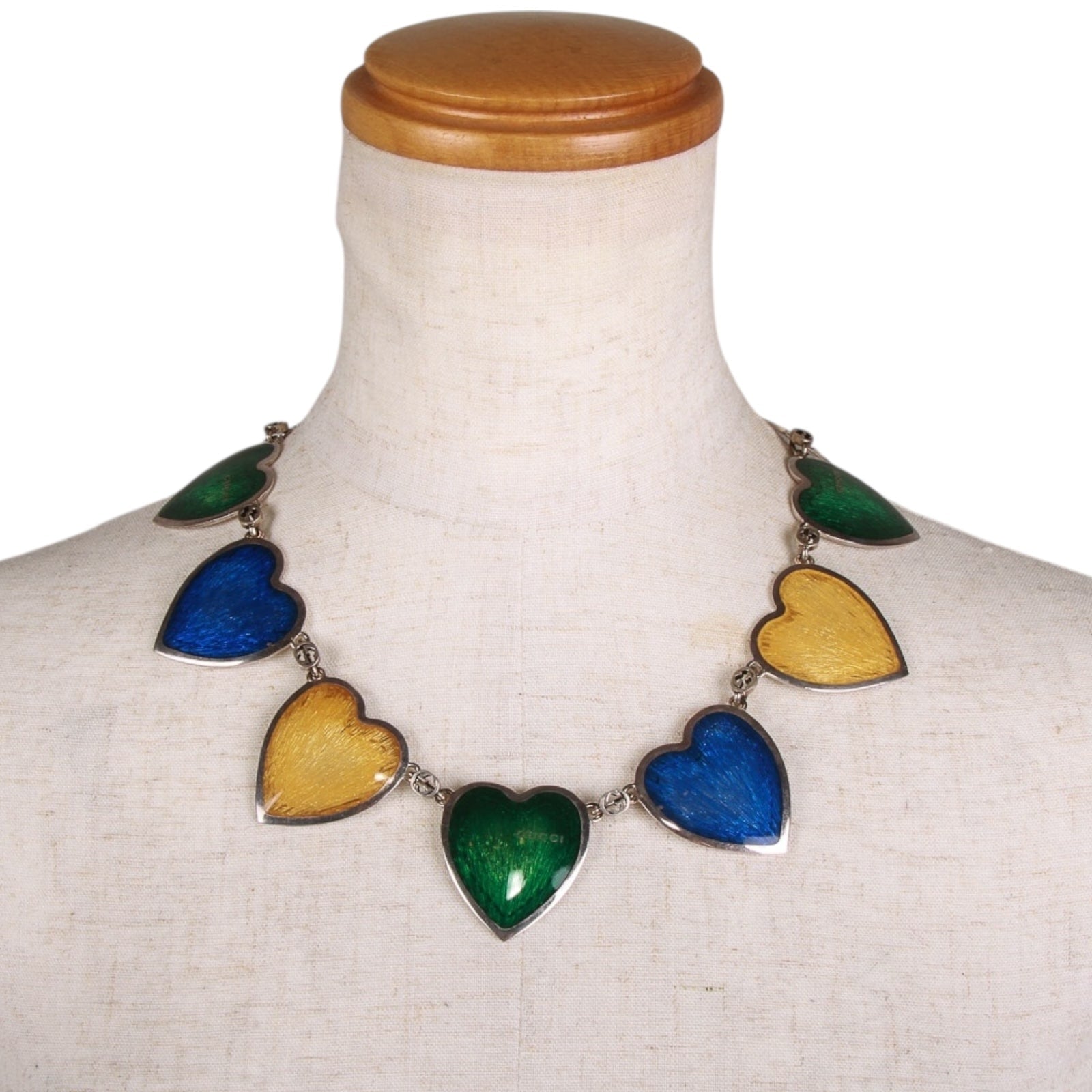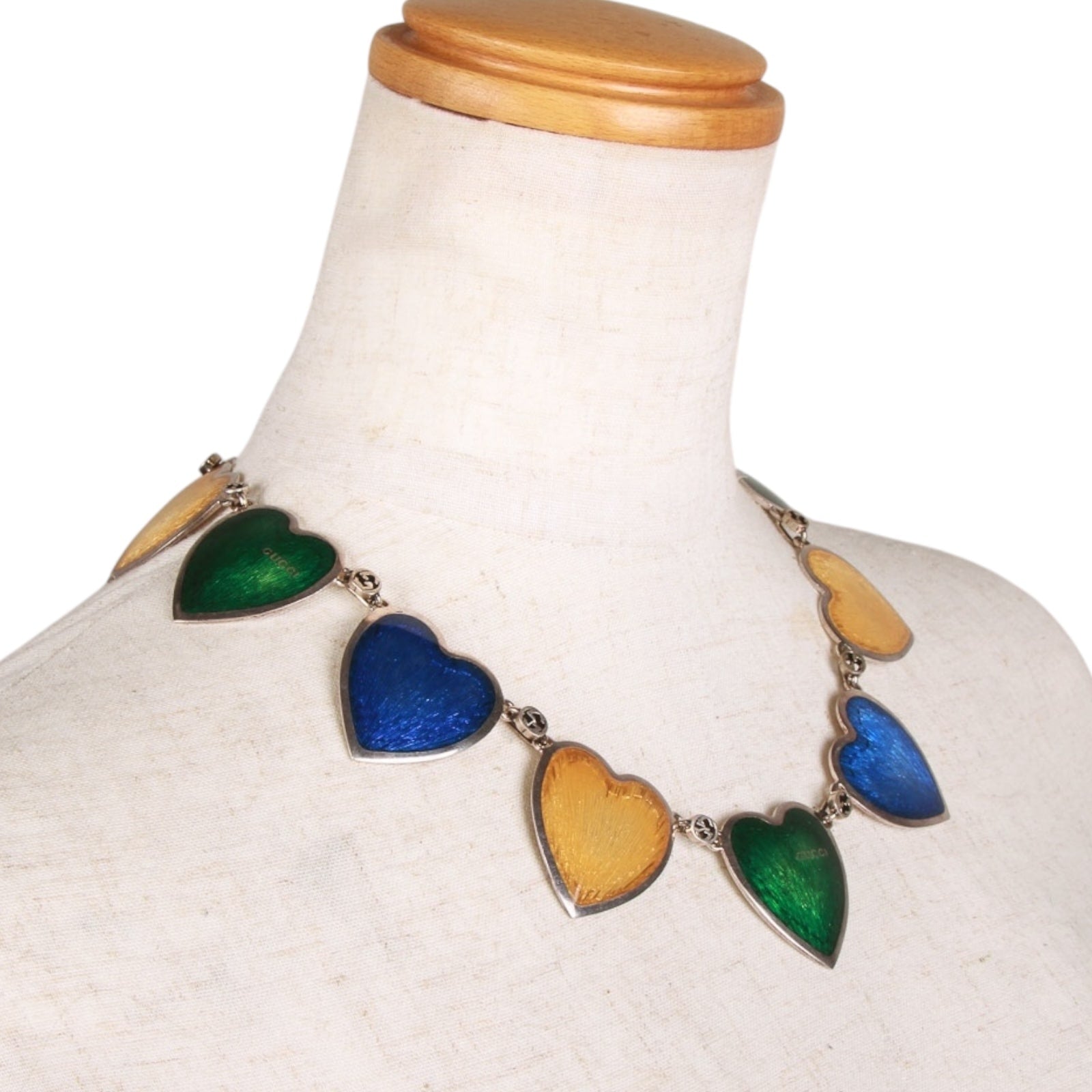 Embrace the playful spirit of Gucci with this enchanting necklace, a vibrant celebration of love and whimsy. Crafted in gleaming Steel, the chain links with signature GG motifs and subtle engravings, connecting a cascade of nine heart-shaped pendants in bold, glossy enamel finishes: radiant yellows evoking golden sunsets, deep blues reminiscent of midnight skies, and lush greens inspired by verdant gardens. Each heart dangles freely, catching the light with iridescent sheen and a delicate "Gucci" inscription on select pendants, adding that iconic touch of maison heritage. Measuring approximately 50 cm or 19.6" with a secure lobster clasp, this piece layers effortlessly over a silk blouse or elevates a little black dress—perfect for the modern romantic who dares to wear their heart on their sleeve. Made in Italy.