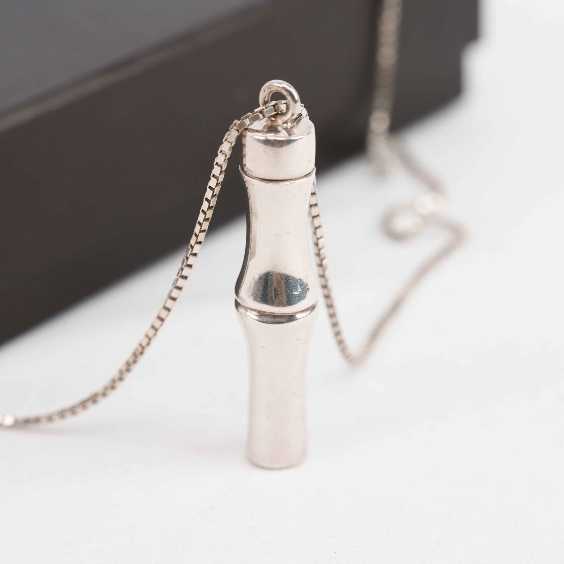 Elevate your accessories collection with this elegant Gucci pendant necklace, featuring the brand's iconic bamboo motif. Crafted in silver, the pendant showcases a sleek, cylindrical bamboo silhouette — a nod to Gucci’s heritage design elements.