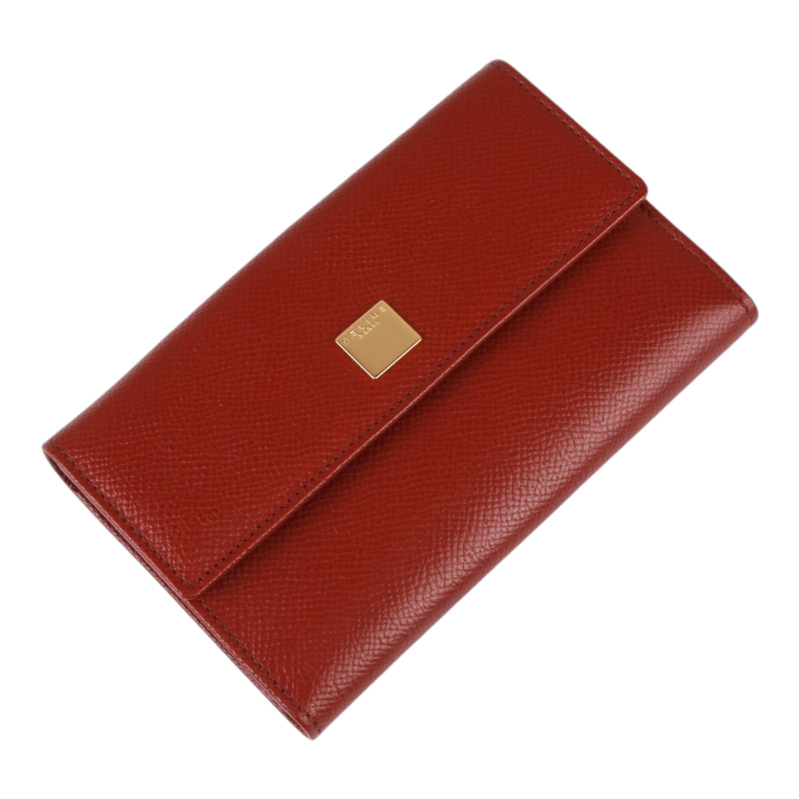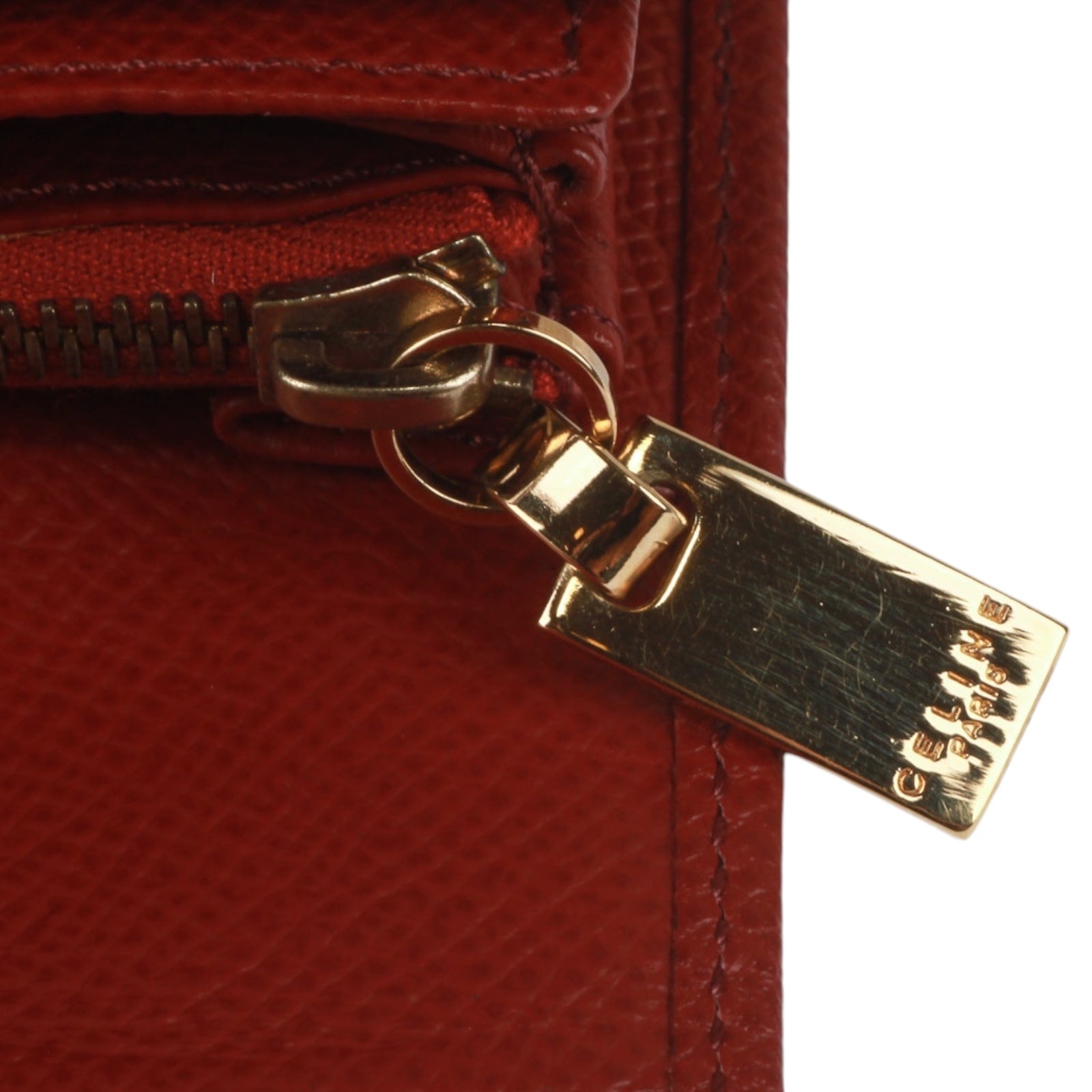 Crafted from luxurious textured red leather with a refined grain, this elegant Celine Paris wallet exudes timeless sophistication. The rich dark red hue is complemented by polished gold-tone hardware, including the iconic Celine Paris plaque on the front flap. Designed for both style and functionality, it features multiple credit card slots, a secure zippered coin compartment, and a clean interior lining for everyday organization.