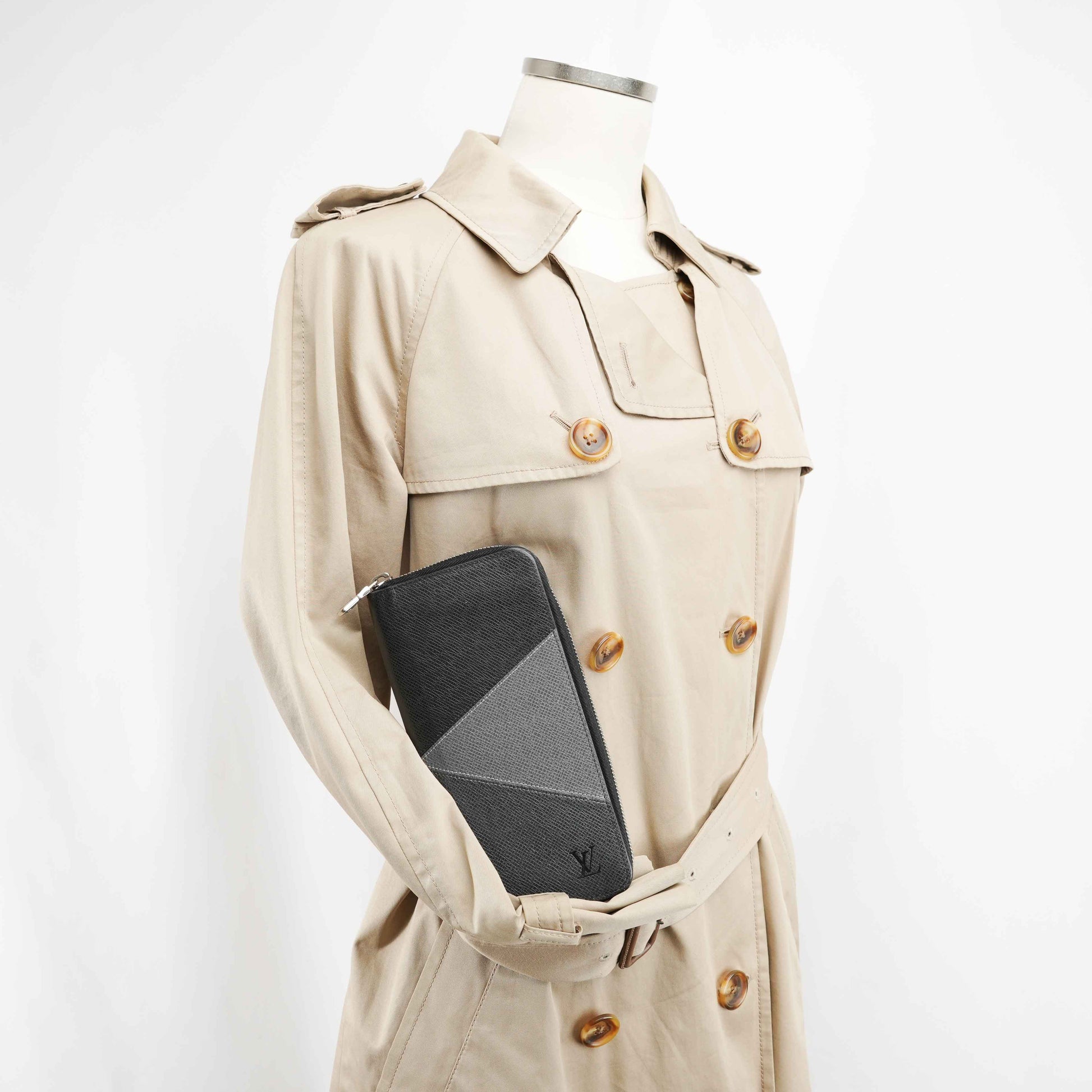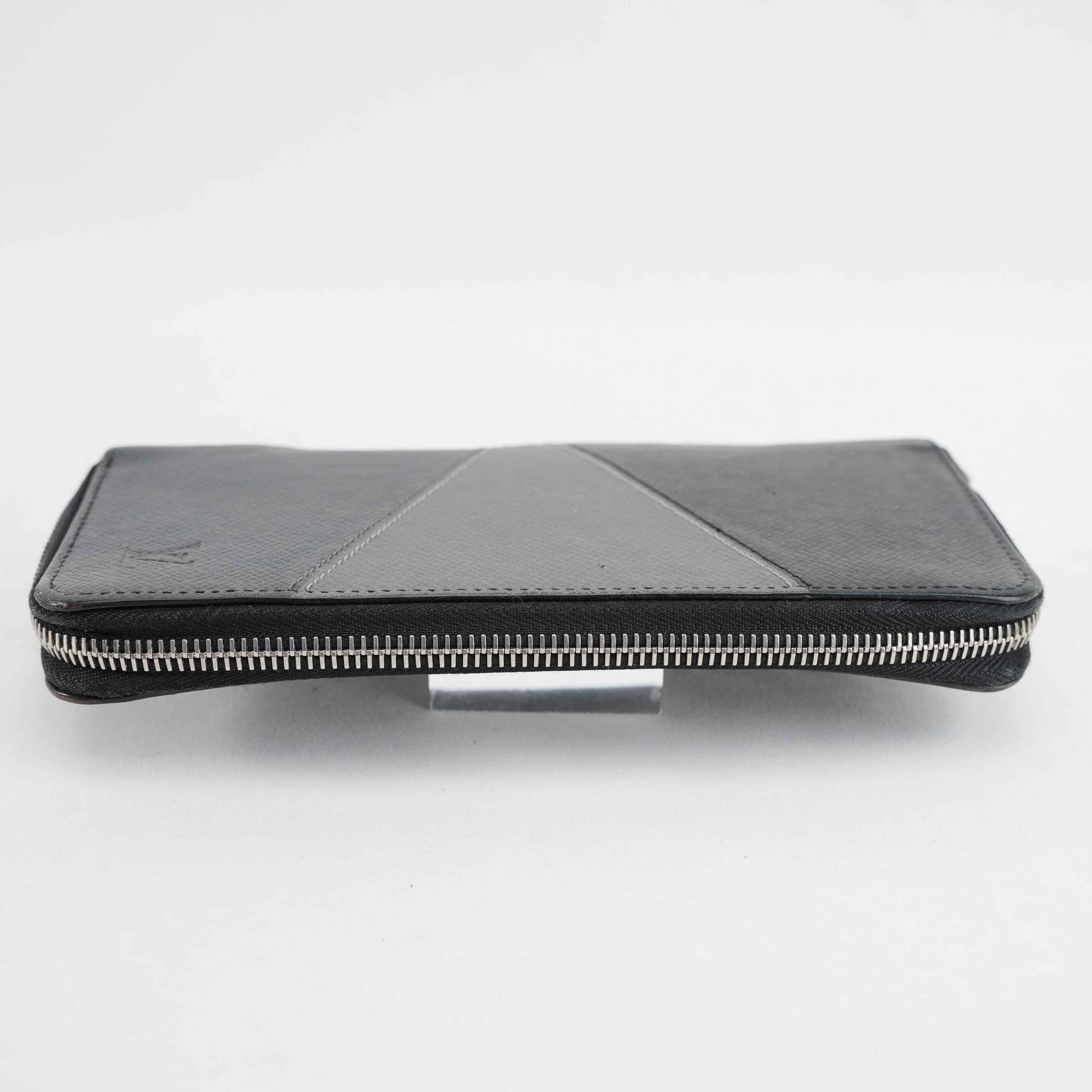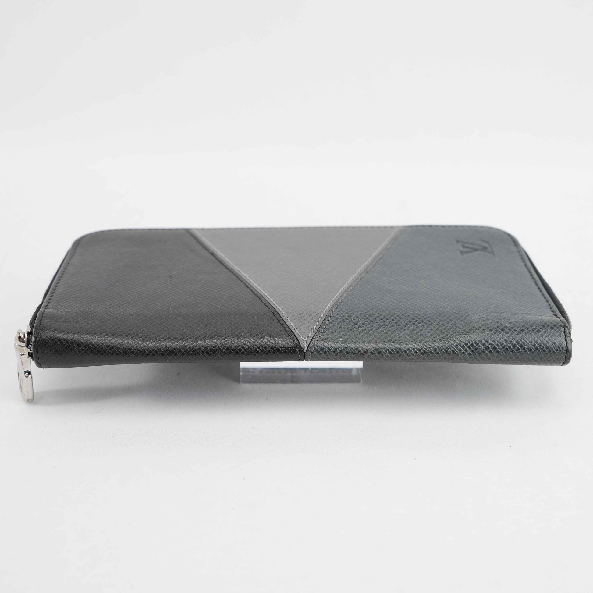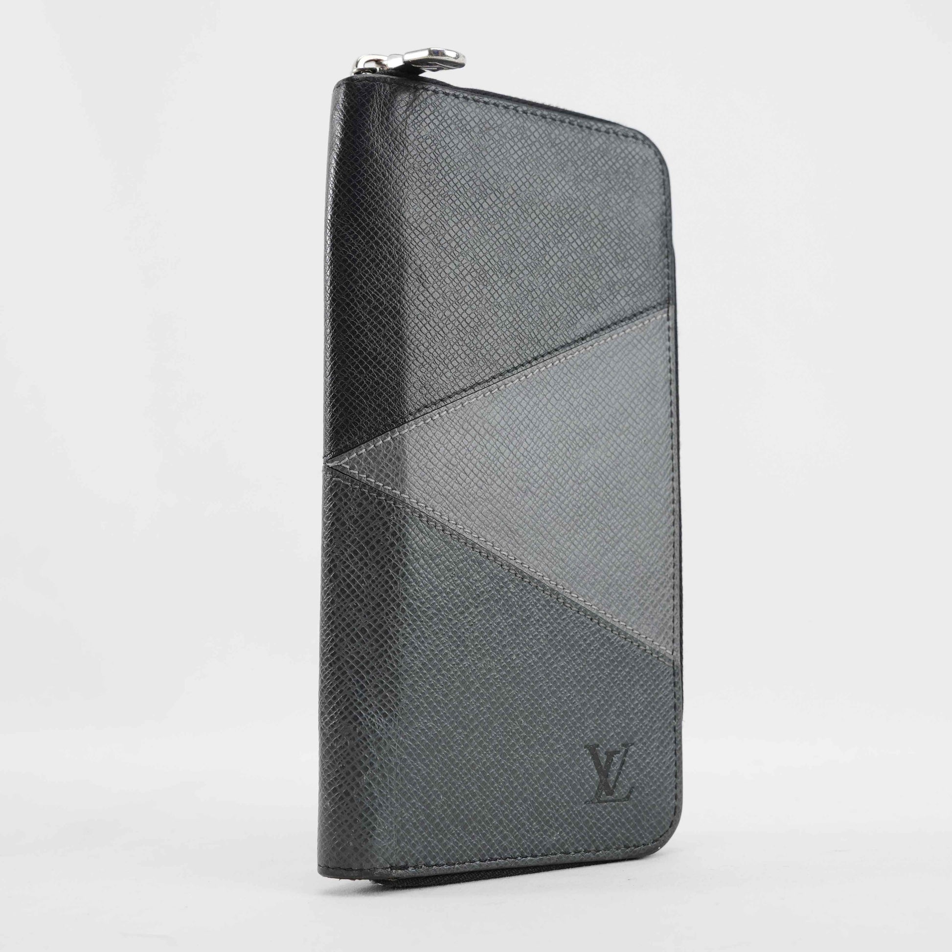 This Louis Vuitton Zippy Long Wallet is a sleek and contemporary accessory, crafted from supple Taiga leather in a bold geometric patchwork of graphite, grey, and slate tones. Designed for the modern man, it combines a minimalist exterior with practical organization inside.