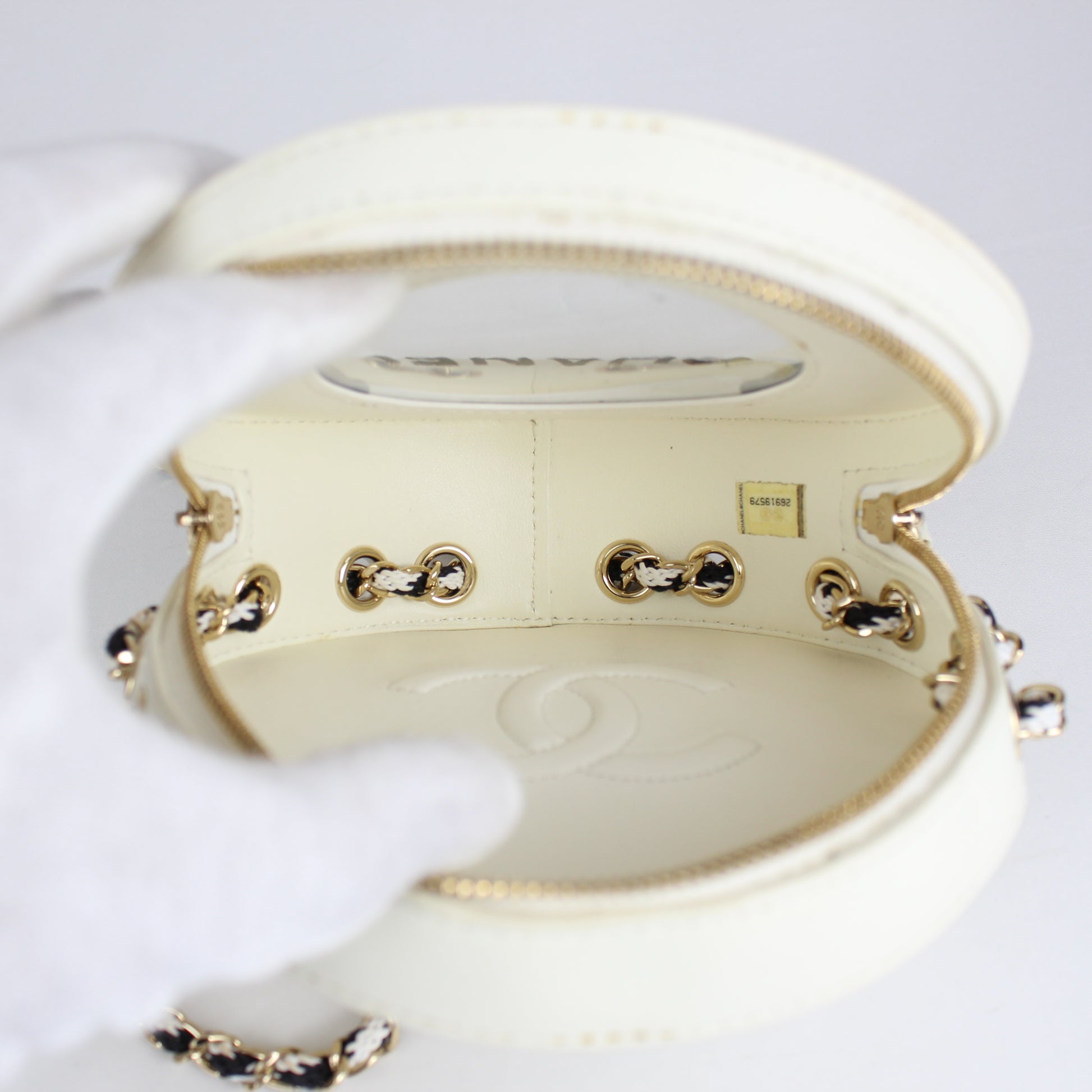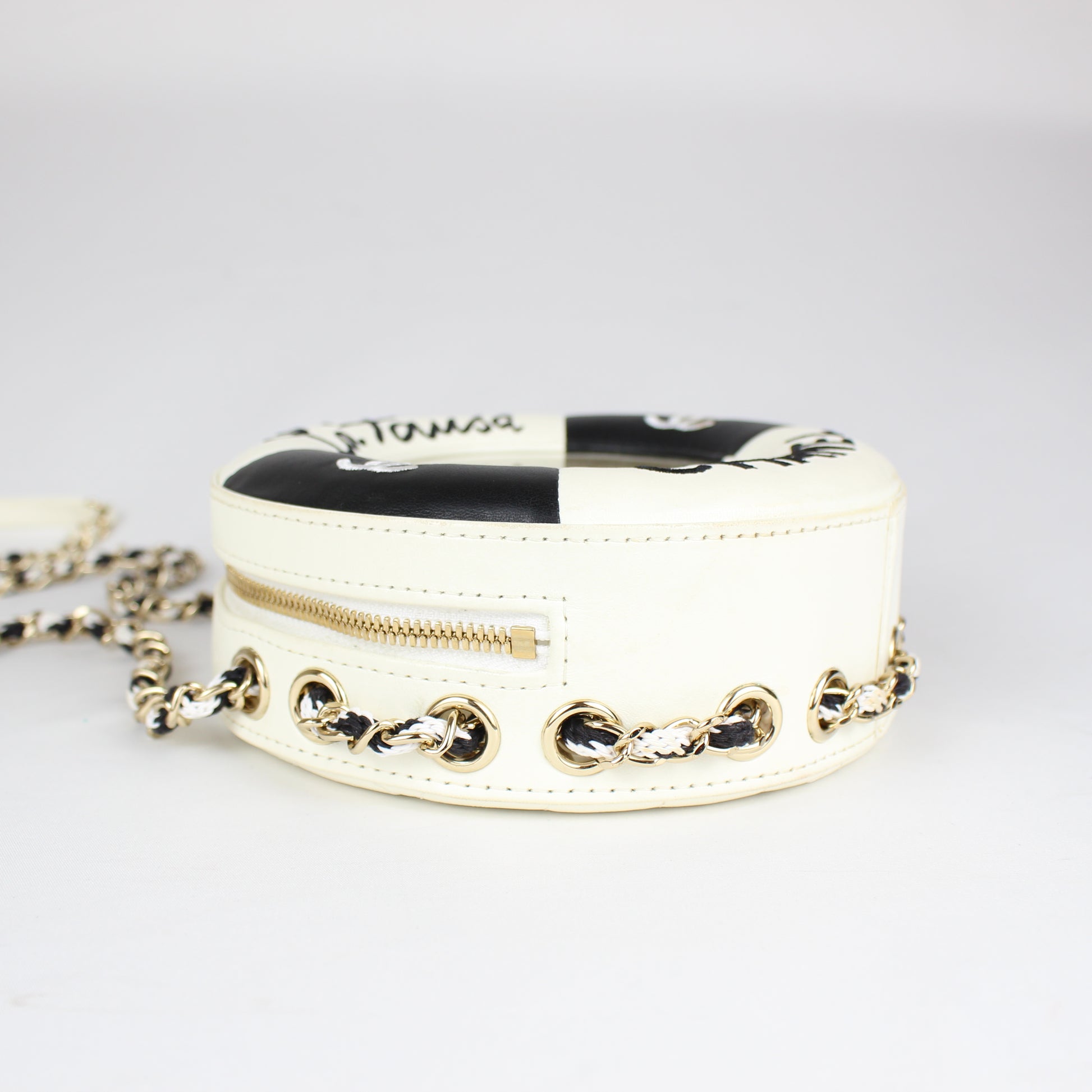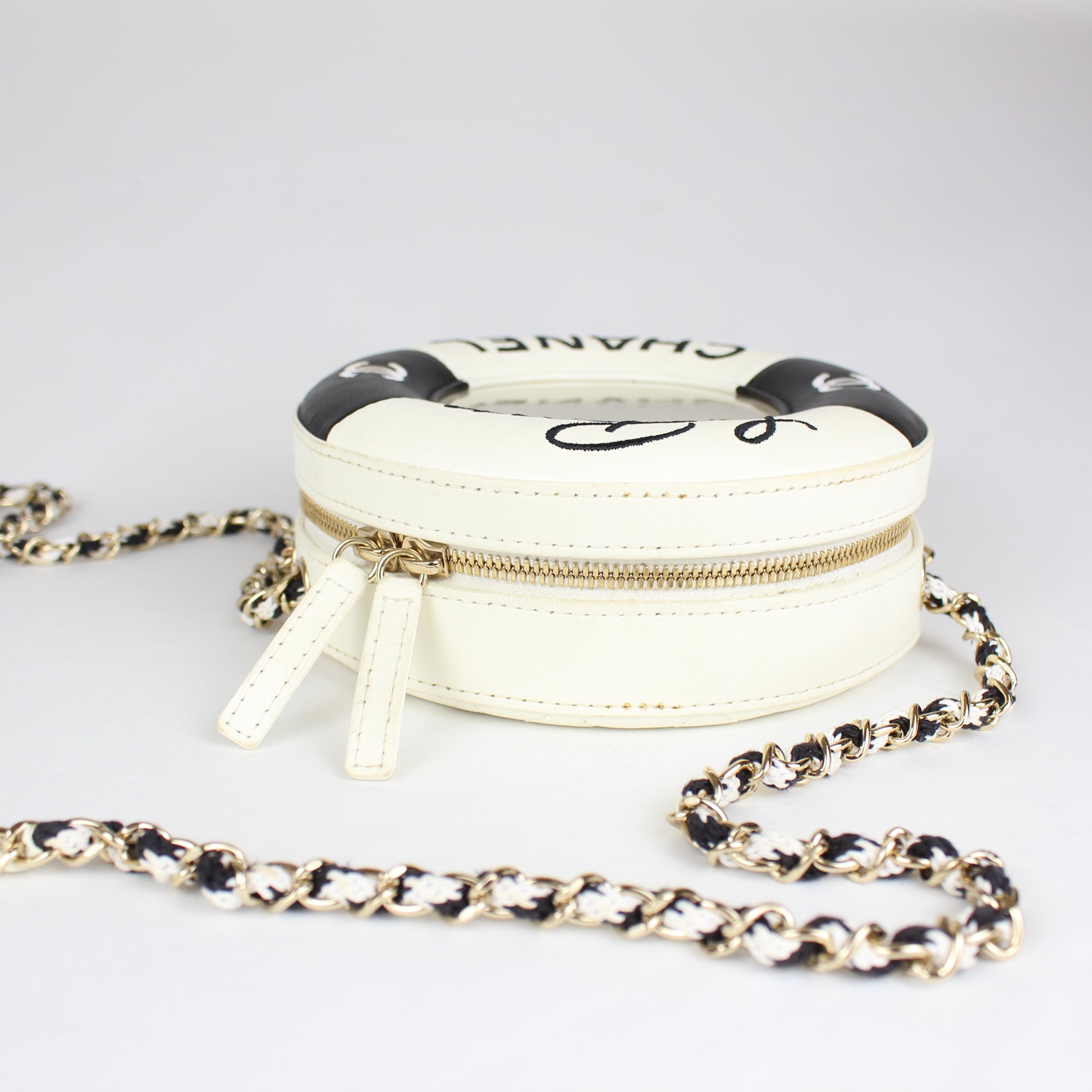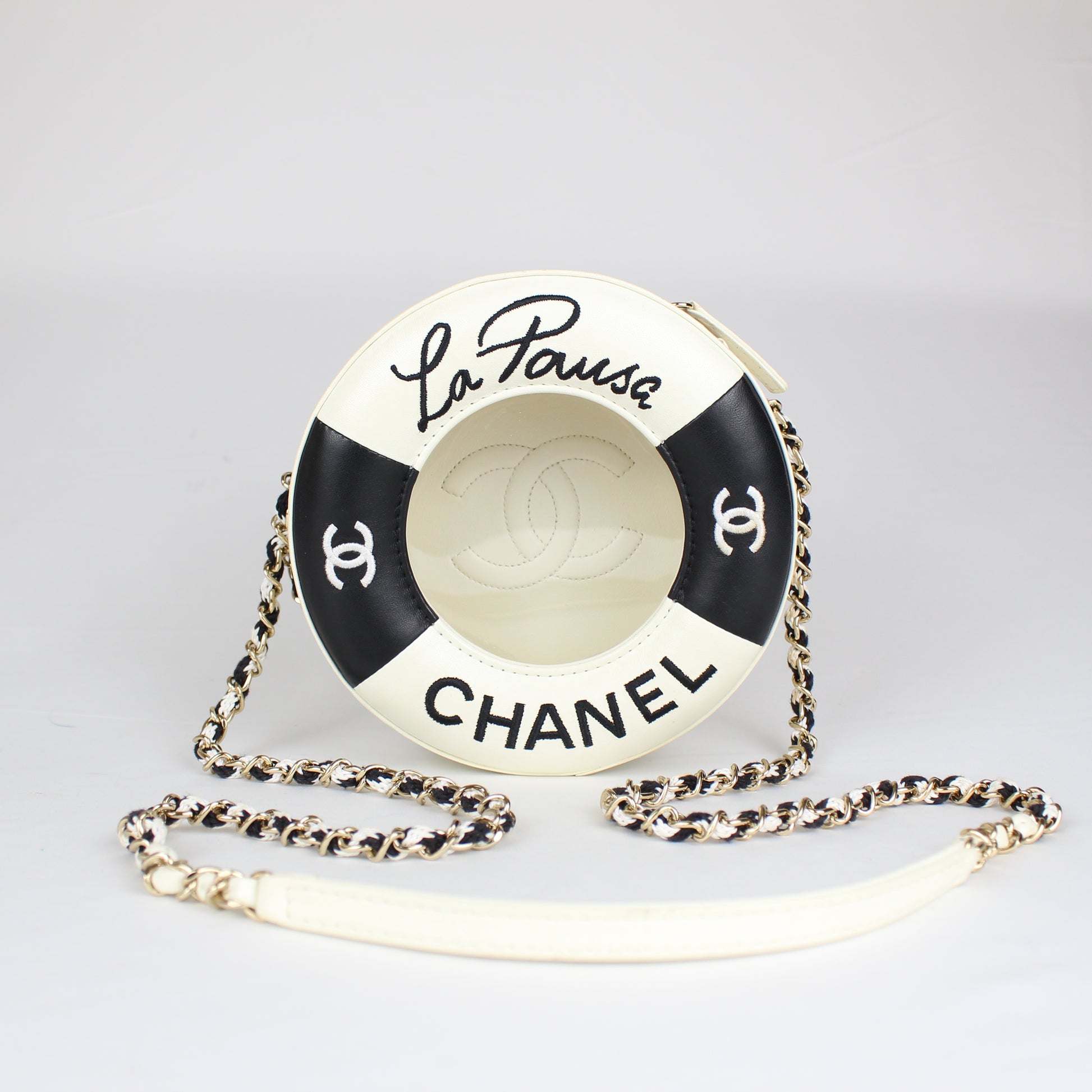 Chanel Cruise Collection “La Pausa” Lifesaver Round Crossbody Bag – White & Black Lambskin – ca. 2019