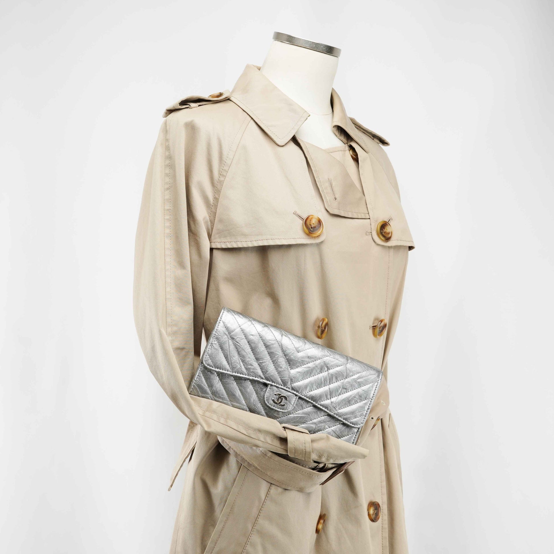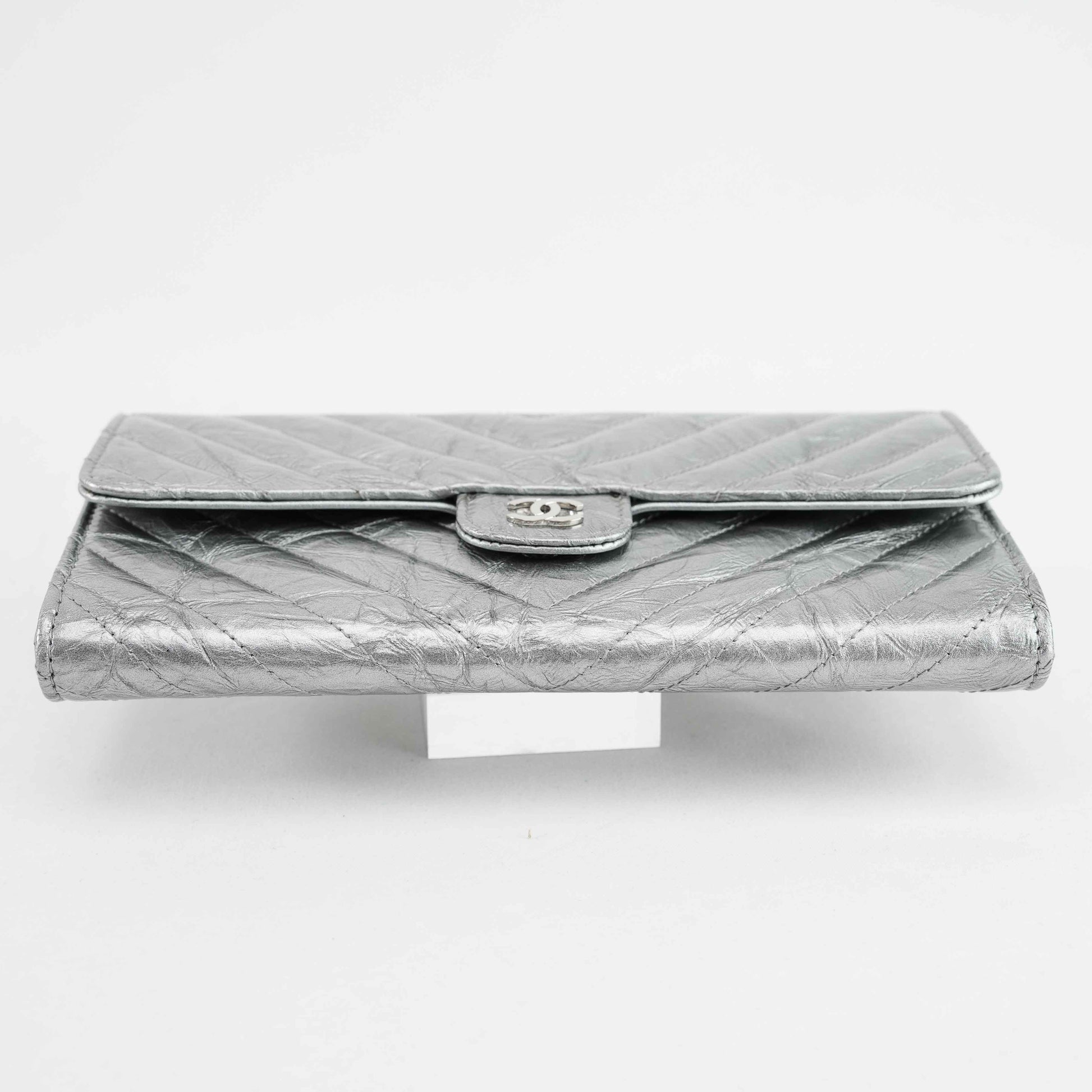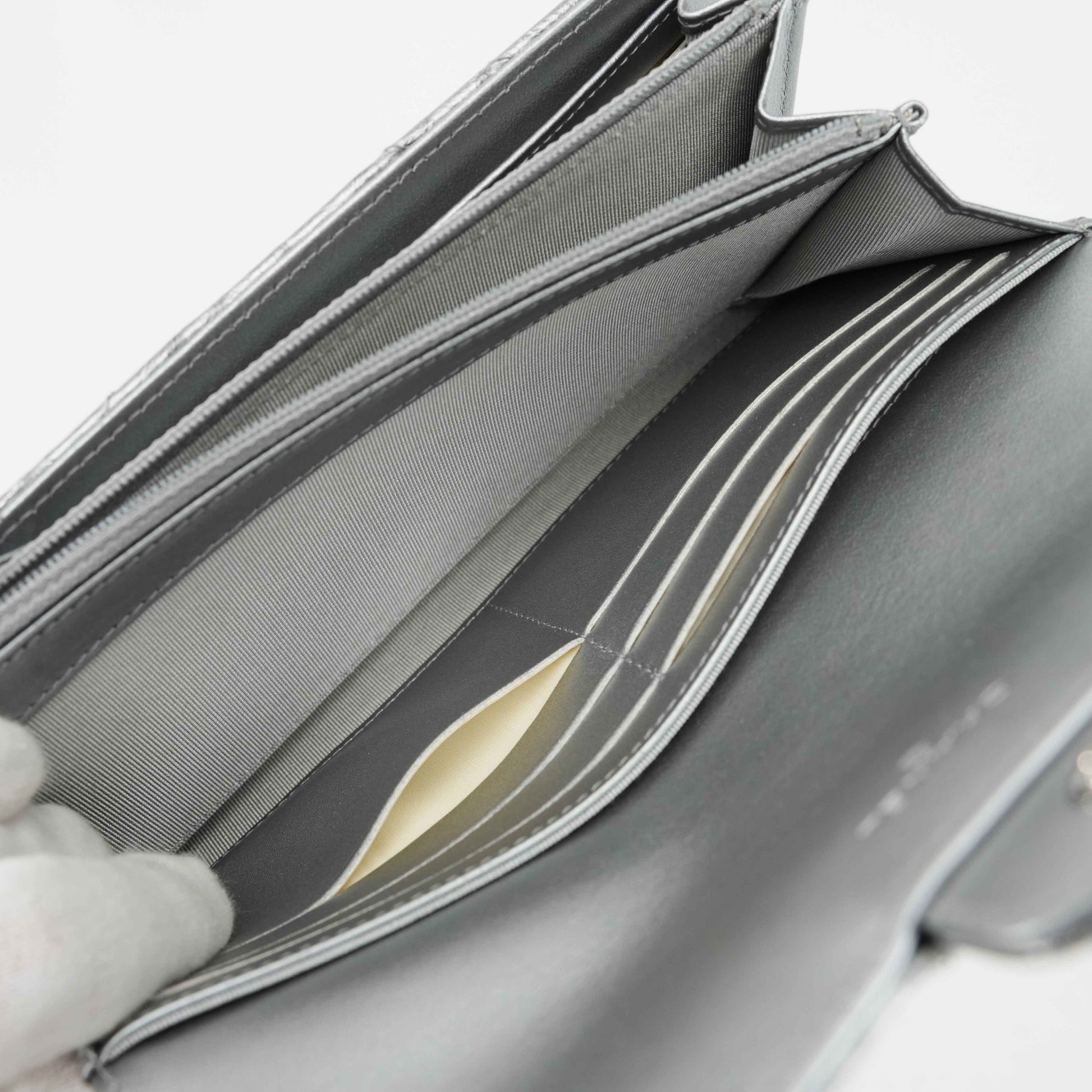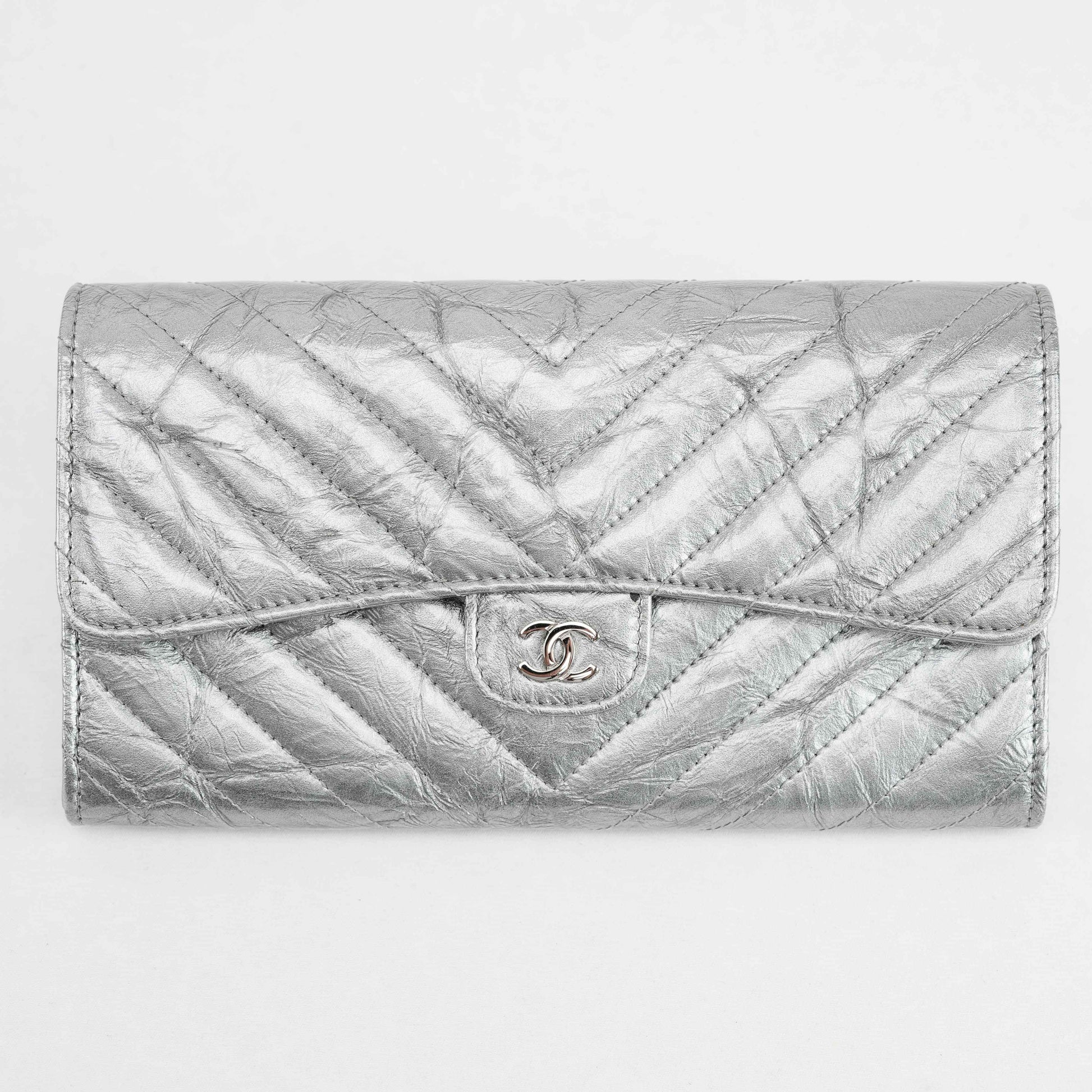 Step into luxury with this striking Chanel wallet crafted in a shimmering silver patent leather with a distinctive quilted chevron pattern. The sleek silhouette is elevated with a signature CC adorned closure flap in silver-tone hardware, adding an instantly recognizable touch of sophistication.