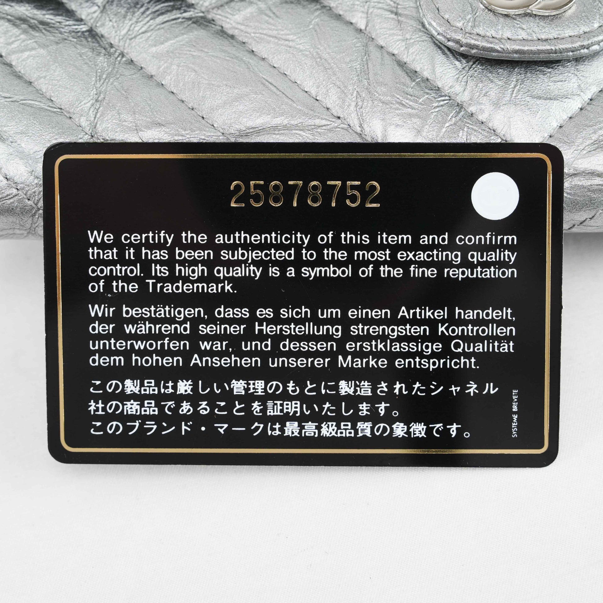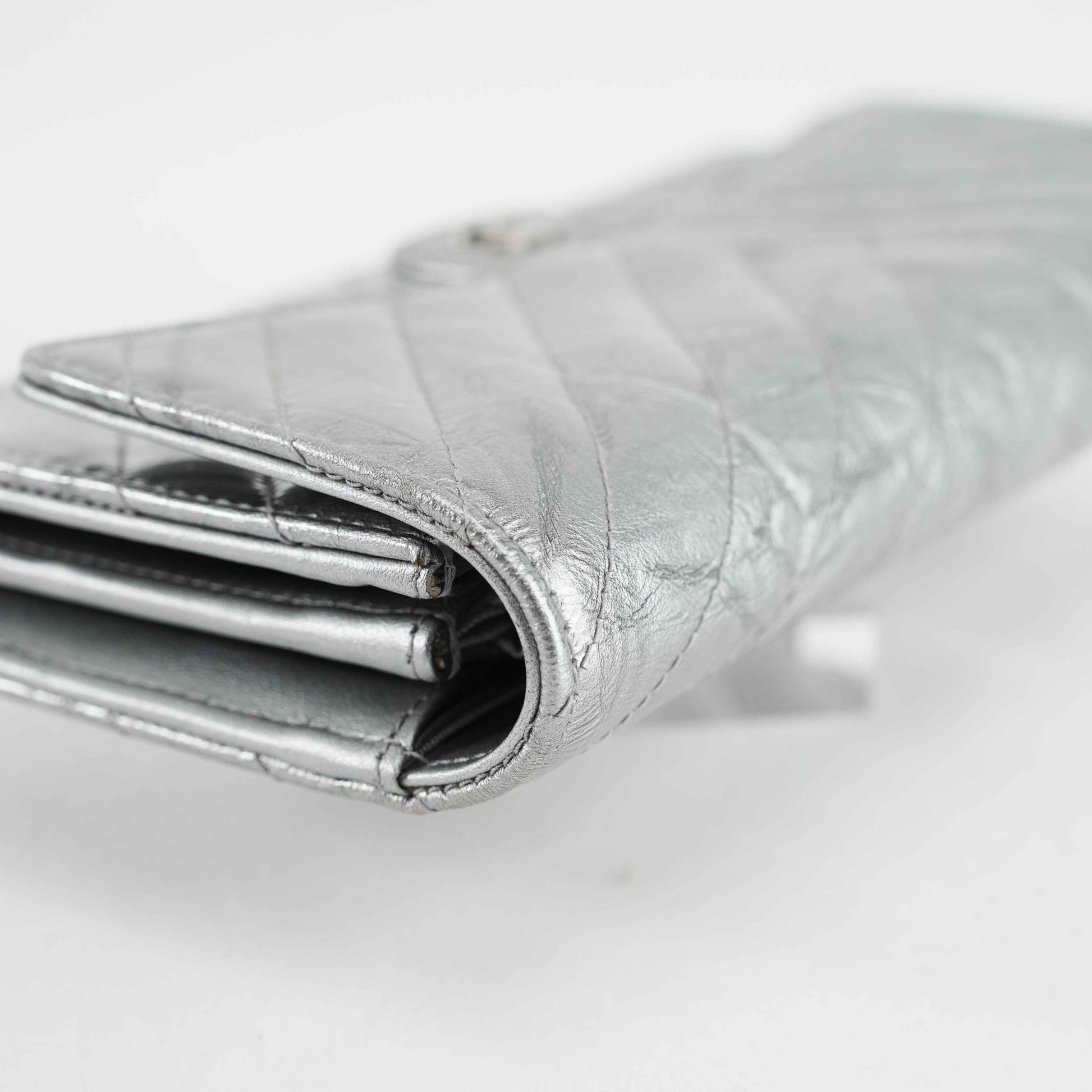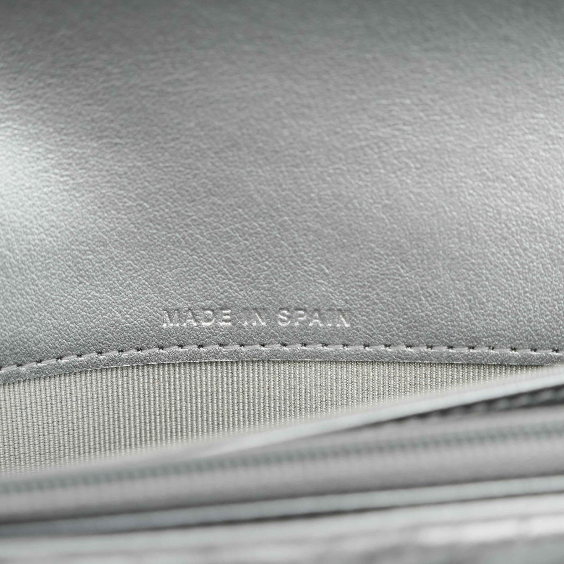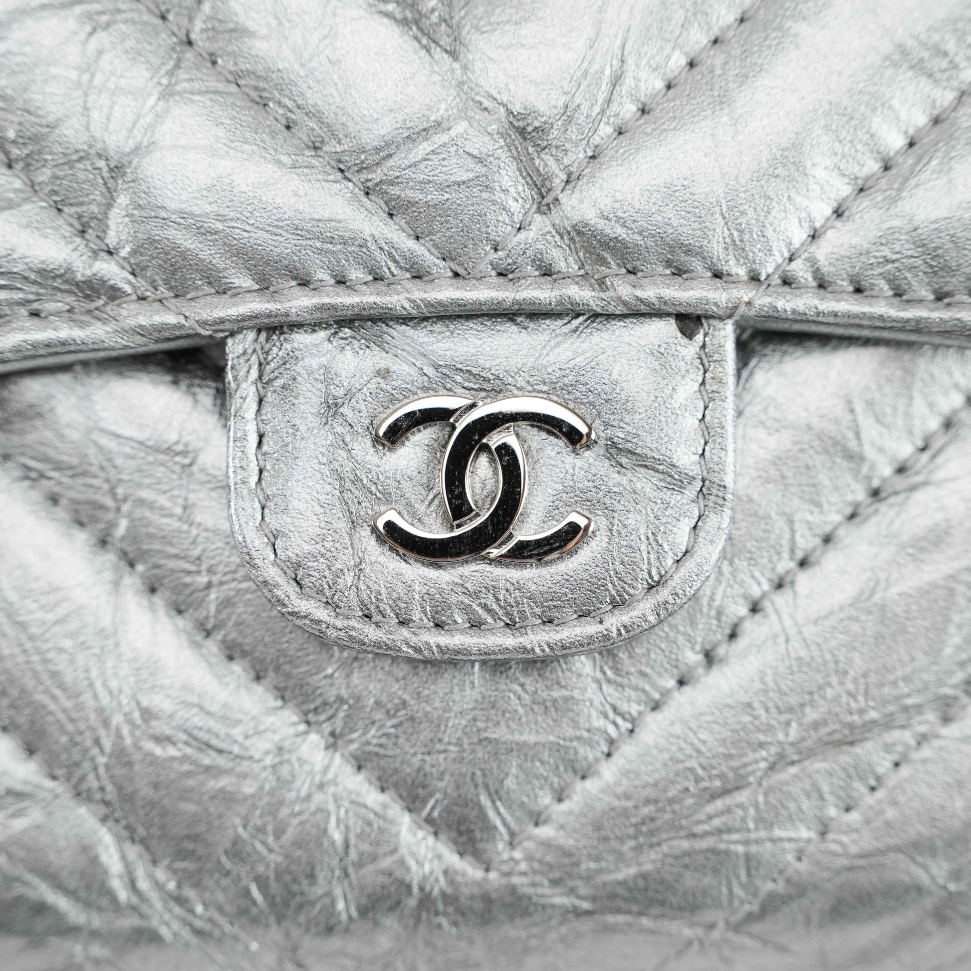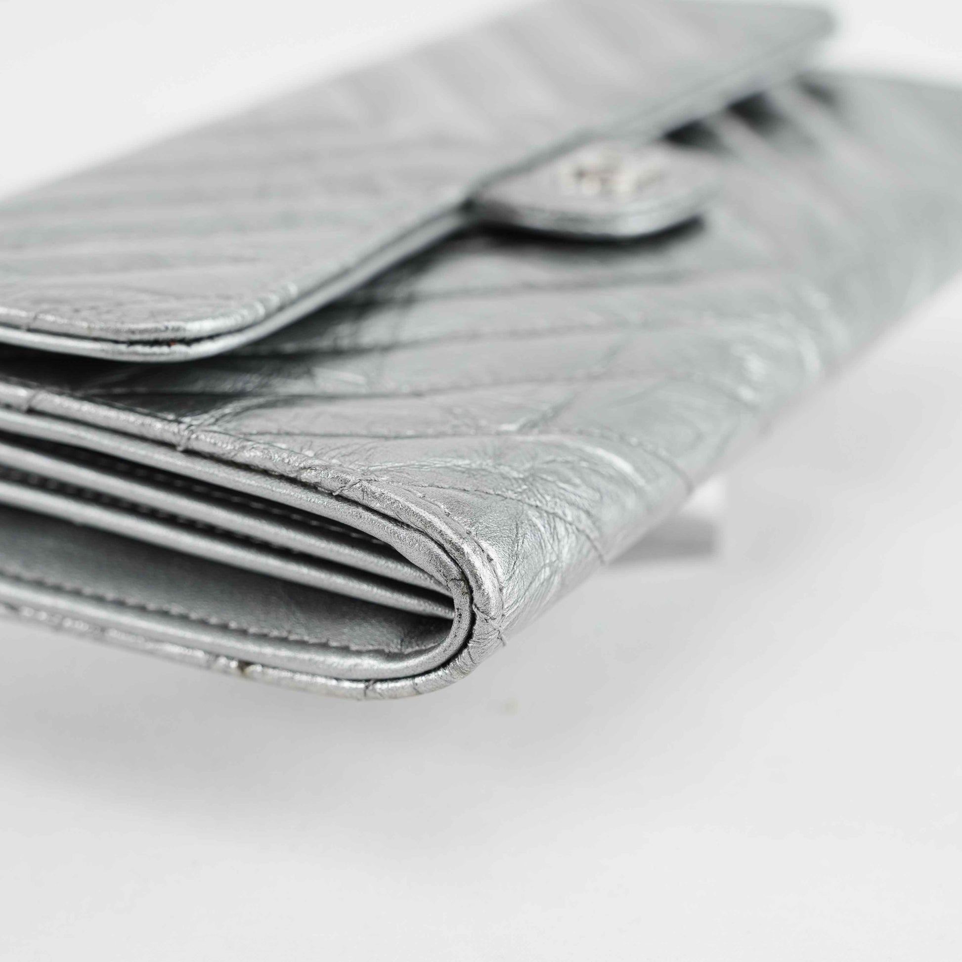 Step into luxury with this striking Chanel wallet crafted in a shimmering silver patent leather with a distinctive quilted chevron pattern. The sleek silhouette is elevated with a signature CC adorned closure flap in silver-tone hardware, adding an instantly recognizable touch of sophistication.