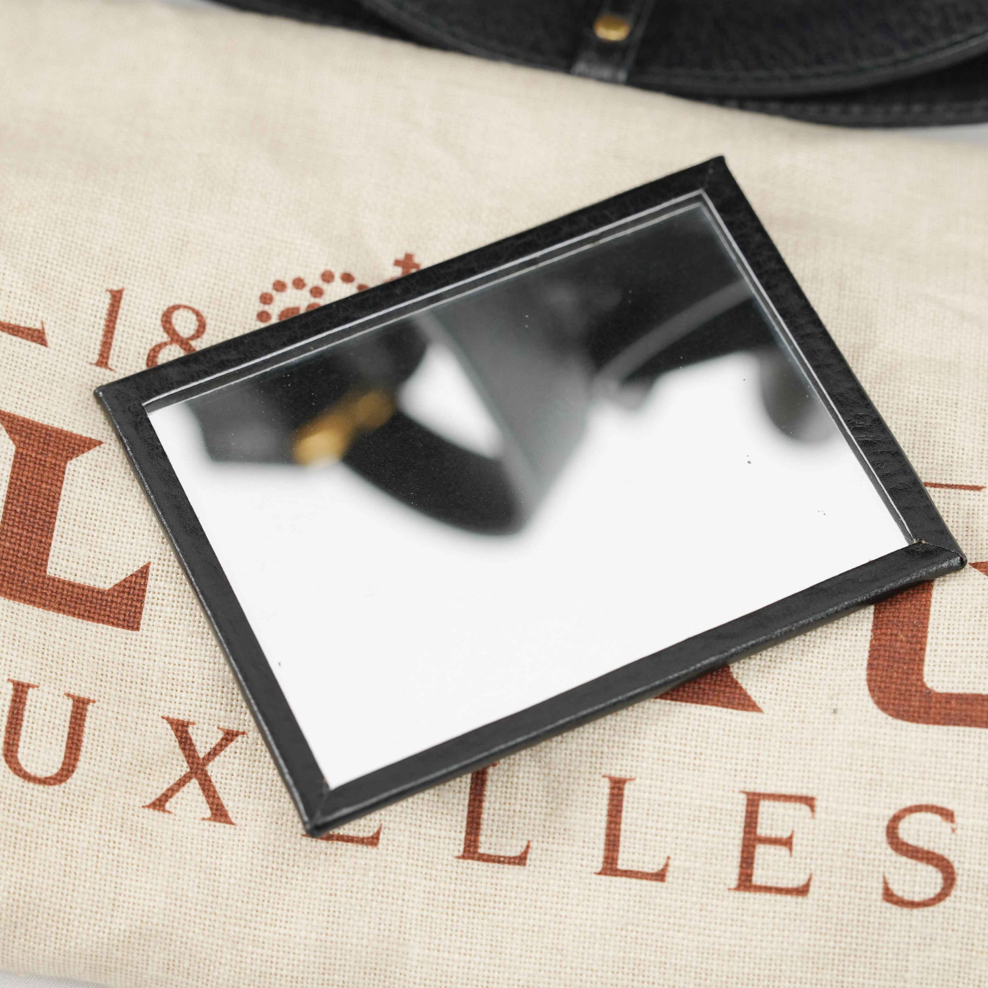 The interior is lined with black suede and includes a leather zip pocket, while the spacious design makes it ideal for daily essentials. It comes complete with its original dust bag and matching leather-framed mirror for on-the-go convenience. A versatile leather strap allows the bag to be worn comfortably over the shoulder or crossbody.