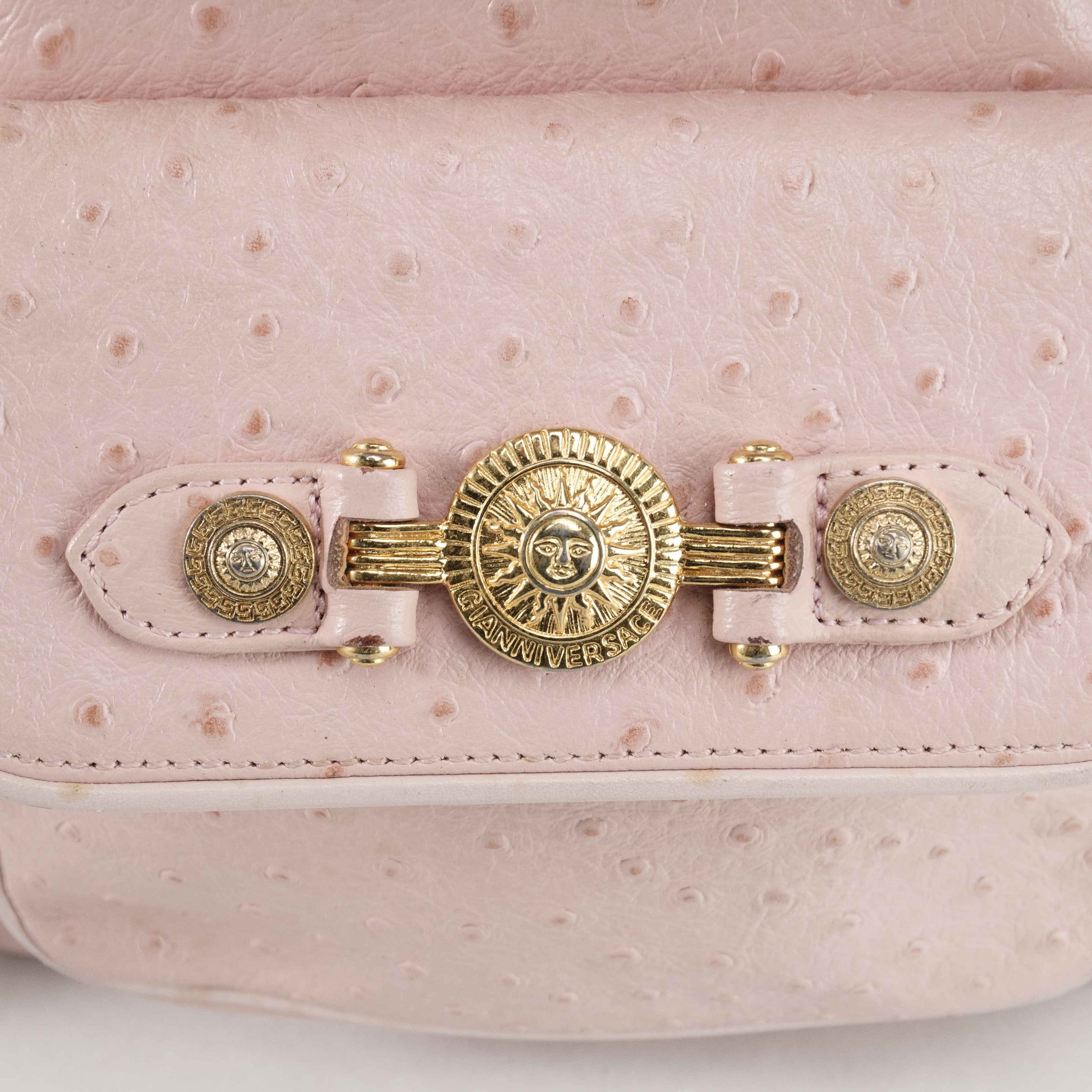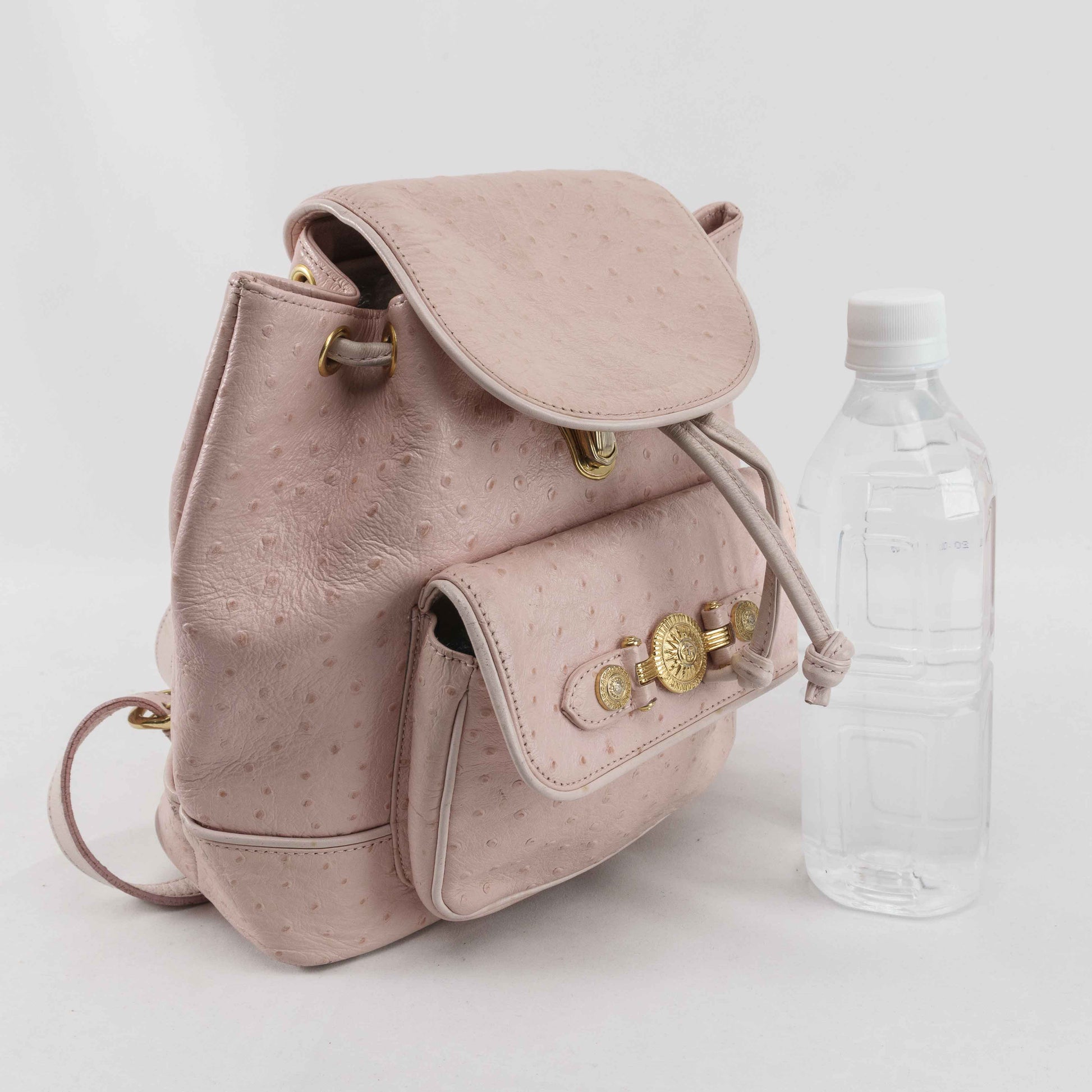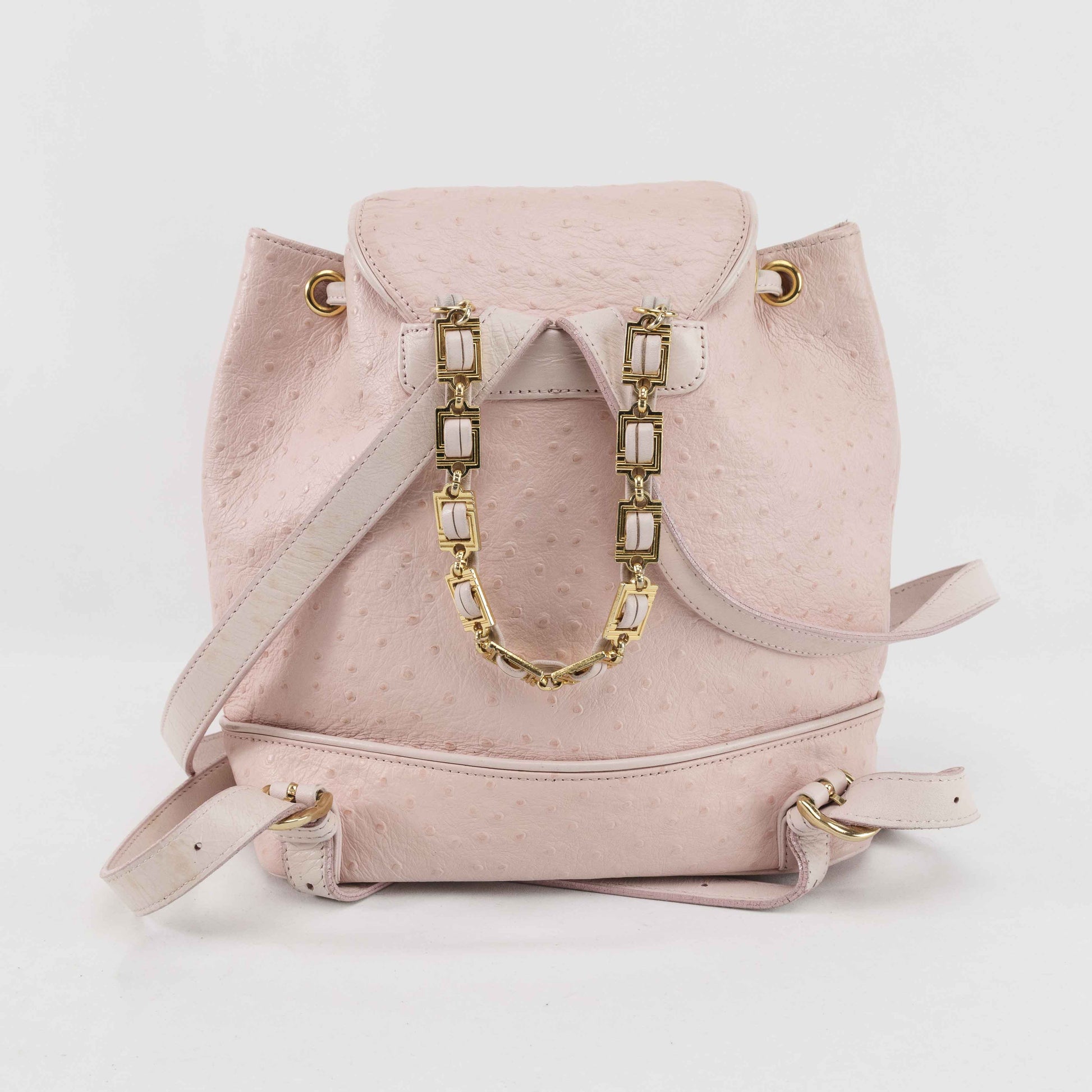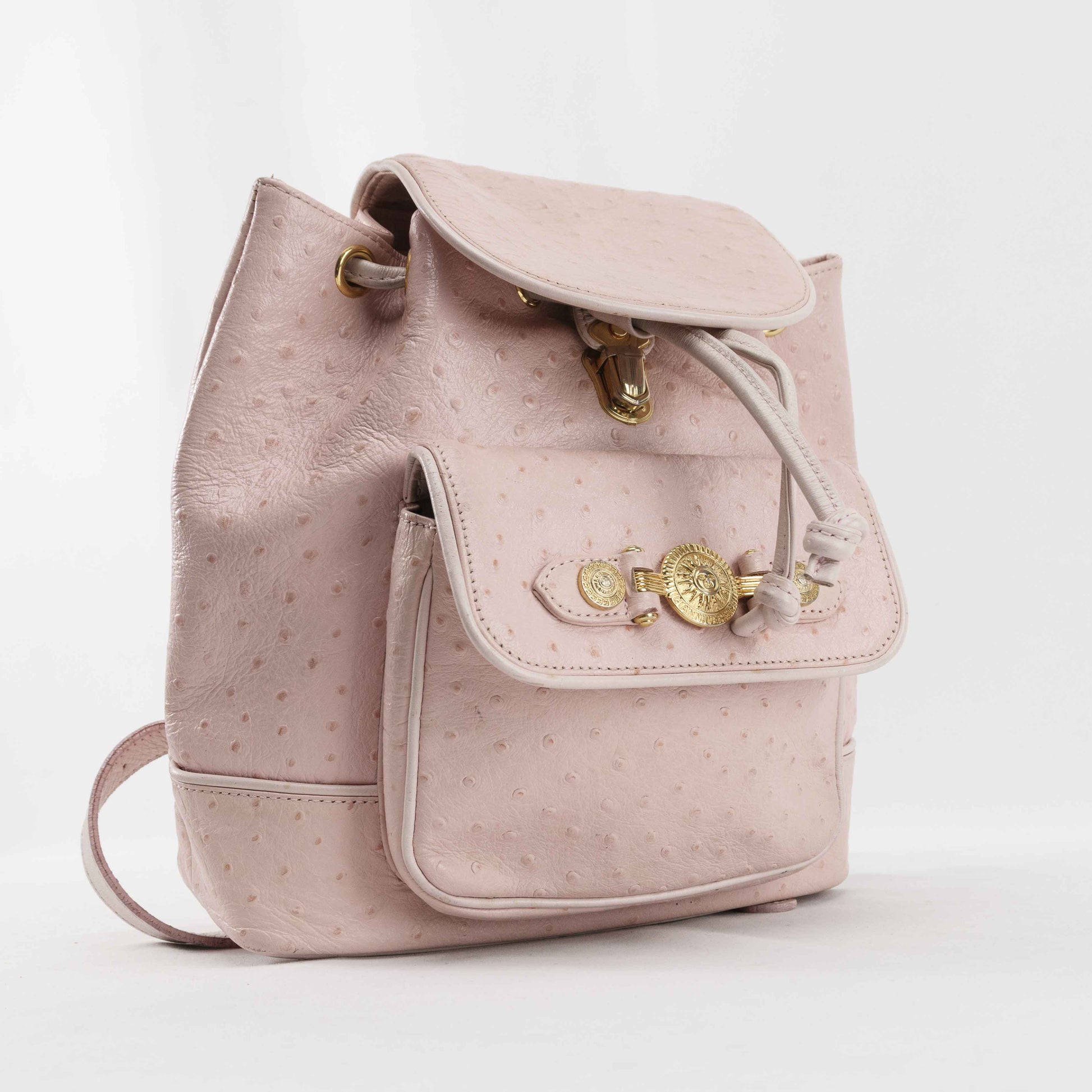 This Gianni Versace backpack is a sophisticated and rare vintage piece, crafted from luxurious pink ostrich-embossed leather. The structured yet slightly slouchy silhouette is designed for both elegance and practicality, featuring a drawstring closure complemented by a flap-top with a gold-tone push-lock clasp for added security.