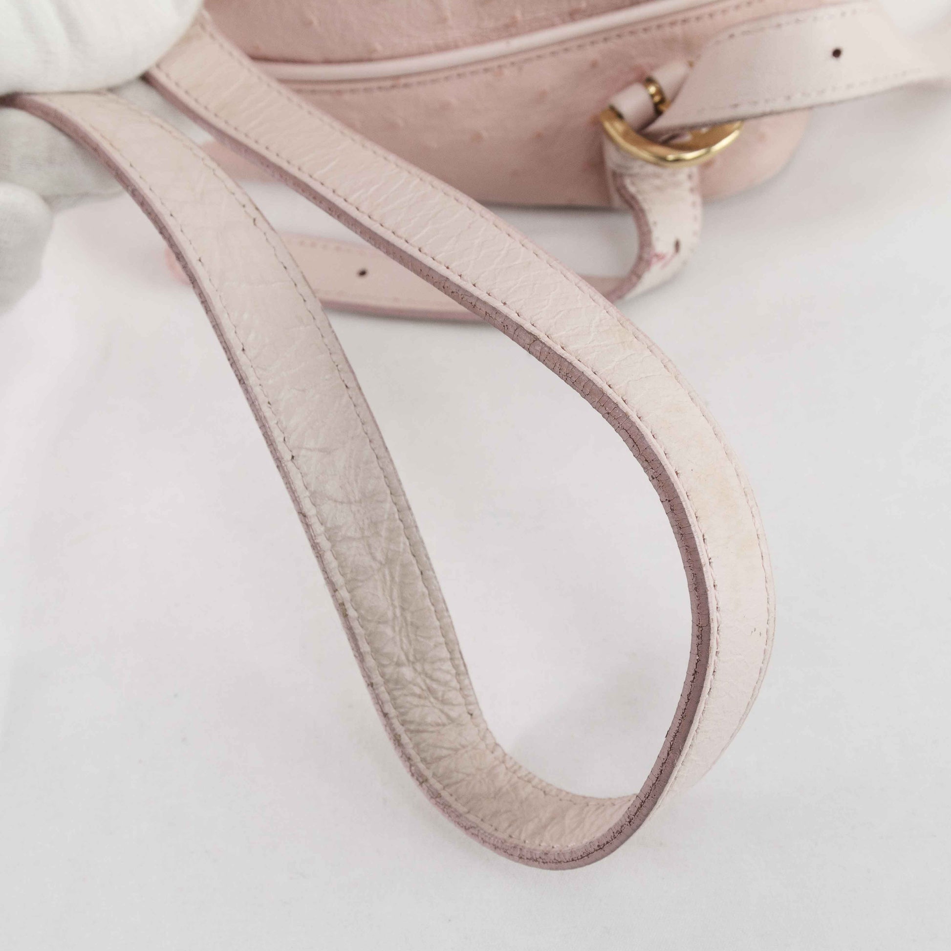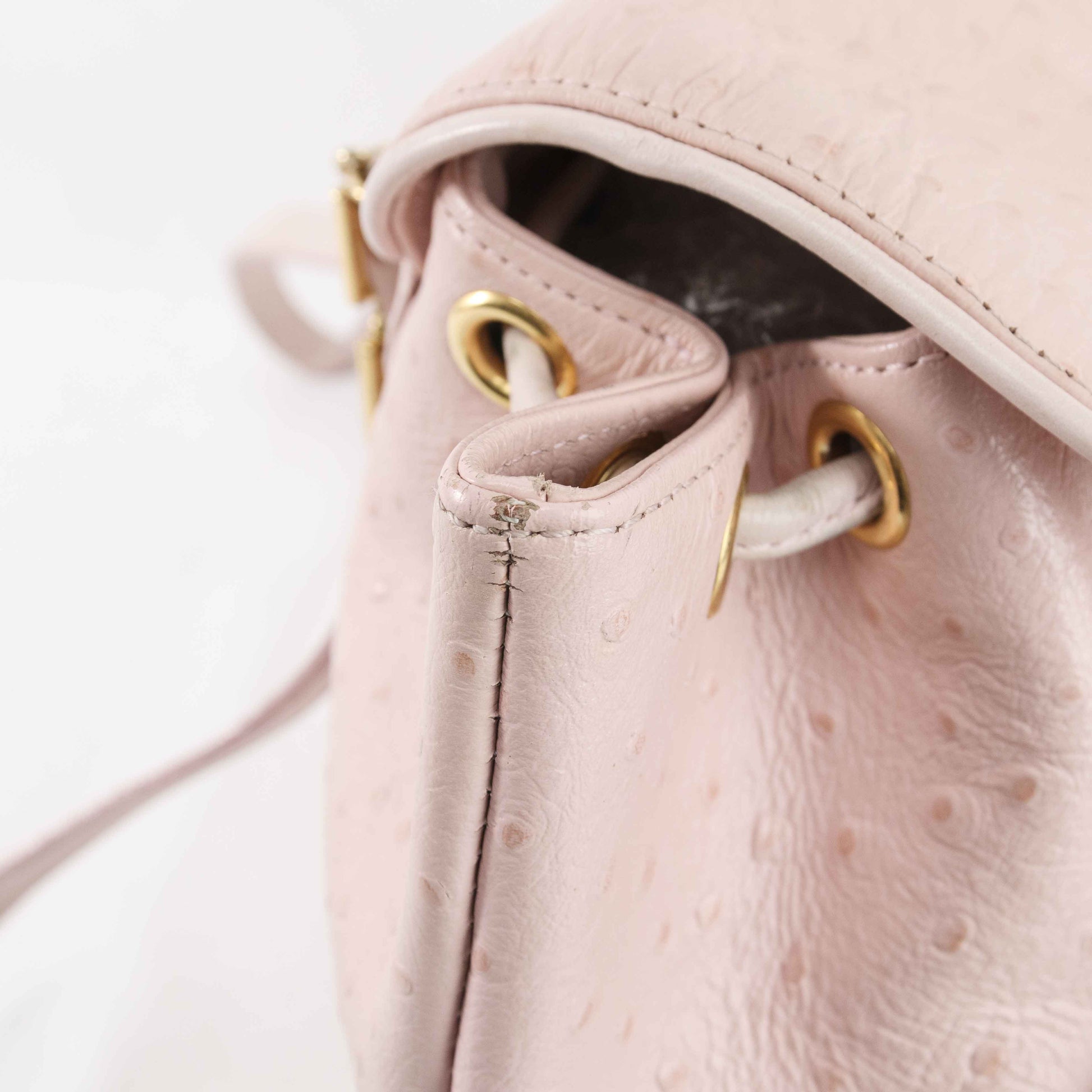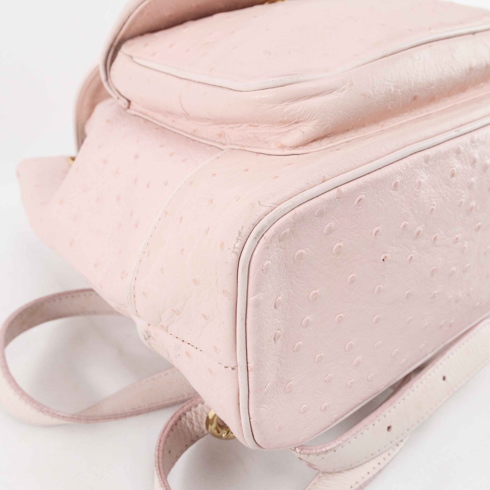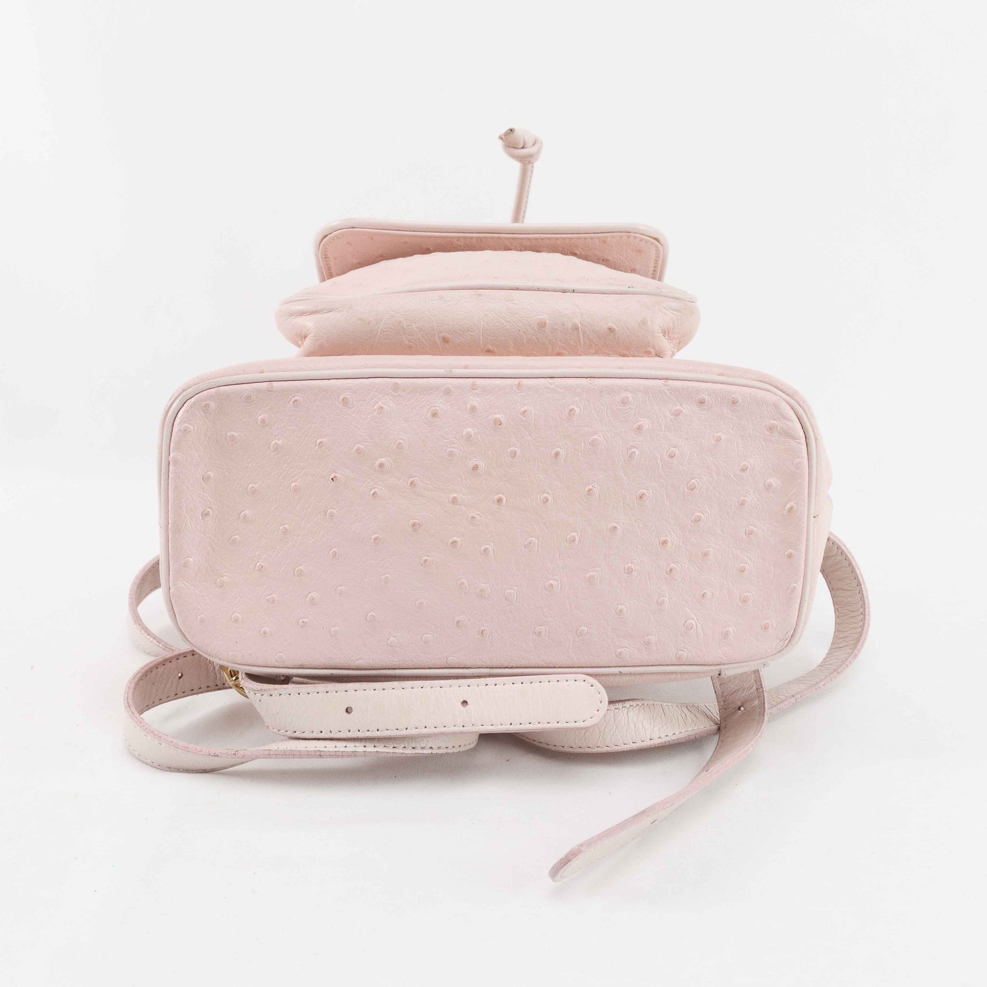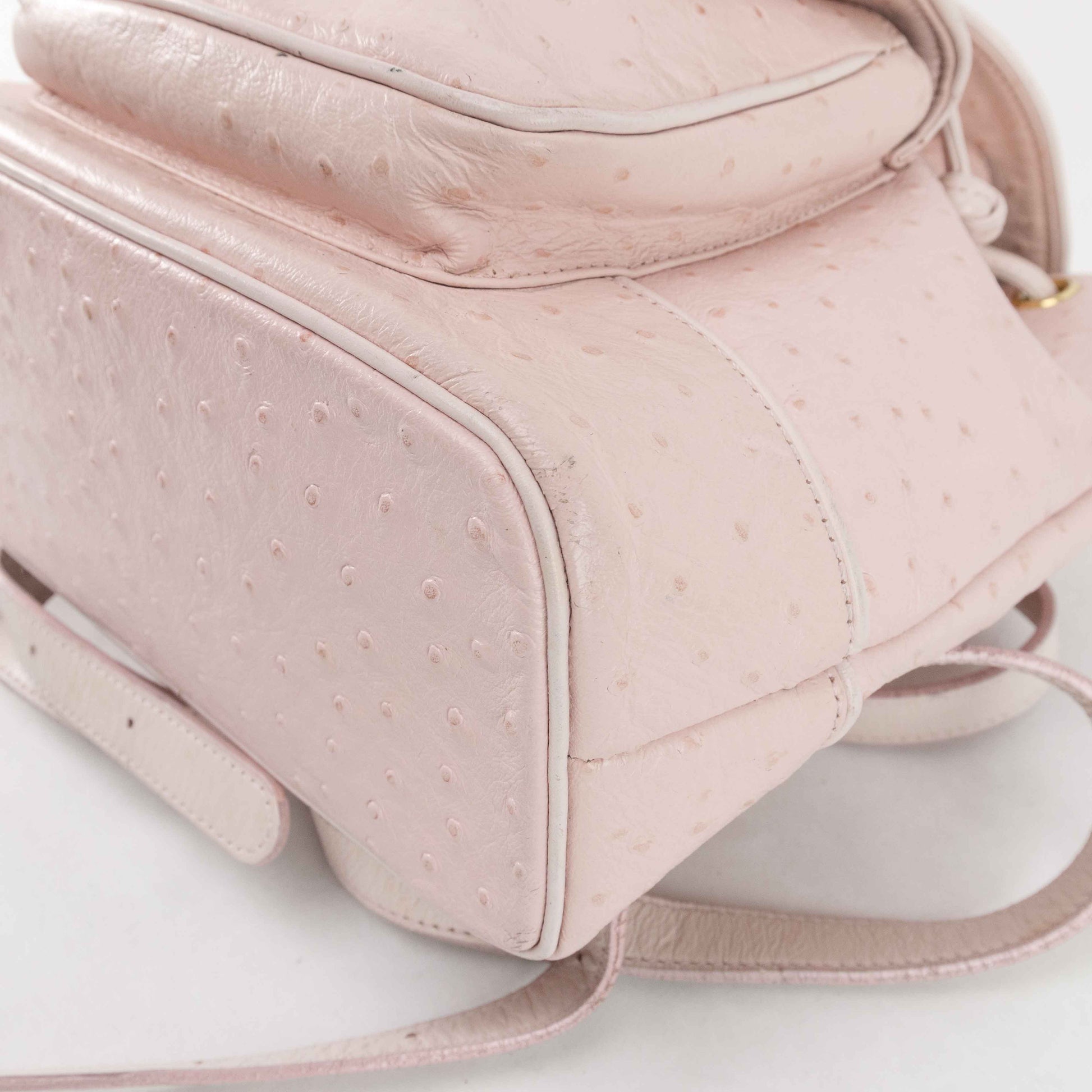 This Gianni Versace backpack is a sophisticated and rare vintage piece, crafted from luxurious pink ostrich-embossed leather. The structured yet slightly slouchy silhouette is designed for both elegance and practicality, featuring a drawstring closure complemented by a flap-top with a gold-tone push-lock clasp for added security.
