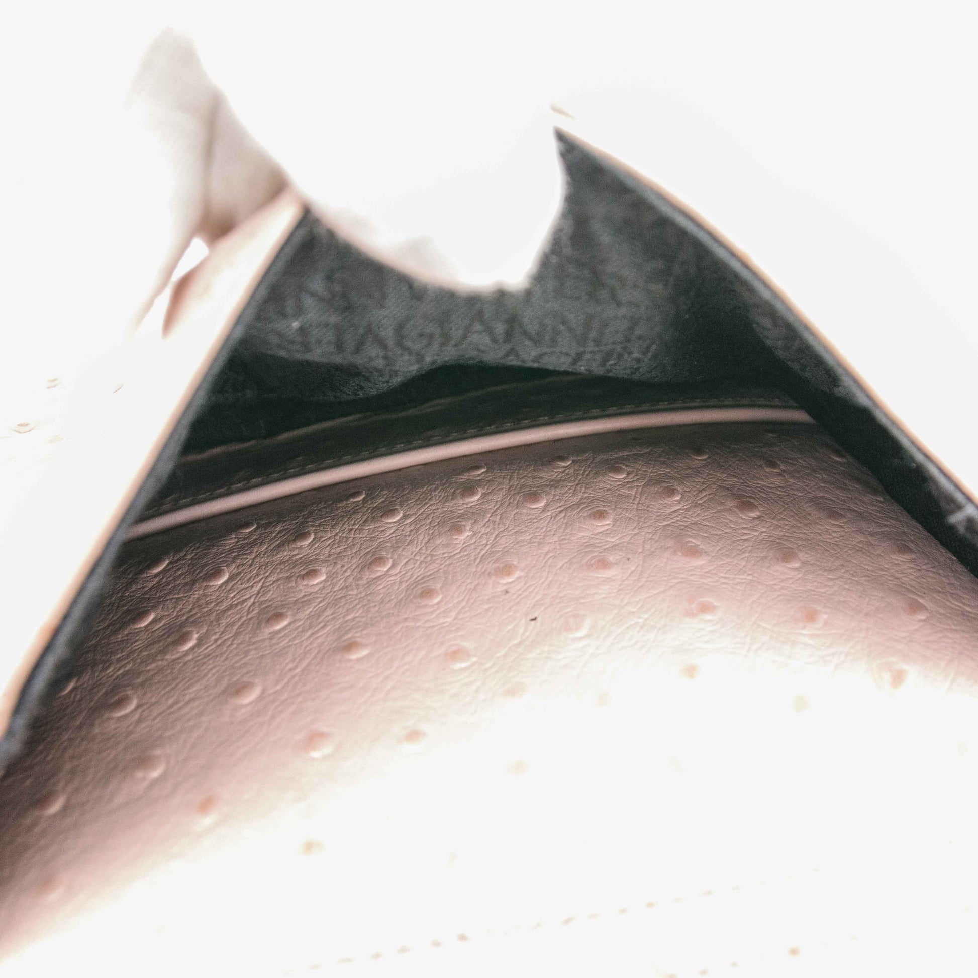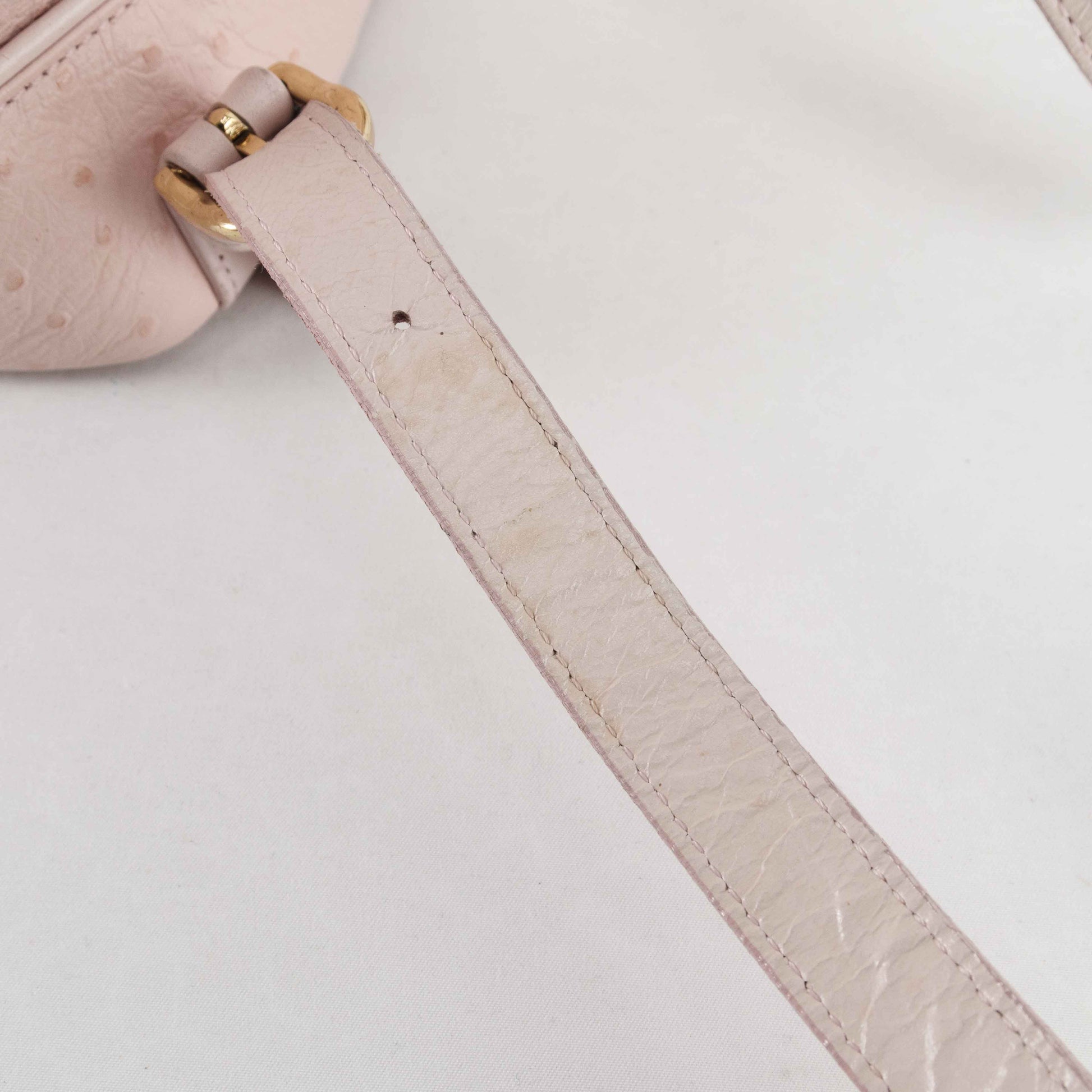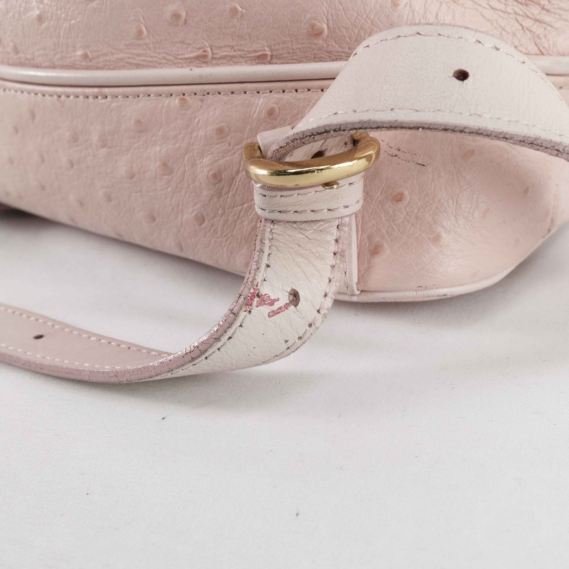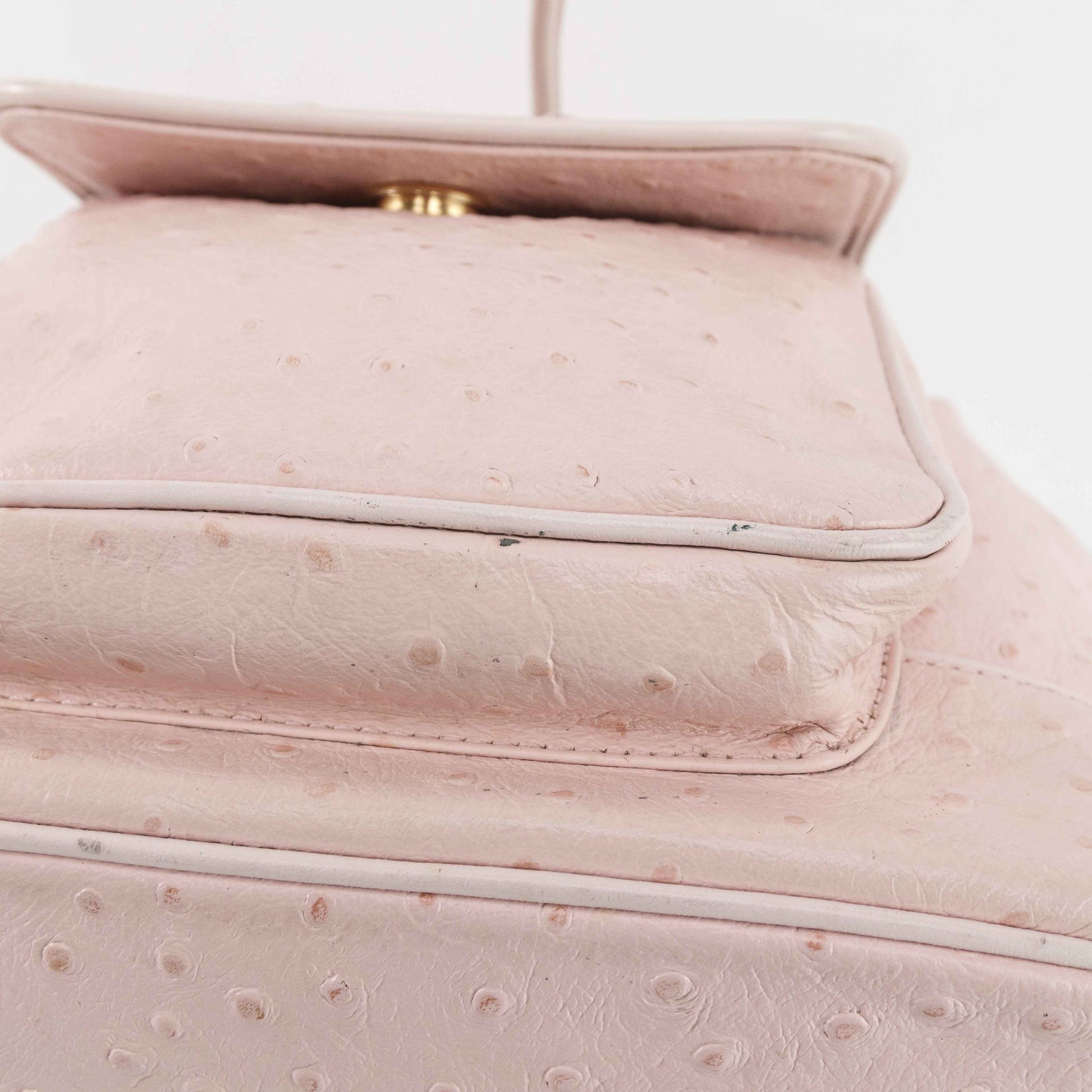 This Gianni Versace backpack is a sophisticated and rare vintage piece, crafted from luxurious pink ostrich-embossed leather. The structured yet slightly slouchy silhouette is designed for both elegance and practicality, featuring a drawstring closure complemented by a flap-top with a gold-tone push-lock clasp for added security.