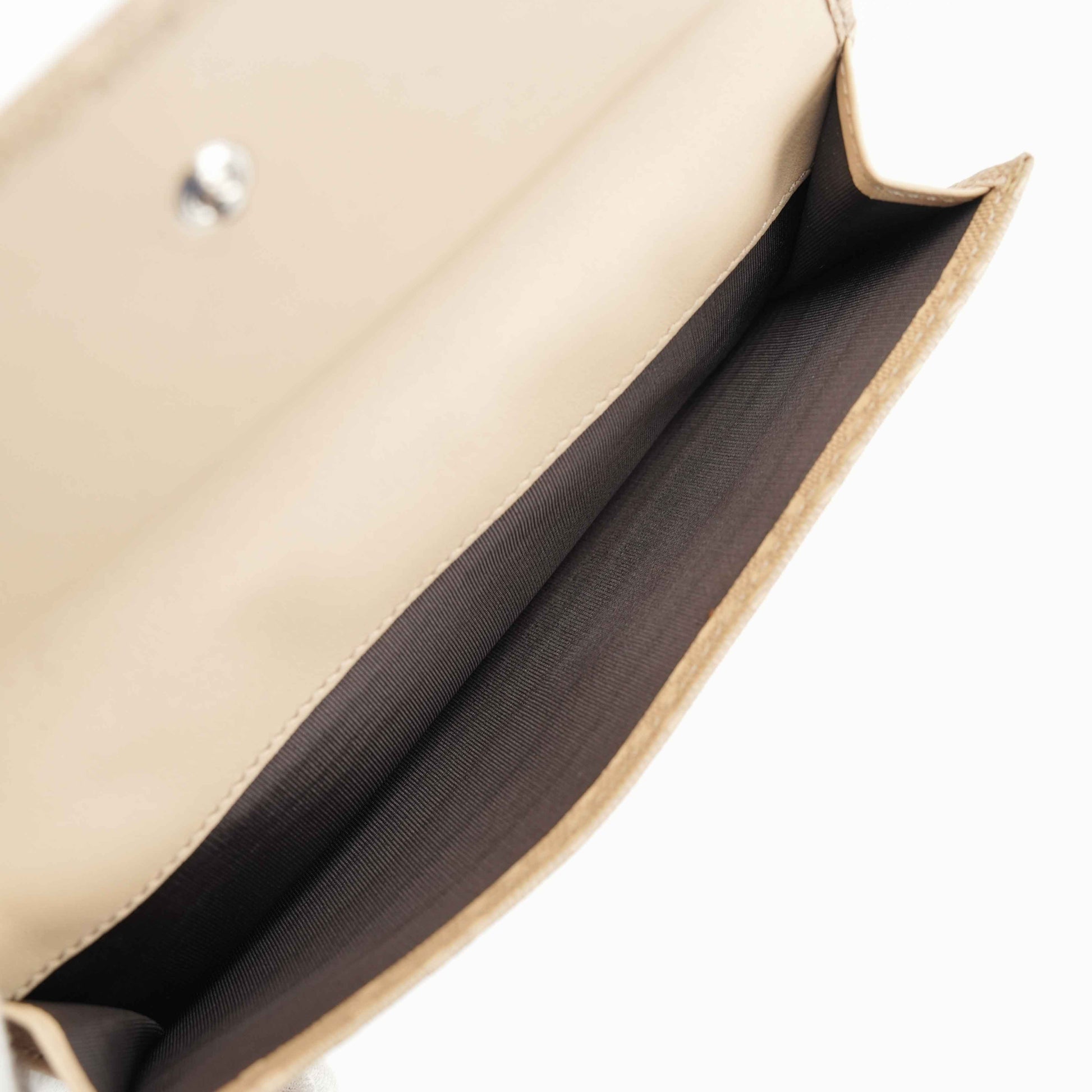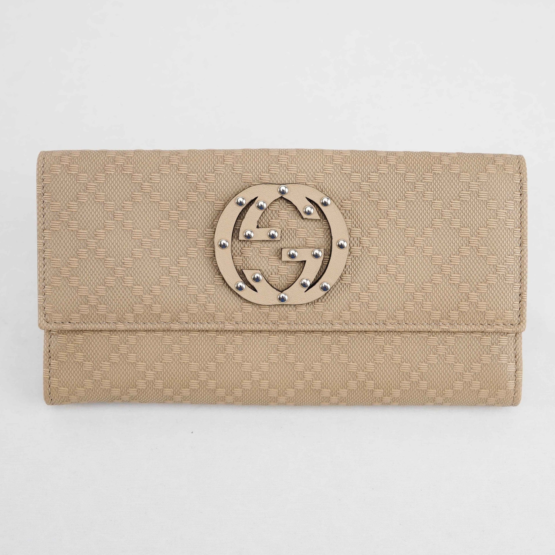 Add a touch of refined elegance to your essentials with this authentic Gucci wallet, crafted in Italy from beige jacquard canvas and trimmed with leather. This piece features the iconic interlocking GG logo on the flap, detailed with silver-tone studs for a modern twist on a classic design.