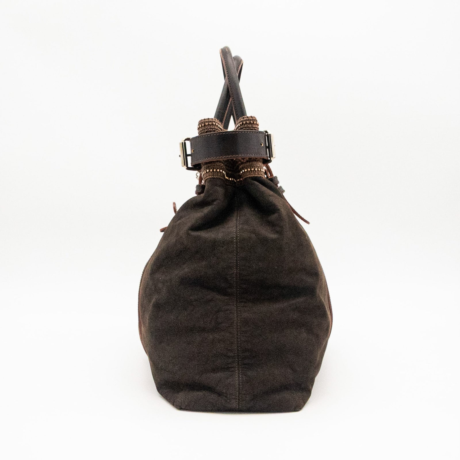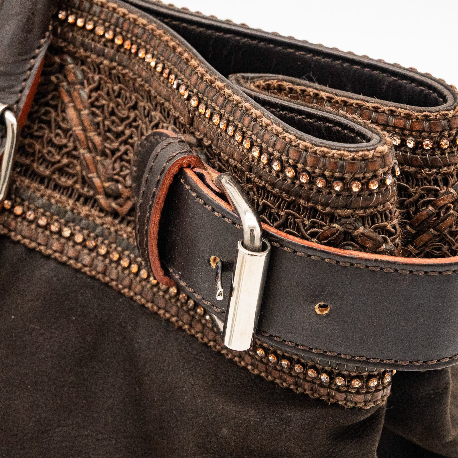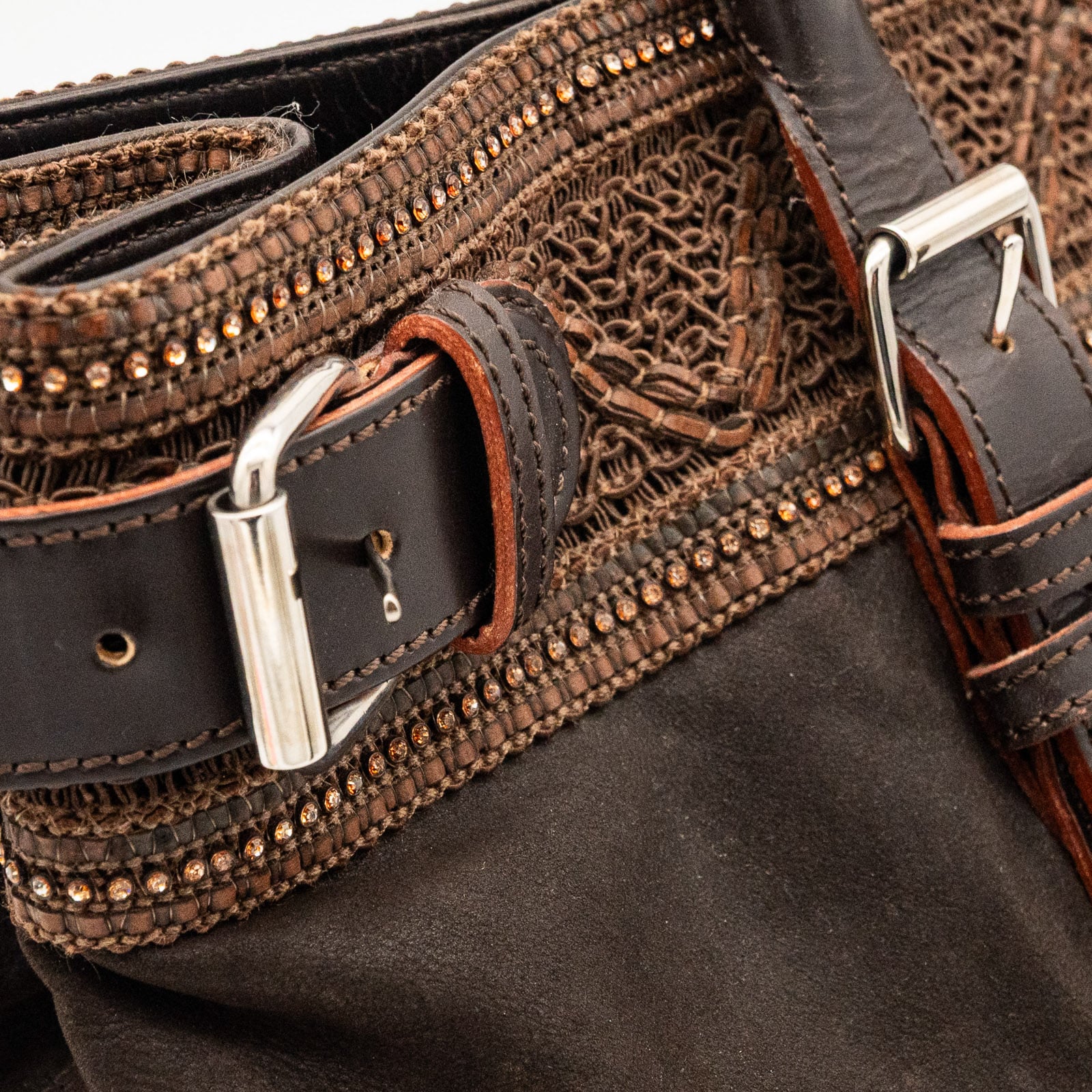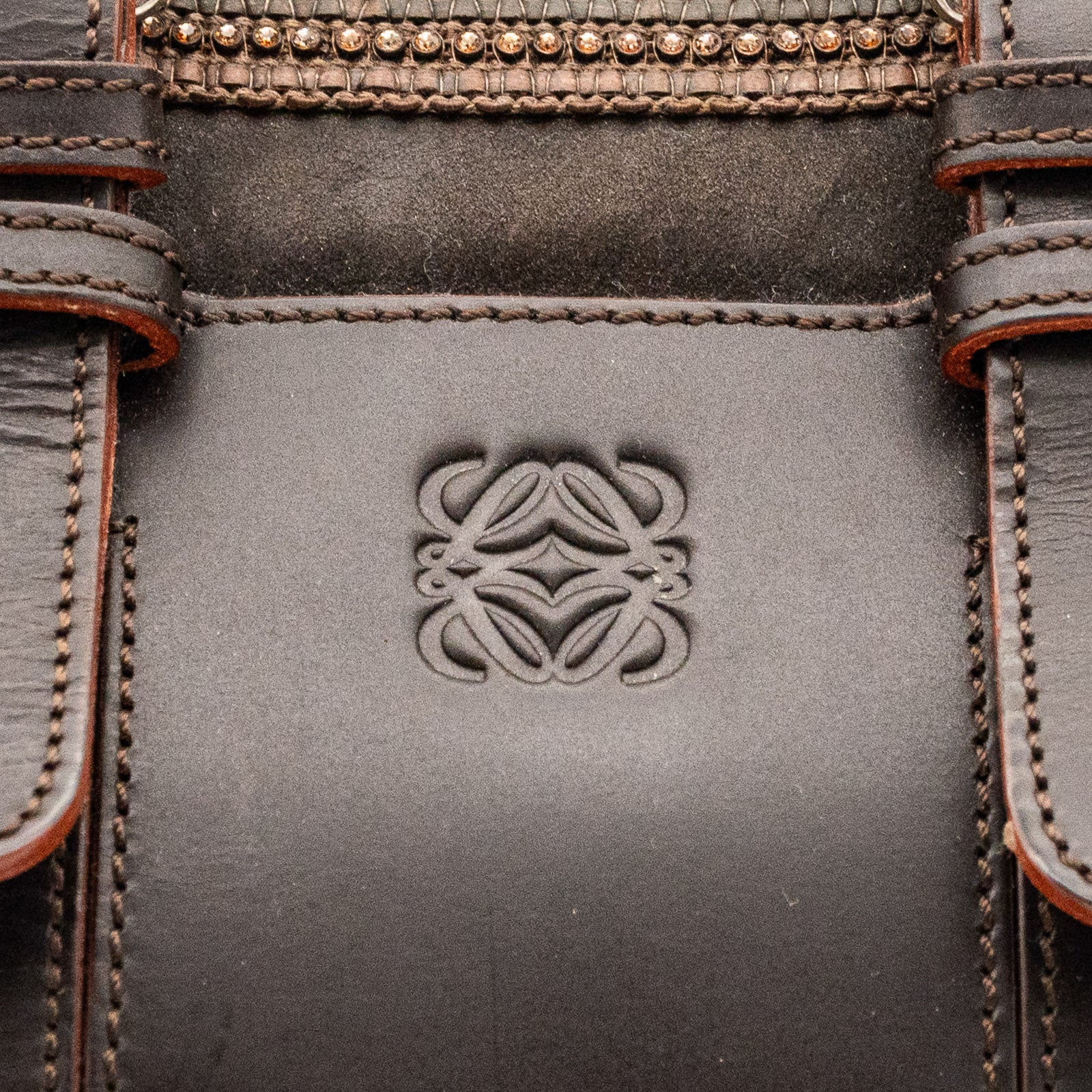 The bag is made from plush dark espresso-brown suede that feels sumptuously soft to the touch, contrasted beautifully with smooth calfskin leather handles, central panel, and signature “X” base reinforcement. The front bears the iconic debossed Loewe anagram, while a hand-woven leather braid adorned with tiny metallic studs wraps elegantly across the top — a detail exclusive to this anniversary edition. Flanked by adjustable belt-style straps with polished silver-tone buckles, the design strikes a refined balance between bohemian spirit and sophisticated structure.