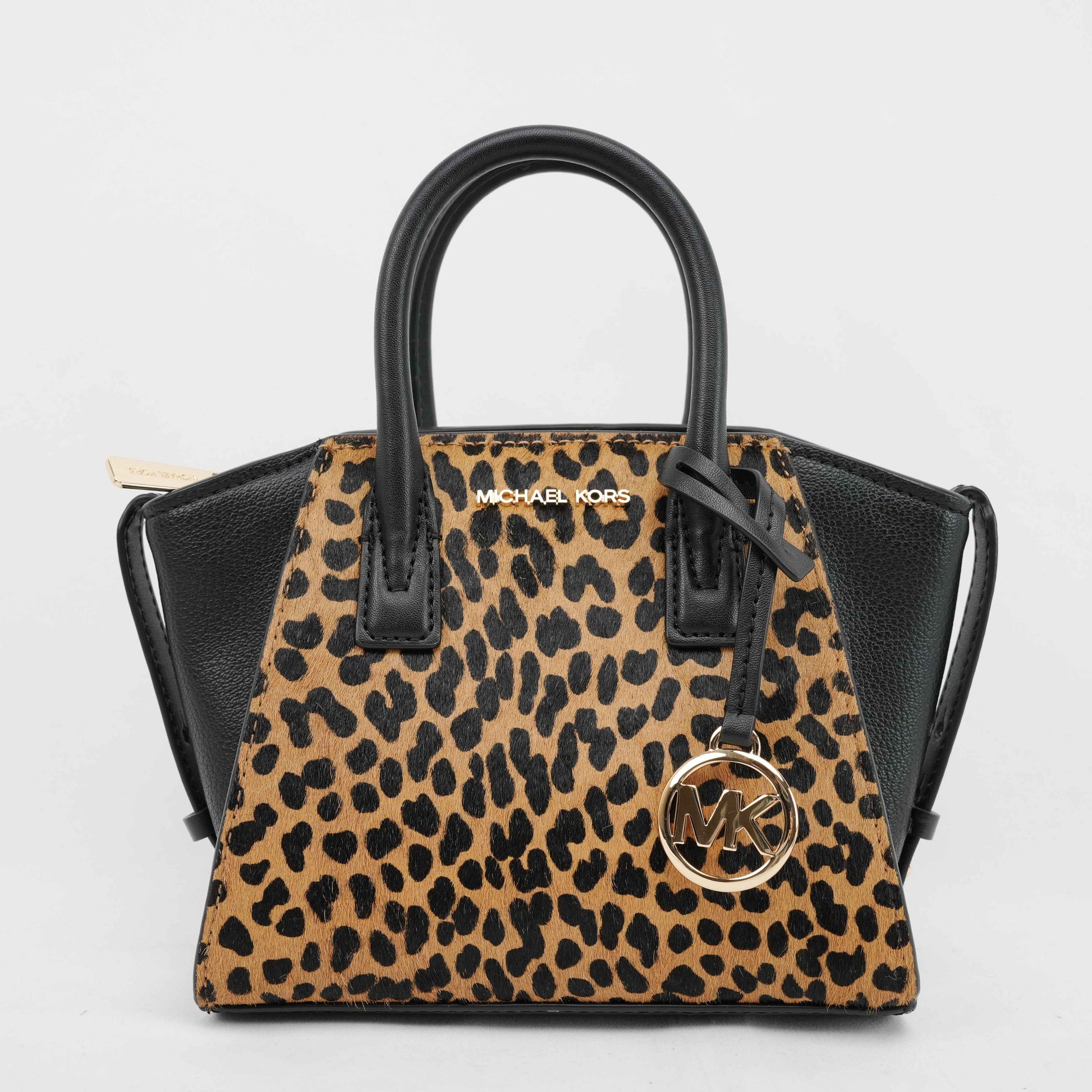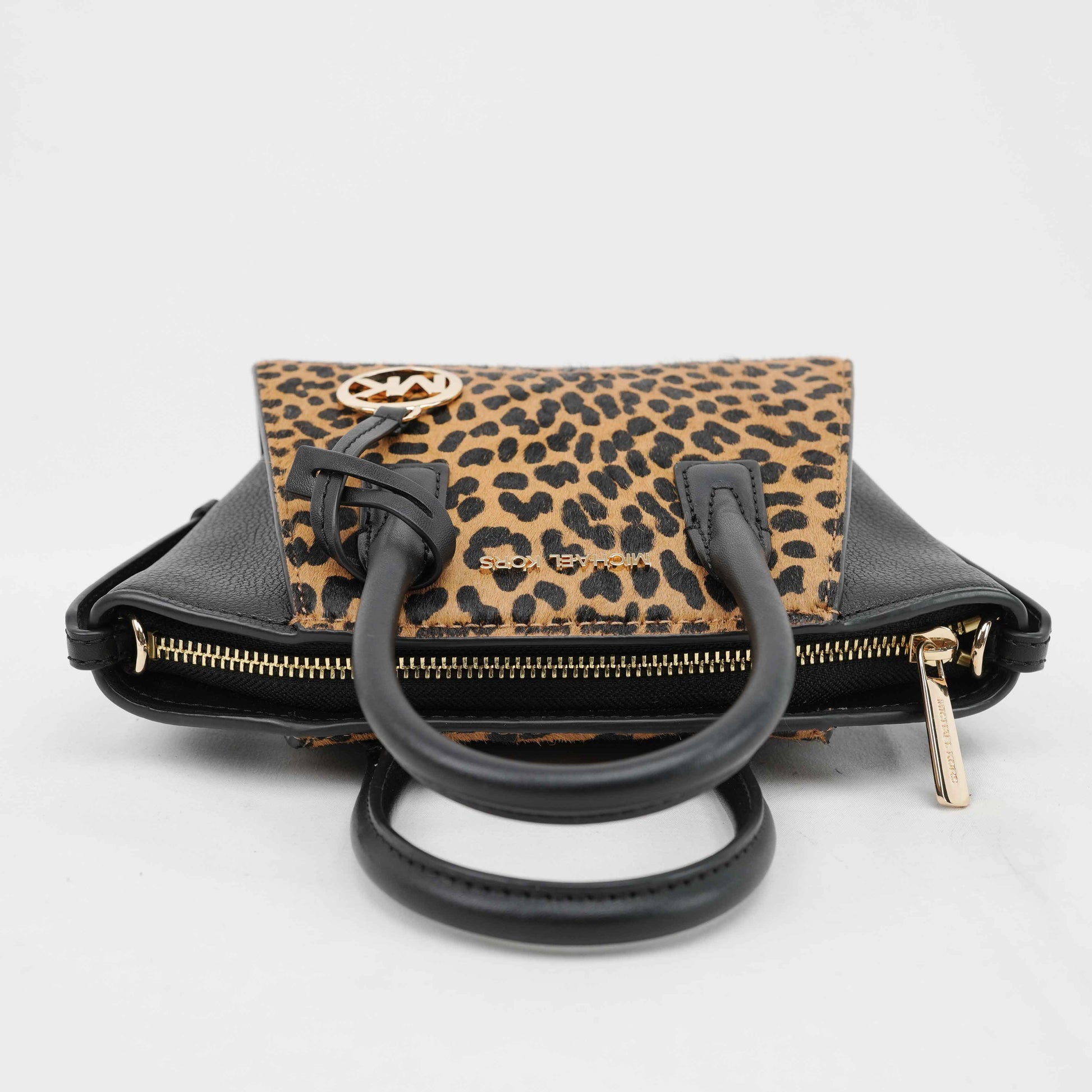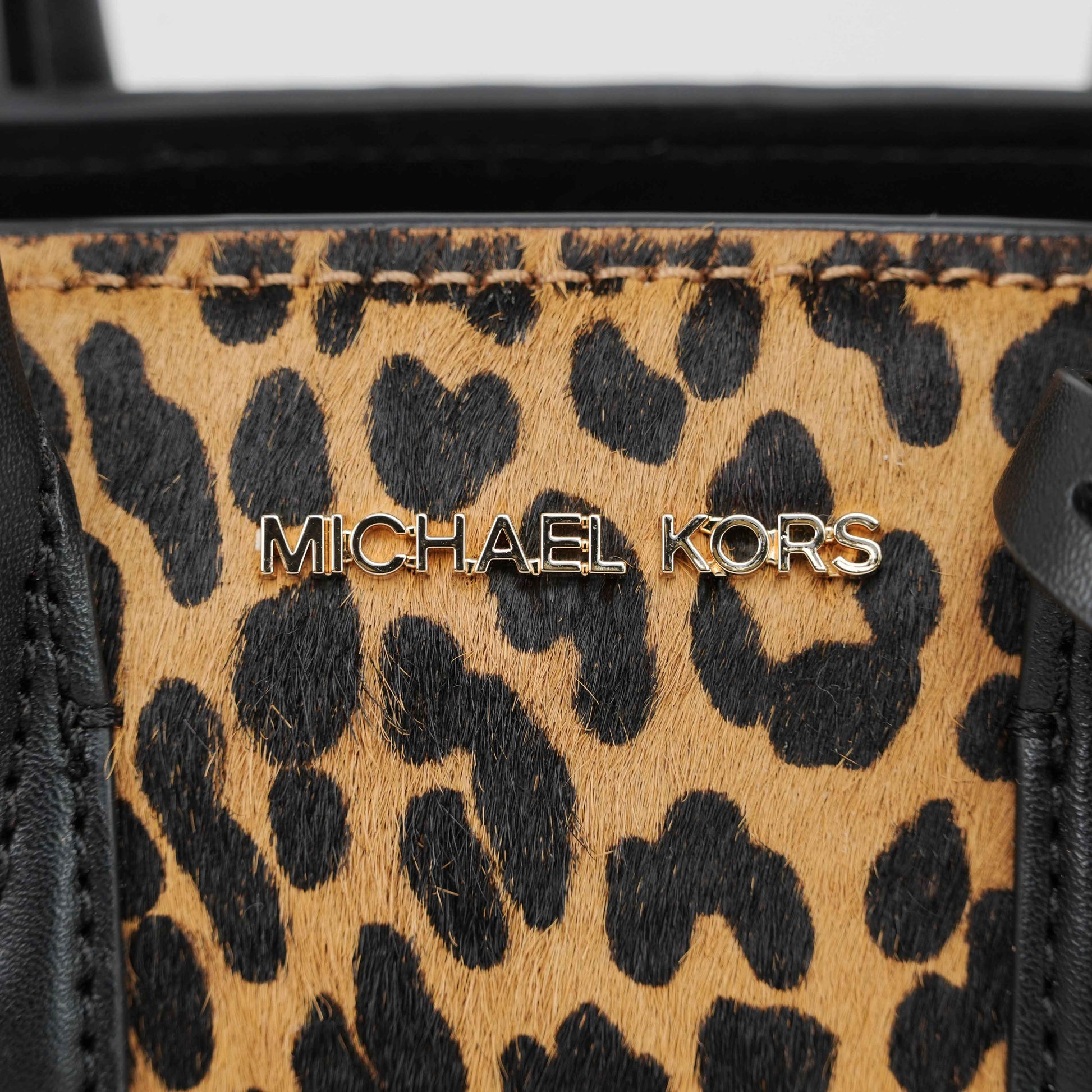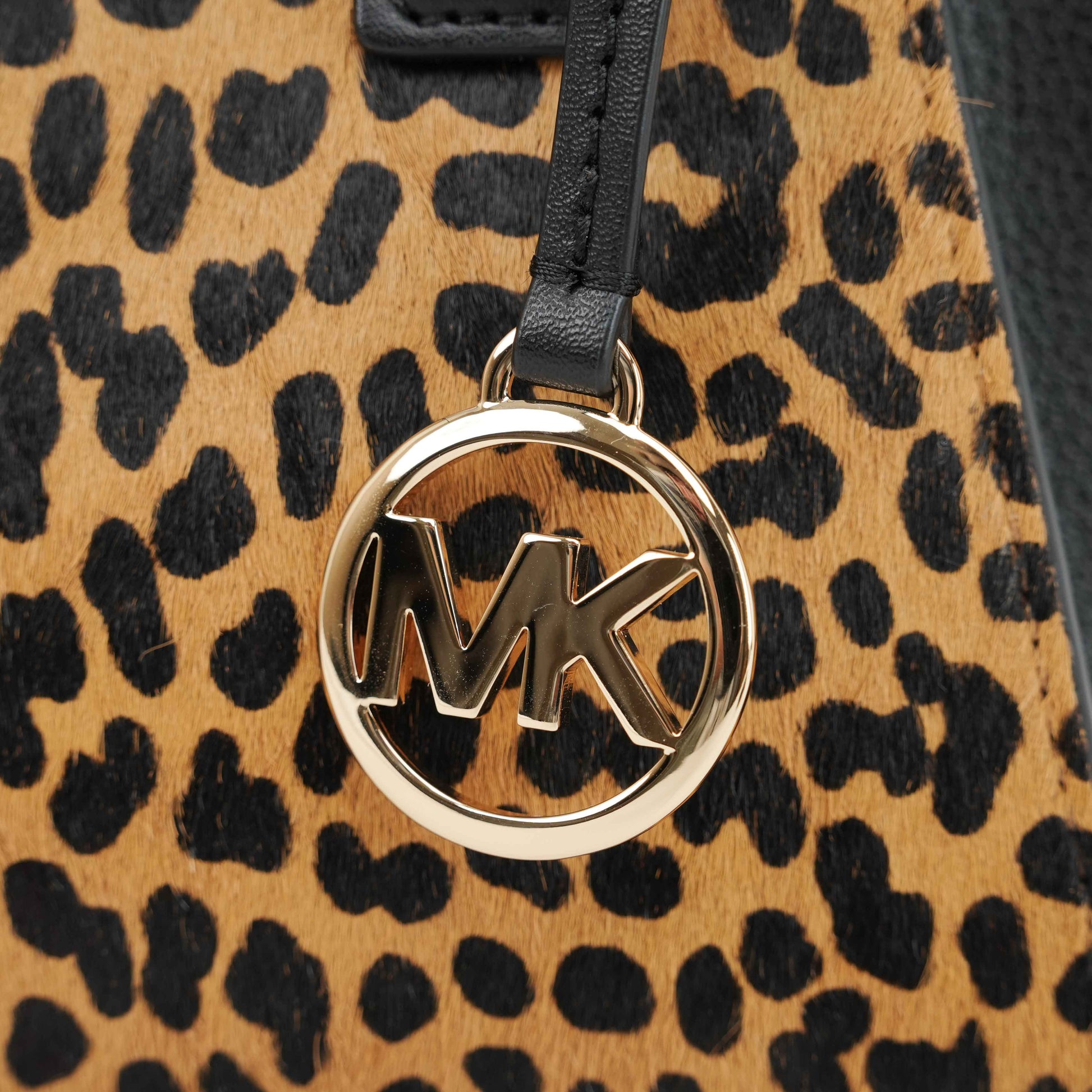 This striking Michael Kors satchel combines bold style with everyday practicality. Crafted from black grained leather and leopard-print faux fur panels, the structured silhouette exudes modern sophistication. Gold-tone hardware, including the iconic MK medallion charm, adds a touch of glamour.