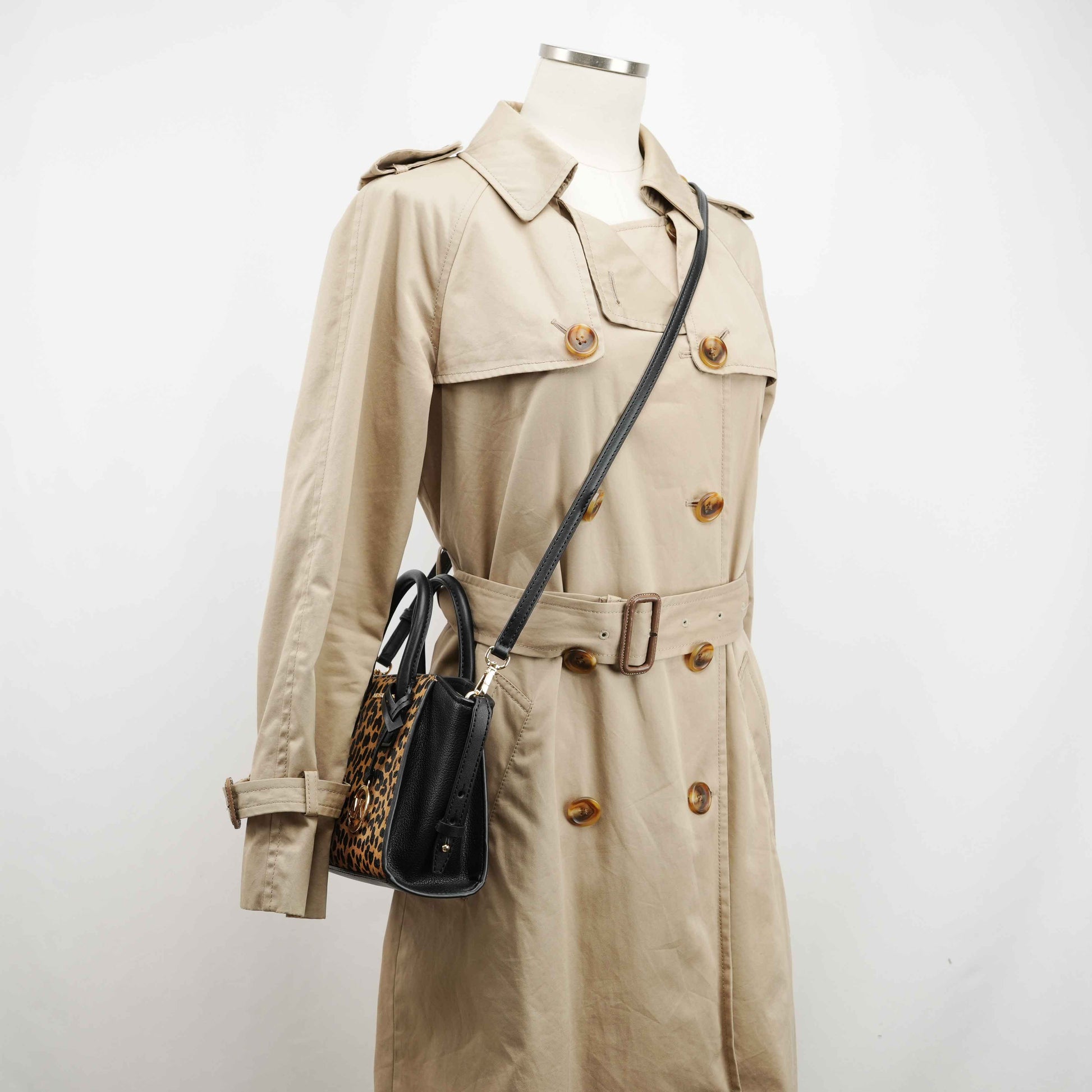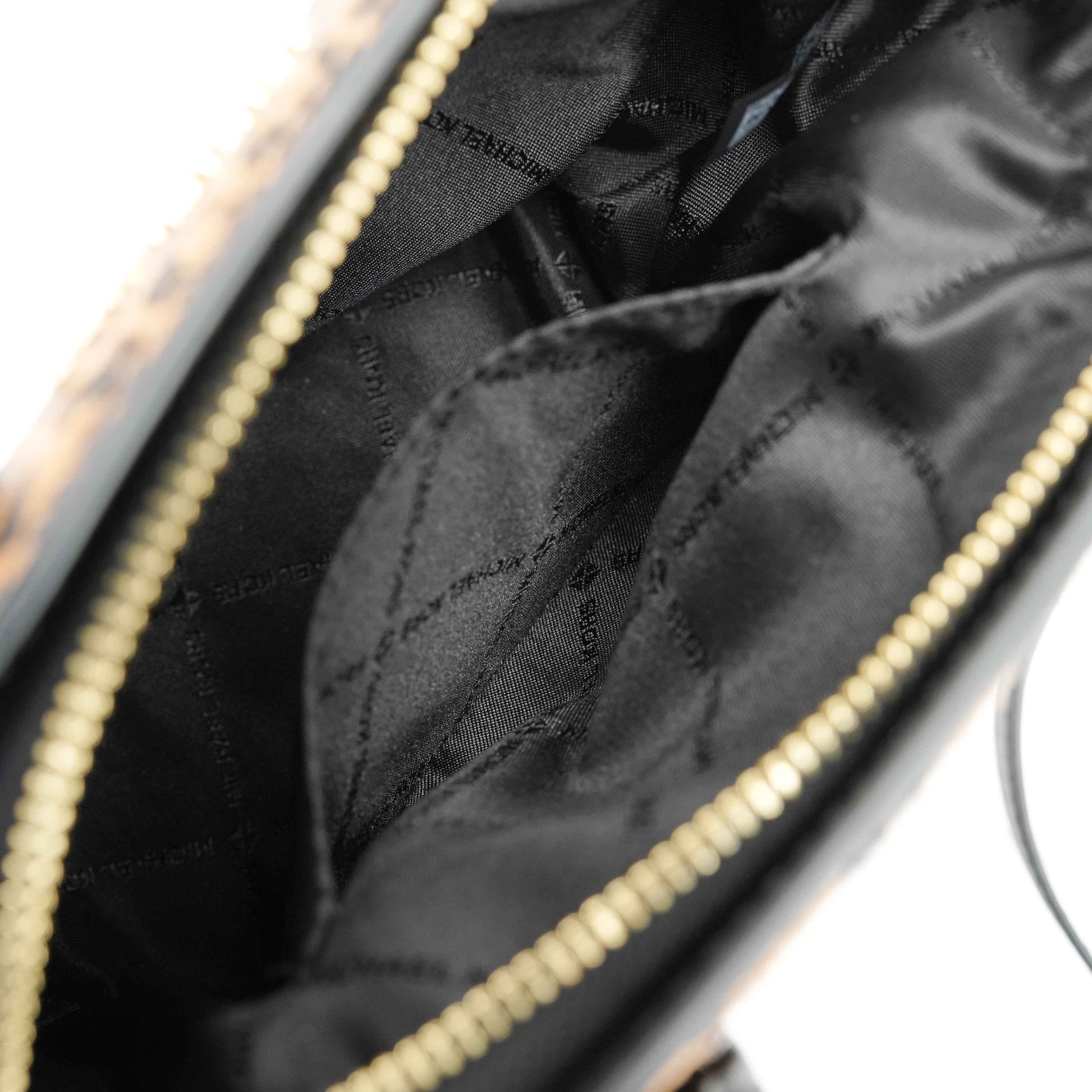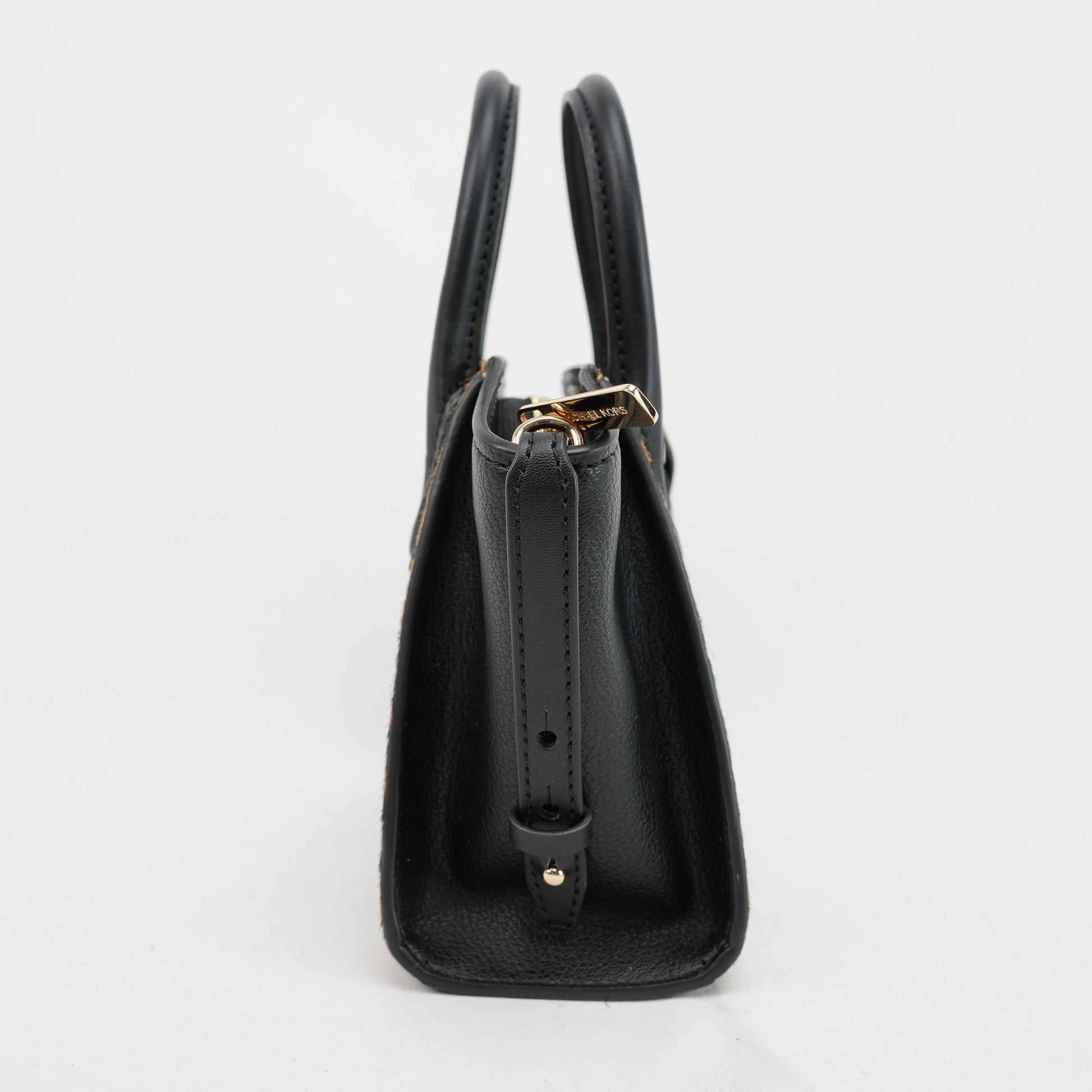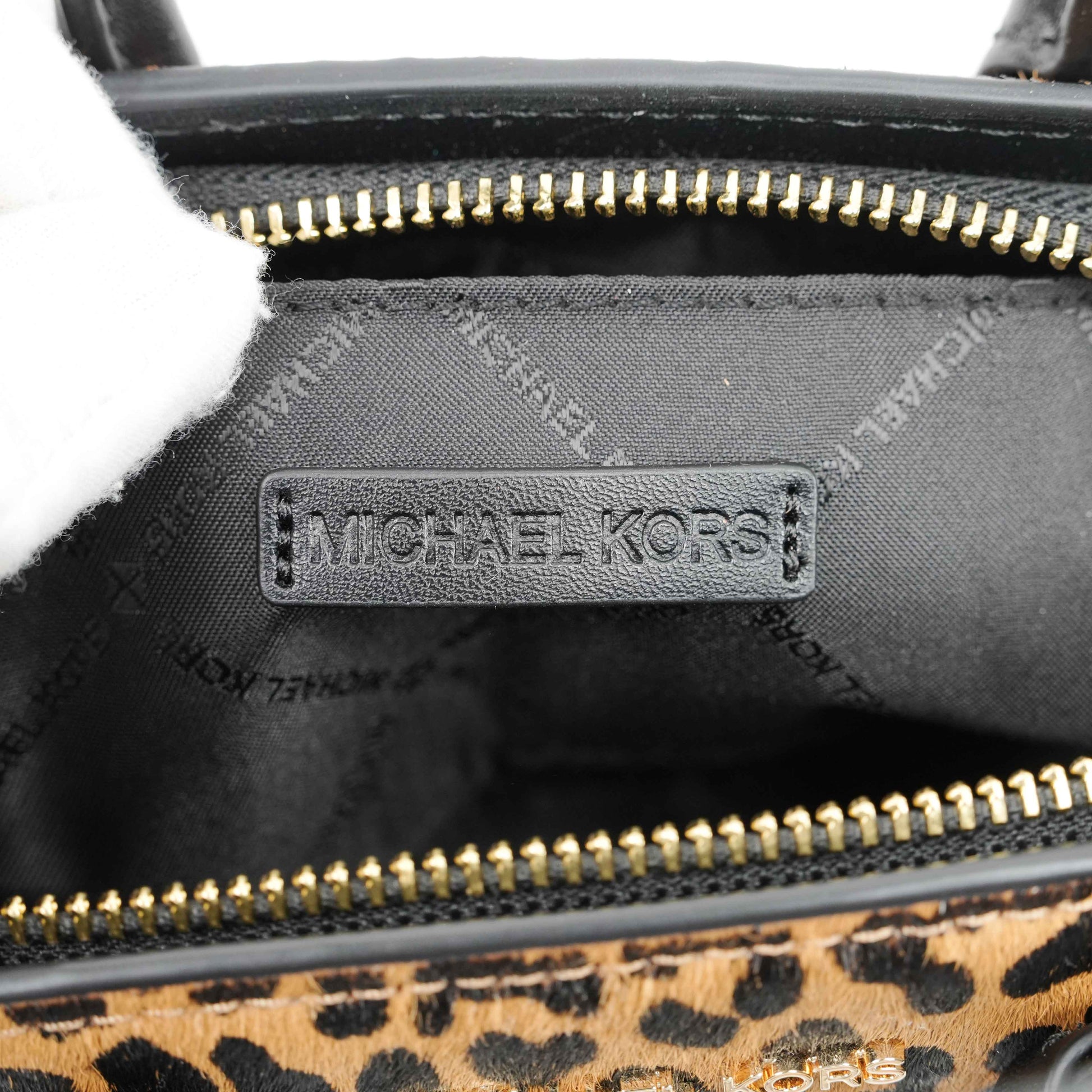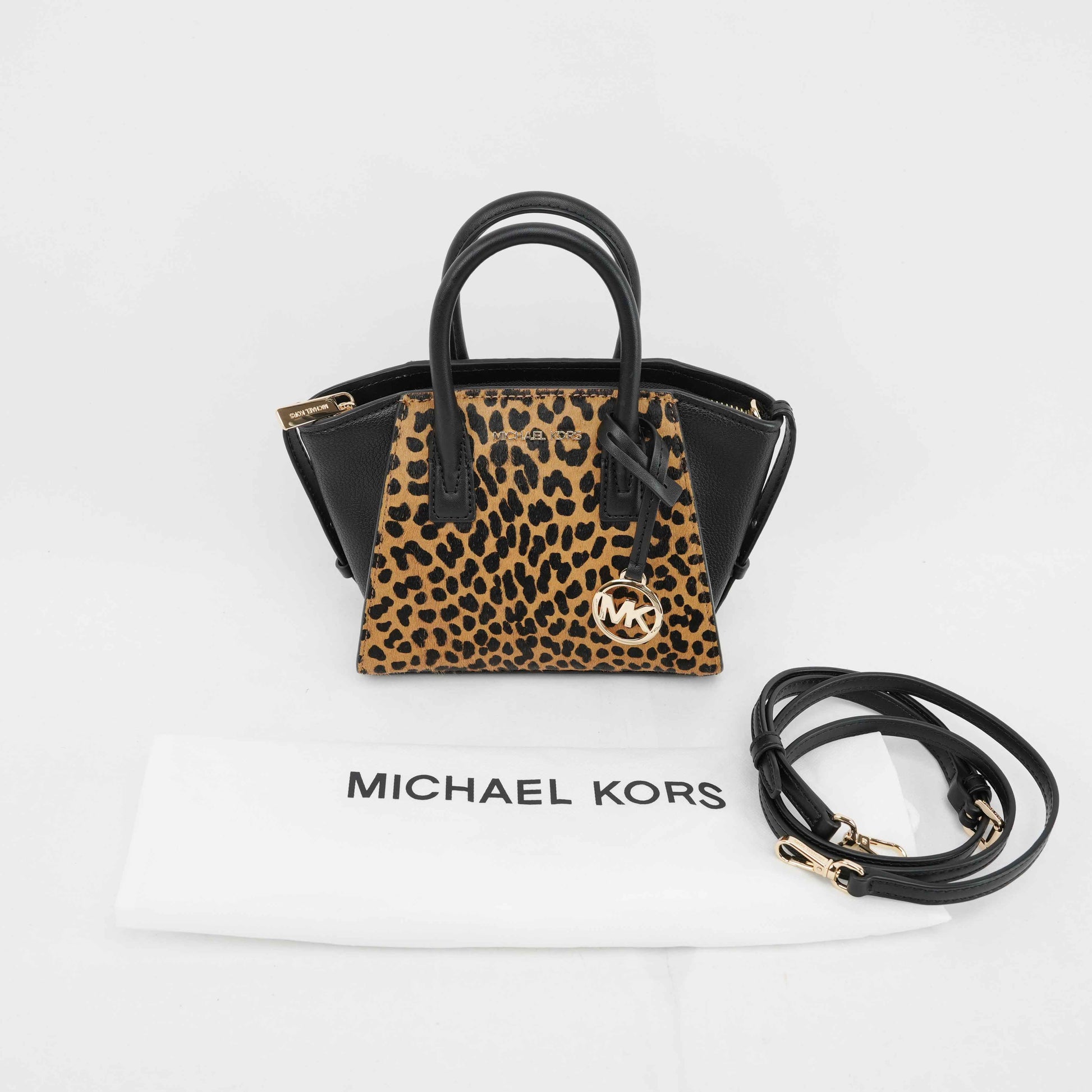 This striking Michael Kors satchel combines bold style with everyday practicality. Crafted from black grained leather and leopard-print faux fur panels, the structured silhouette exudes modern sophistication. Gold-tone hardware, including the iconic MK medallion charm, adds a touch of glamour.