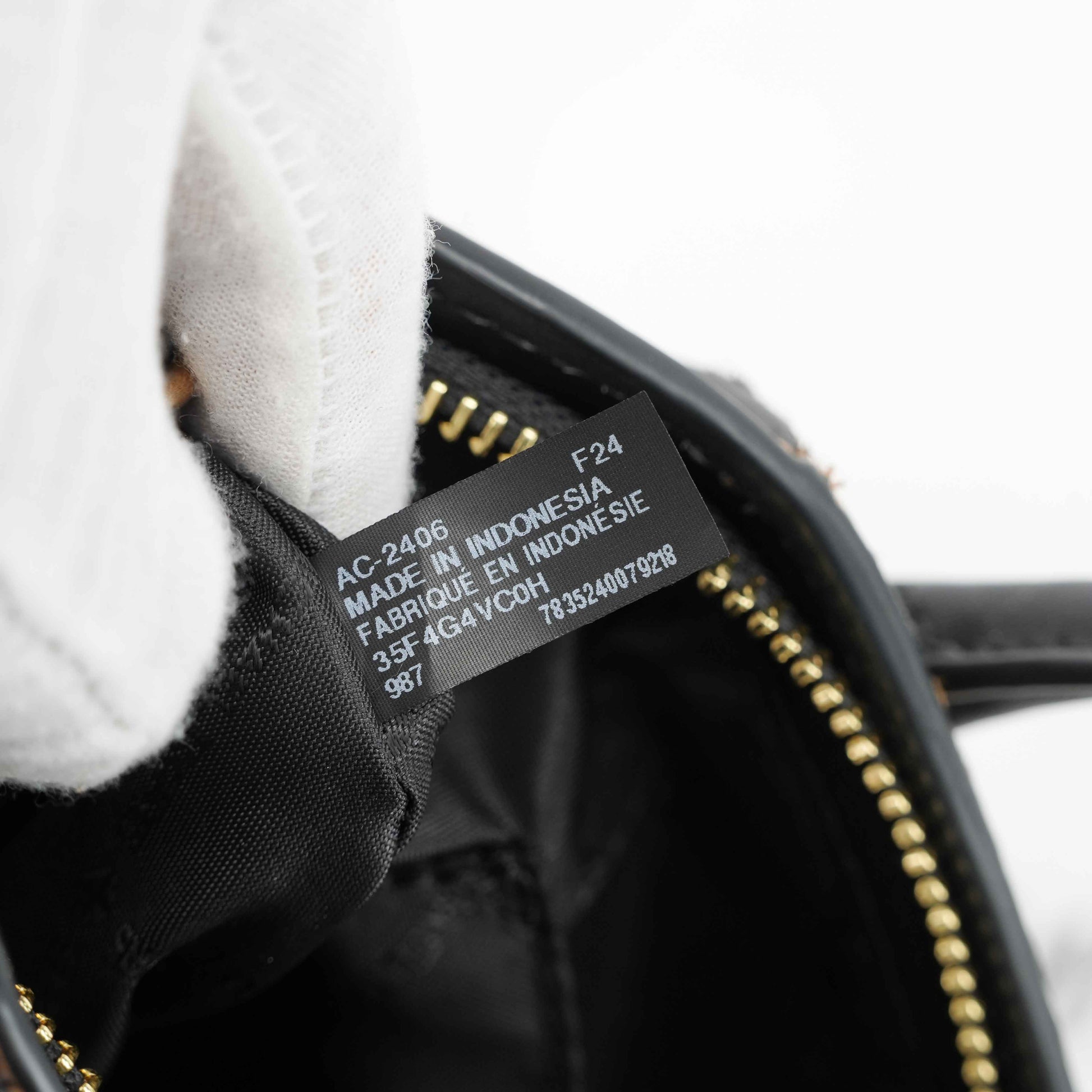 Interior: Black logo-printed fabric lining with zip pocket