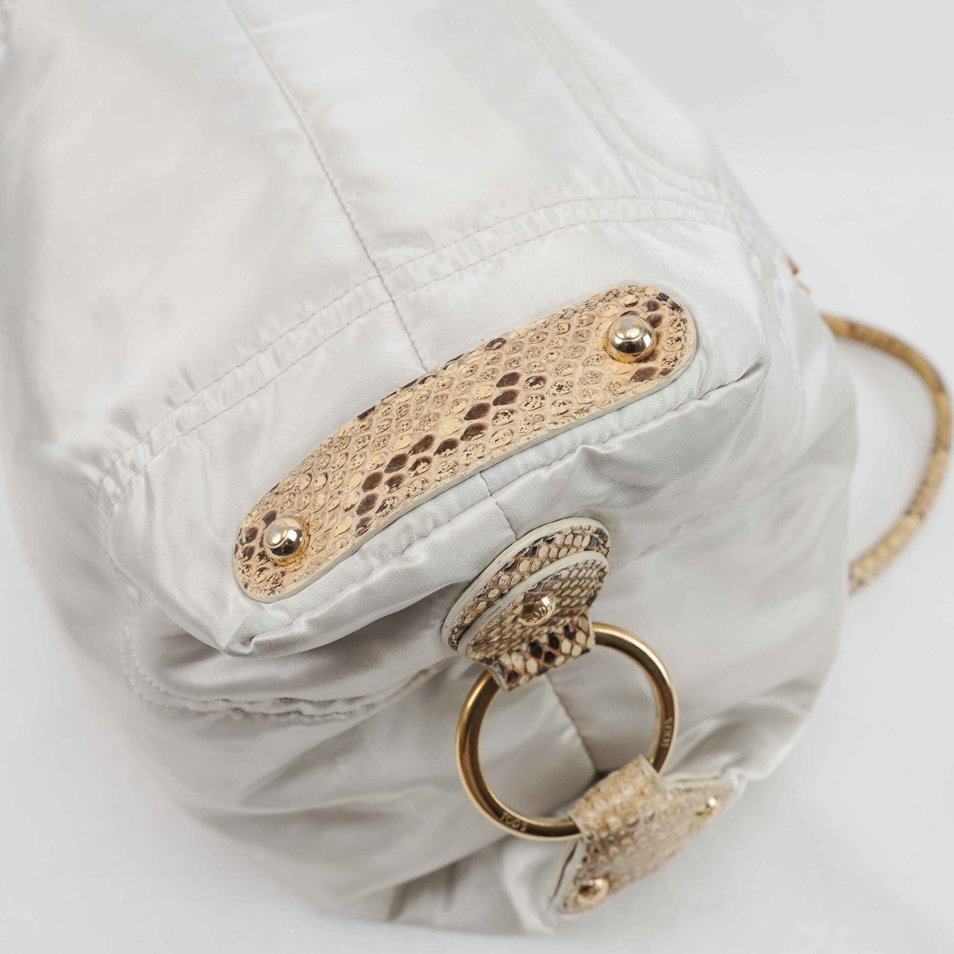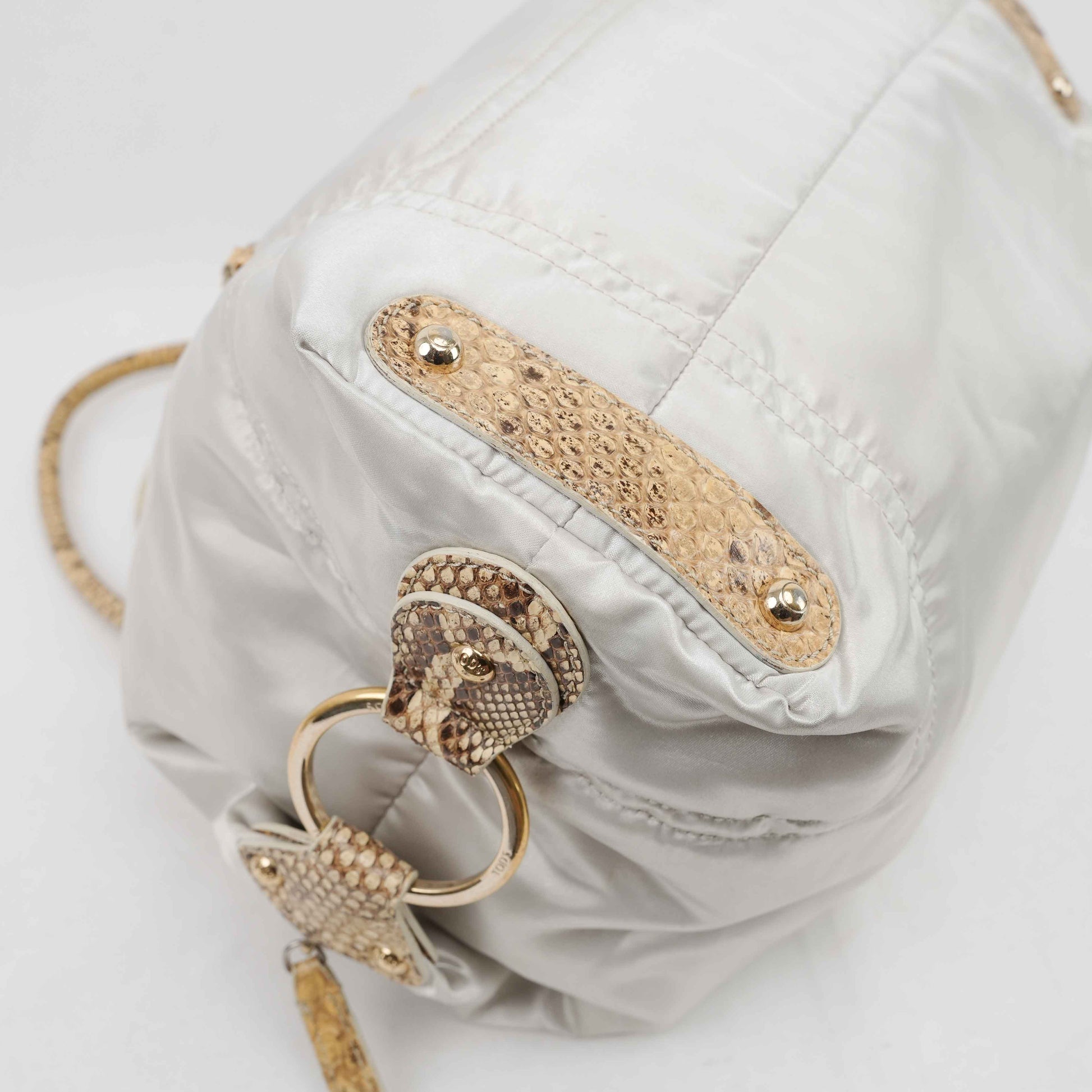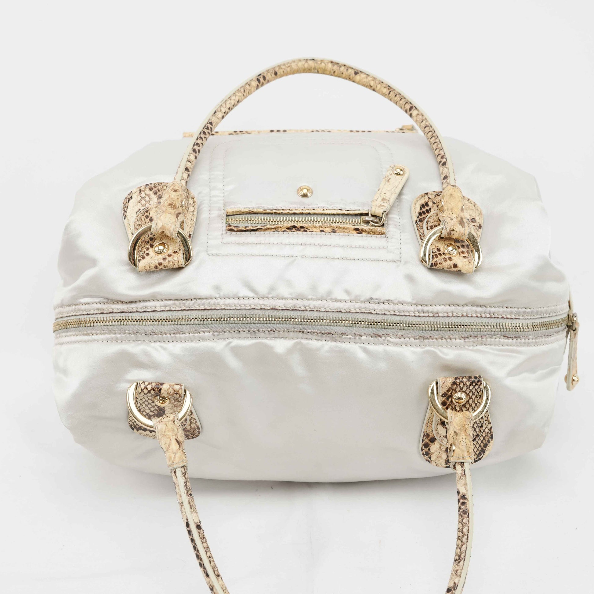Elegant and luxurious, this Tod’s handbag combines refined materials with sophisticated Italian craftsmanship. Crafted from lustrous white satin, it features genuine python leather details on the dual top handles, zip pulls, and trim, adding a touch of exotic charm. The gold-tone hardware complements the light tones beautifully, creating a chic, versatile piece suitable for both day and evening wear.