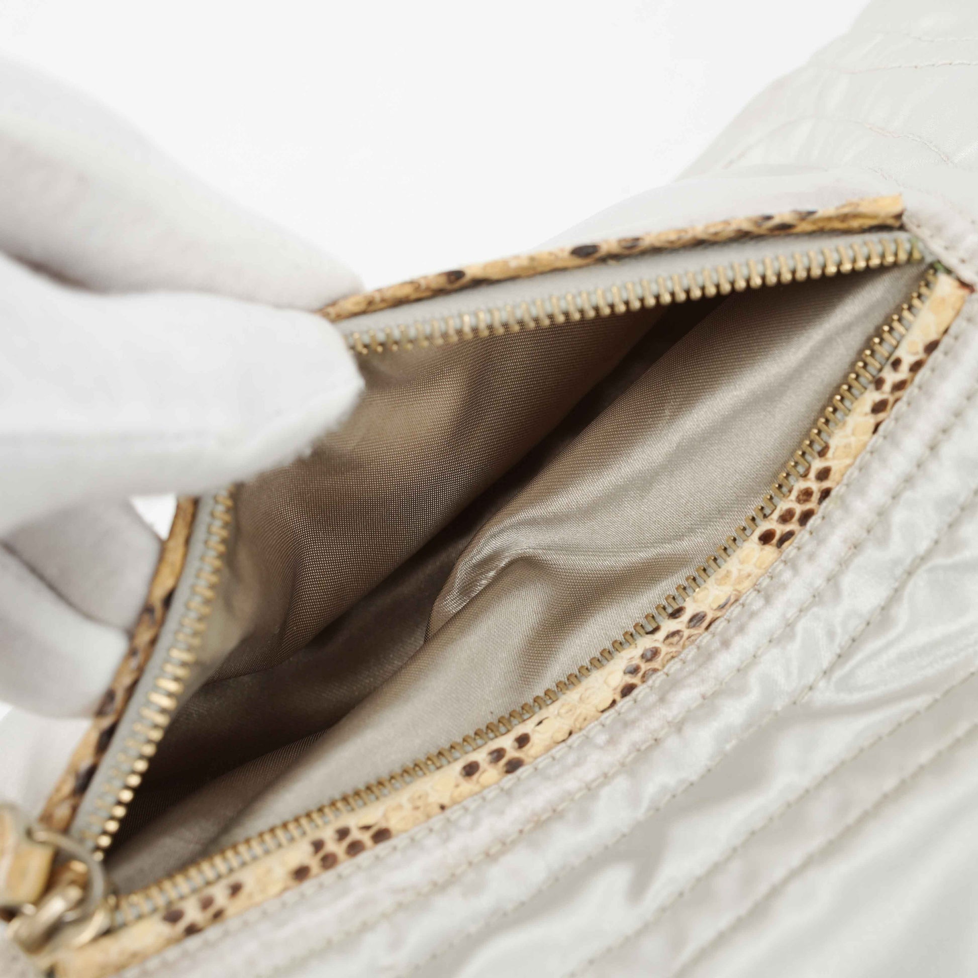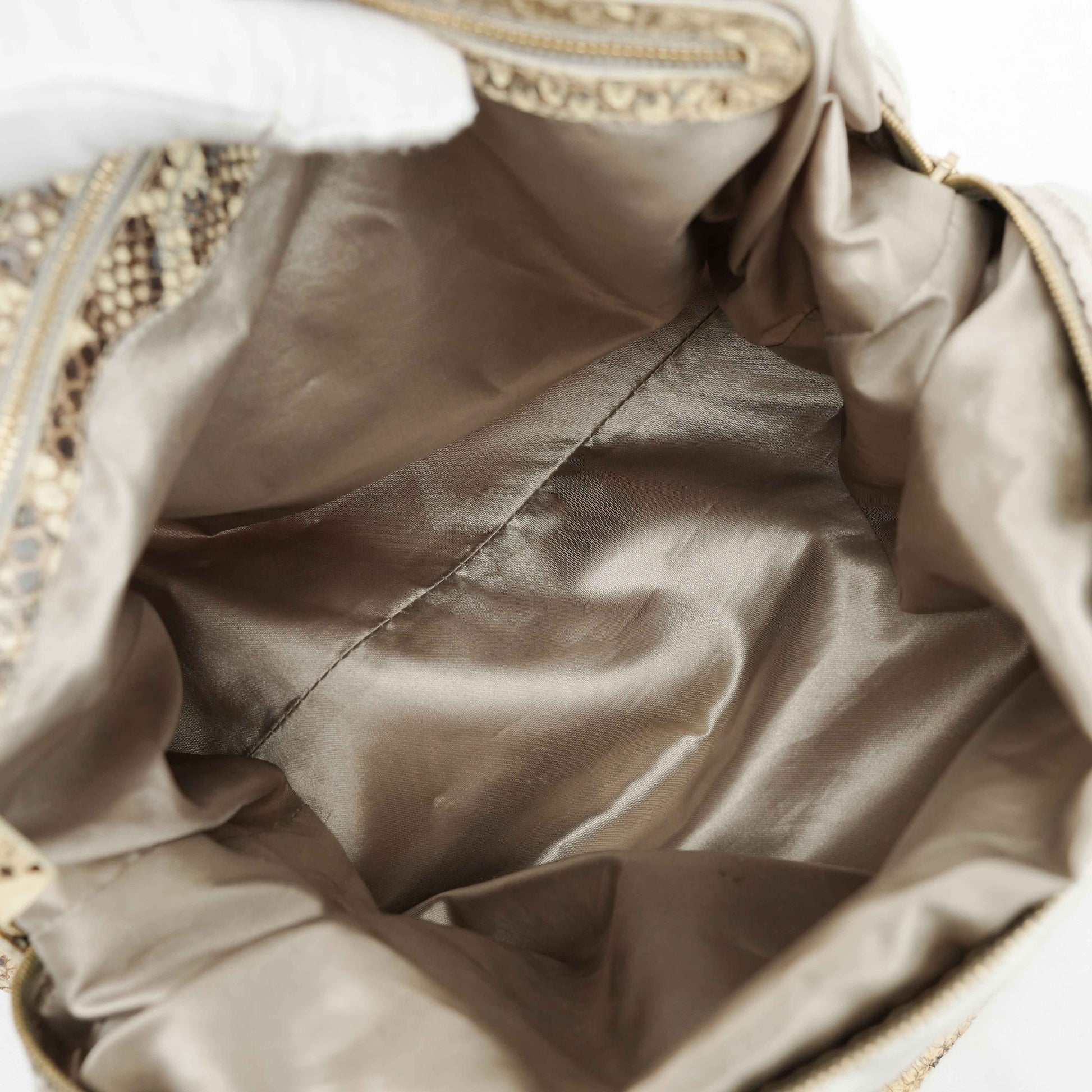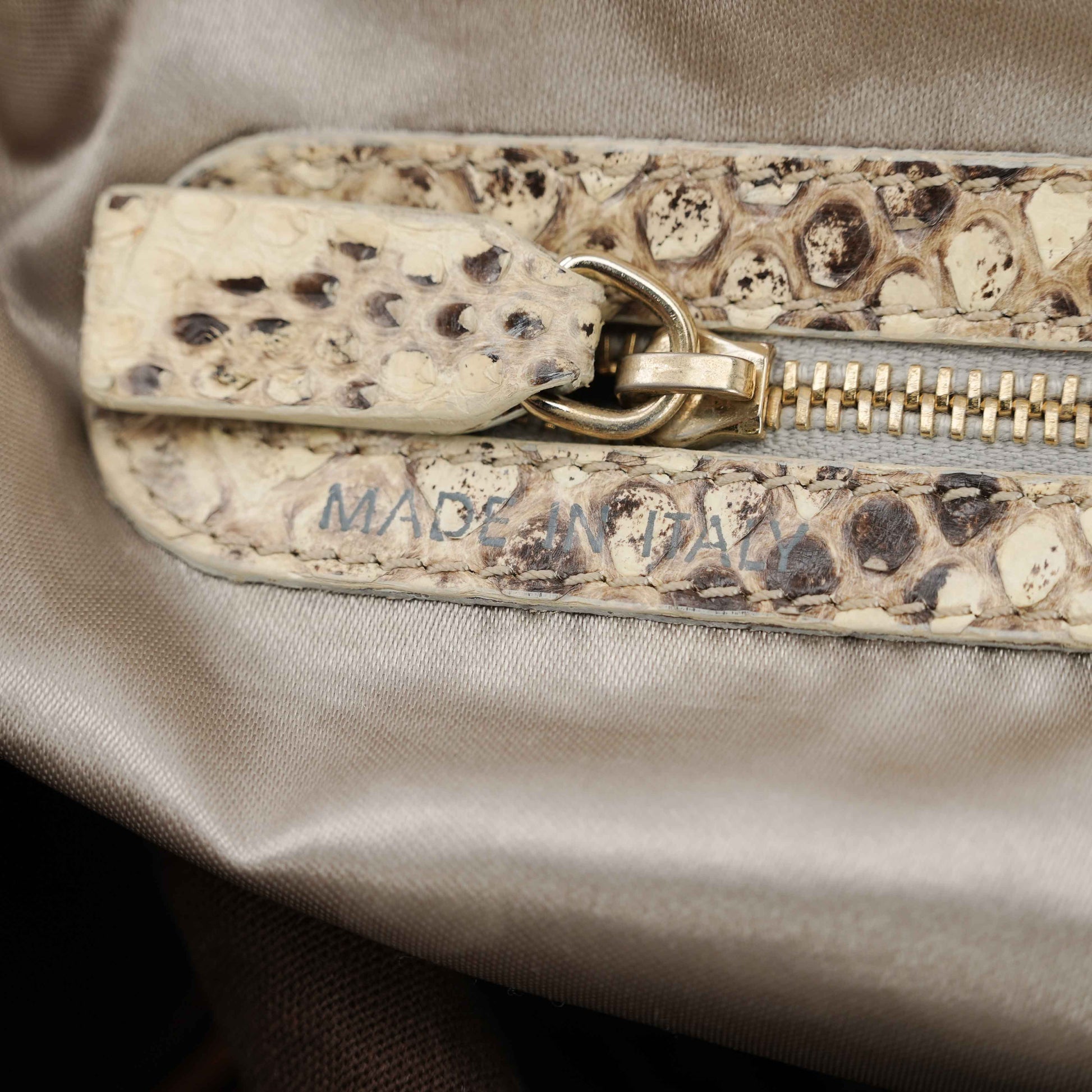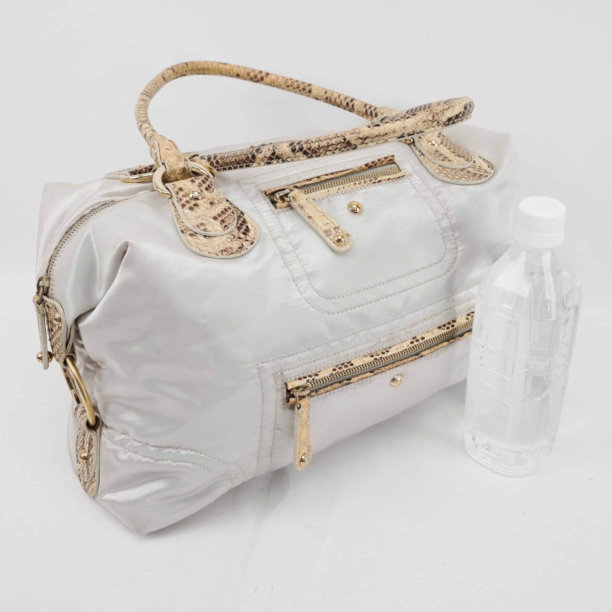 Elegant and luxurious, this Tod’s handbag combines refined materials with sophisticated Italian craftsmanship. Crafted from lustrous white satin, it features genuine python leather details on the dual top handles, zip pulls, and trim, adding a touch of exotic charm. The gold-tone hardware complements the light tones beautifully, creating a chic, versatile piece suitable for both day and evening wear.