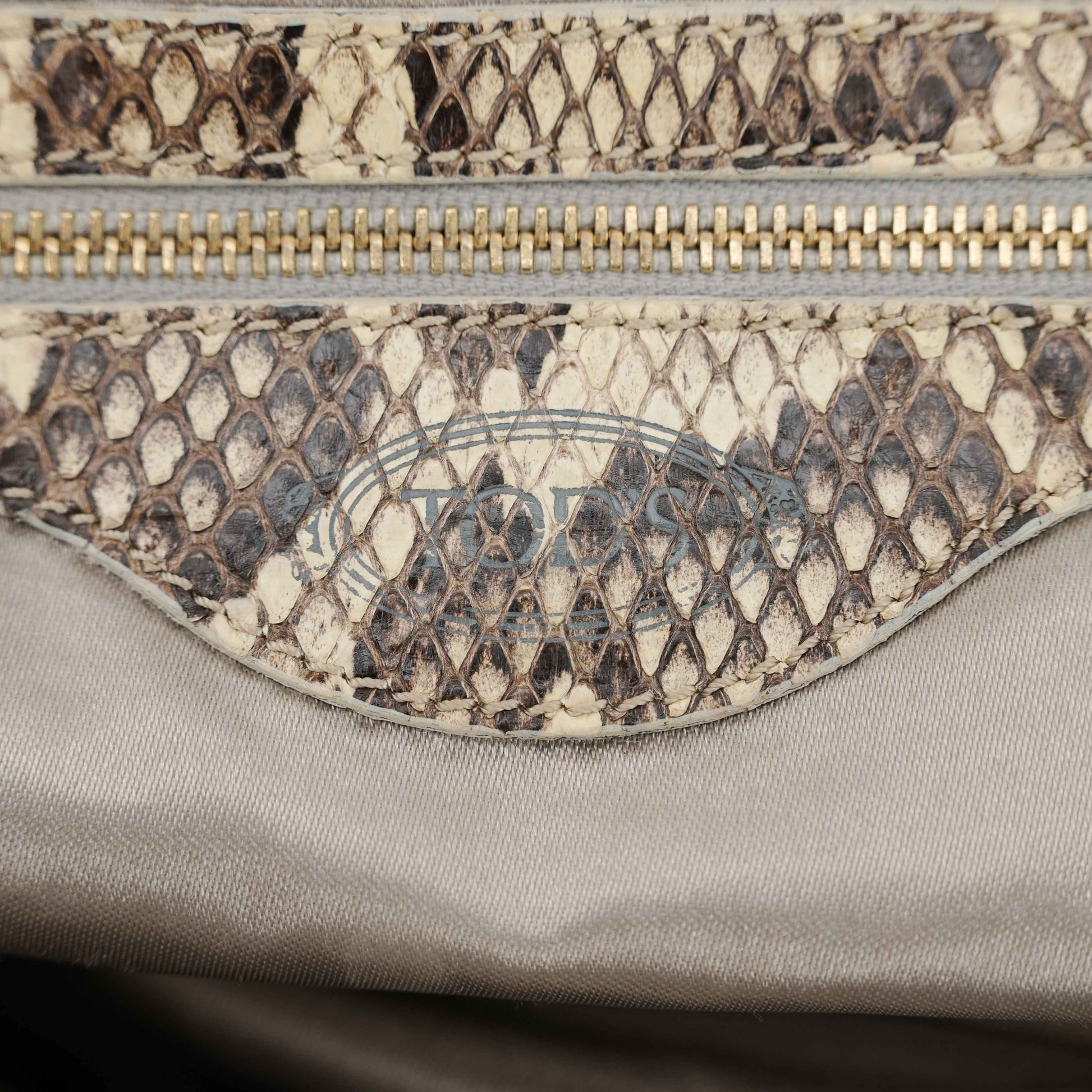 This TOD'S bag in good overall condition with minimal signs of use. The exterior snakeskin leather and satin canvas still looks good with no major marks. The corners are looking good with only slight rubbing, handles are still in good condition with just light, barely noticeable signs of use on the edges. The interior is in great condition and well kept. The metal hardware is shiny and looks clean.