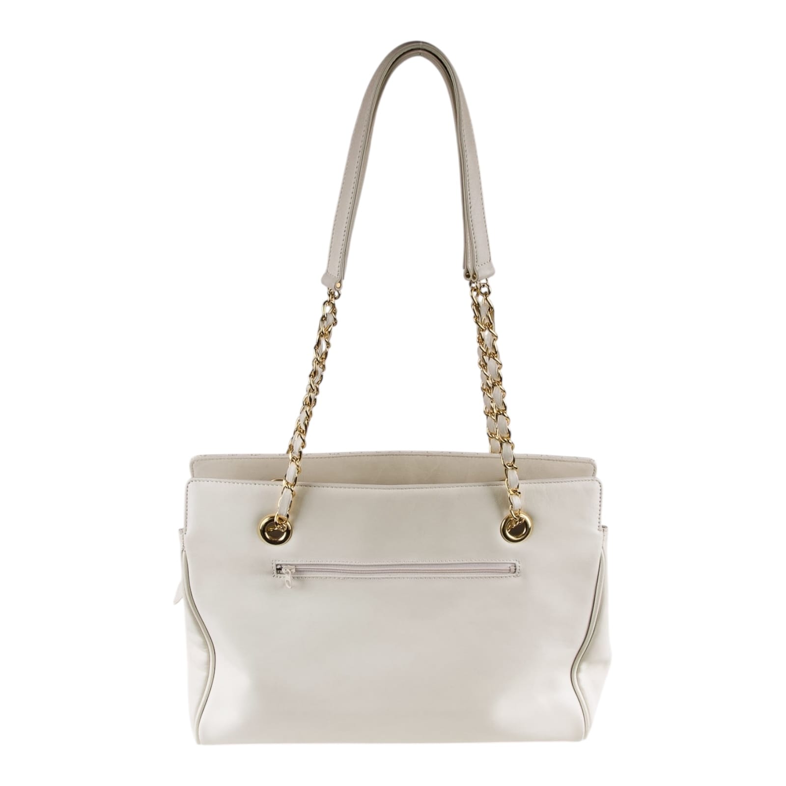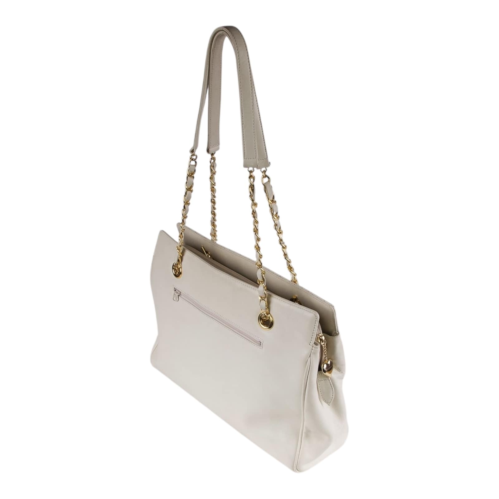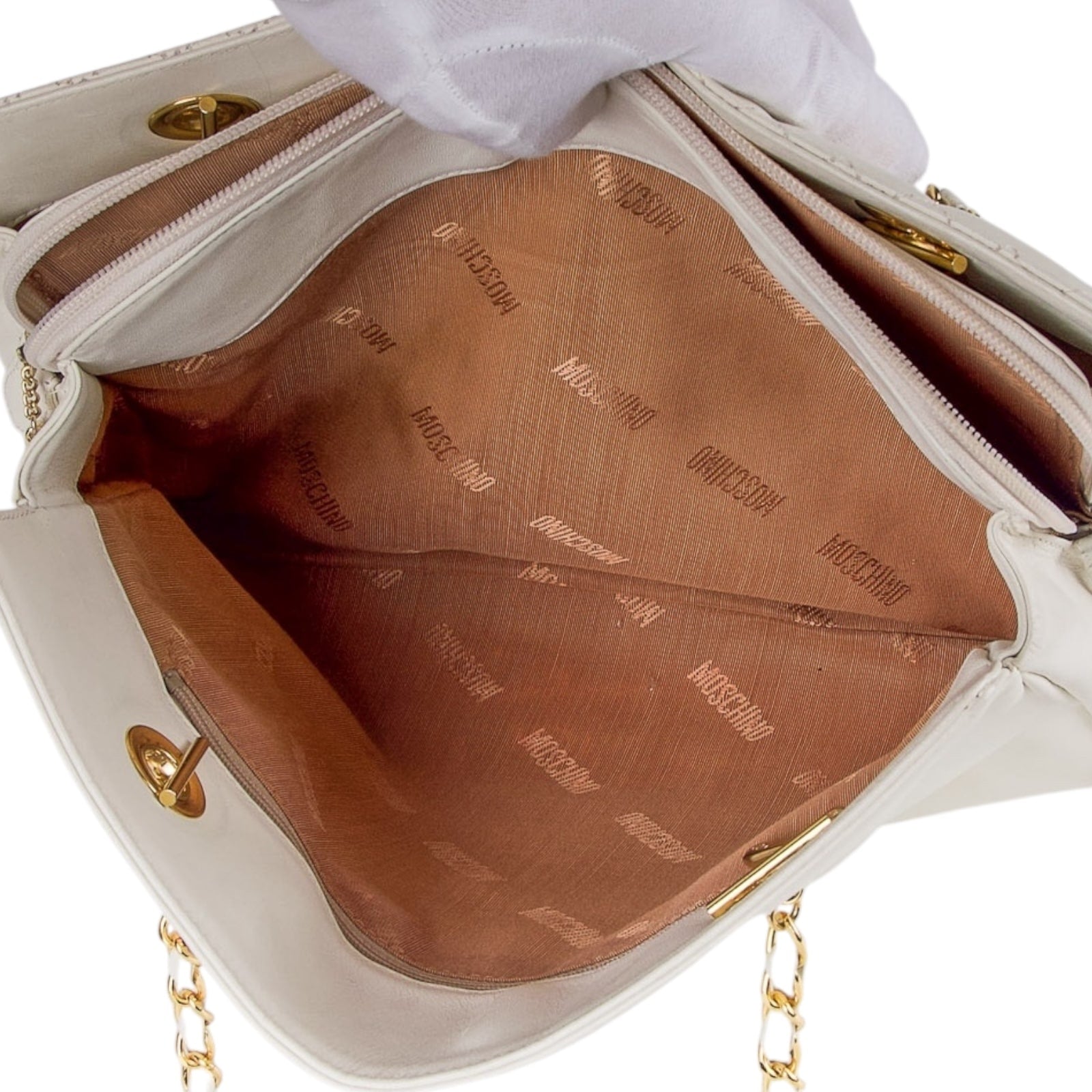 This Moschino cream white leather shoulder bag is in good pre-owned condition. The exterior cream white calfskin leather looks clean and is still in very good condition. The base and corners show minimal scuffs. The interior fabric lining is clean and has no unpleasant odor to it, however there are a few pen marks that can be seen in the images. The Gold tone chain strap is in good condition. Please check the photos for better details.